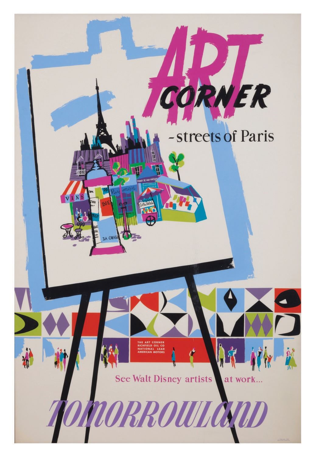 (Disneyland, 1956) A very rare hand-silkscreened poster for the Art Corner in Tomorrowland. Designed by Bjorn Aronson, the poster promoted the Walt-era merchandise location where Guests emerged onto the Streets of Paris for an imaginary trip to a Parisian art colony. For more than a decade (from 1955 to 1966), the popular shop offered art supplies, character model guides, and Walt Disney Originals. Measuring 36"x54", the Disneyland attraction poster displays in very good condition with few small scuffs and minor surface wear.