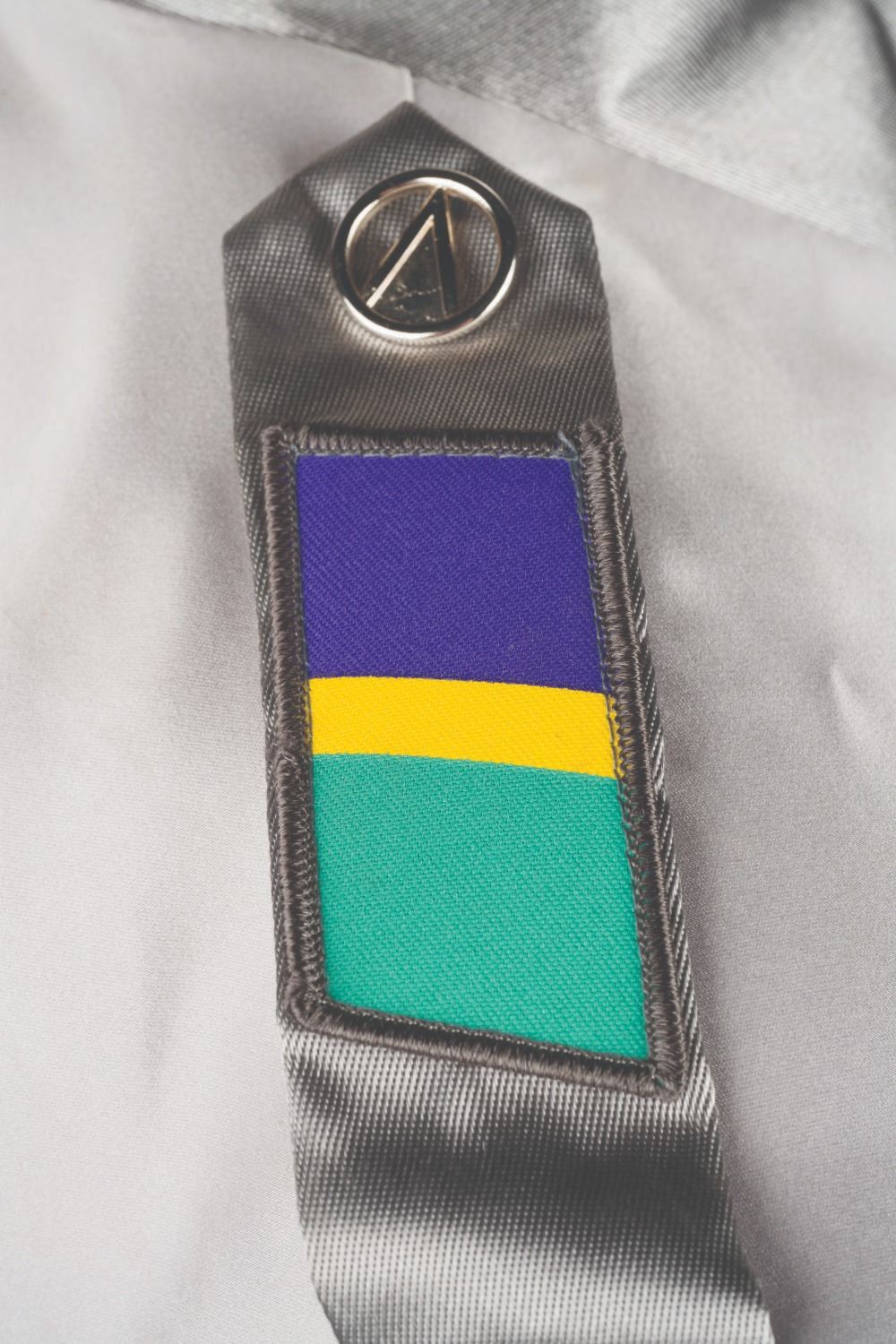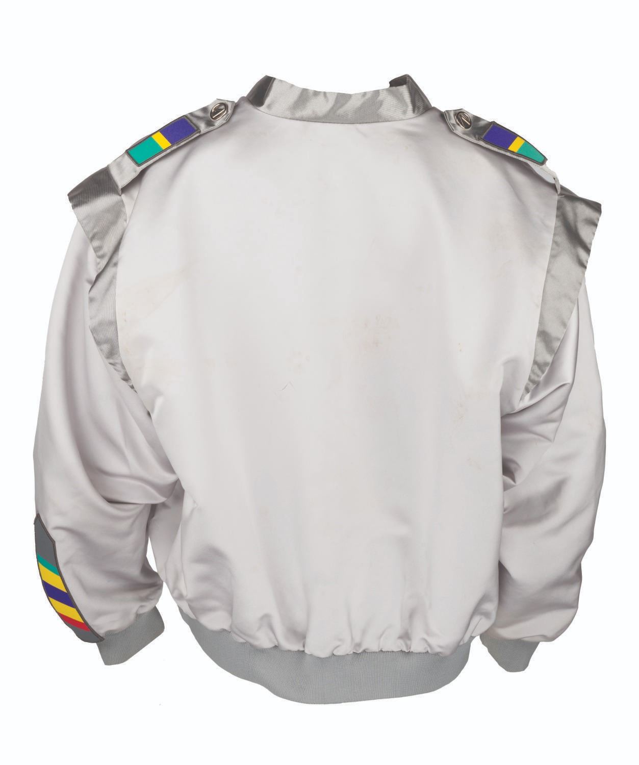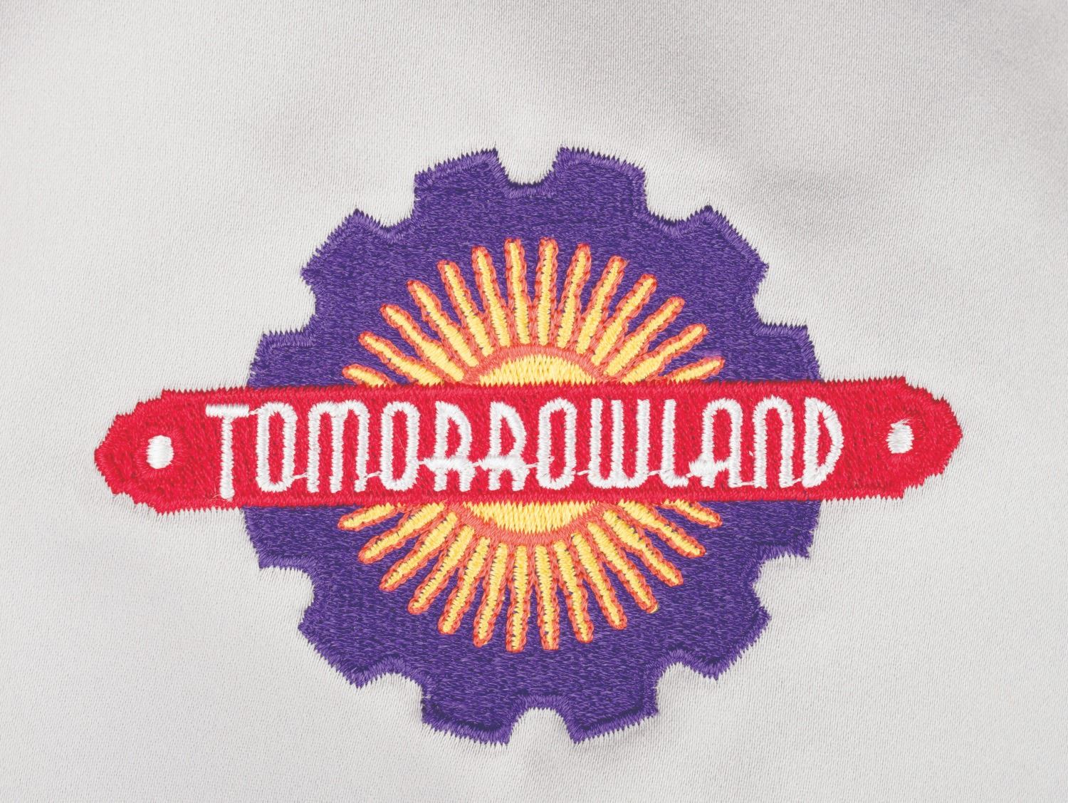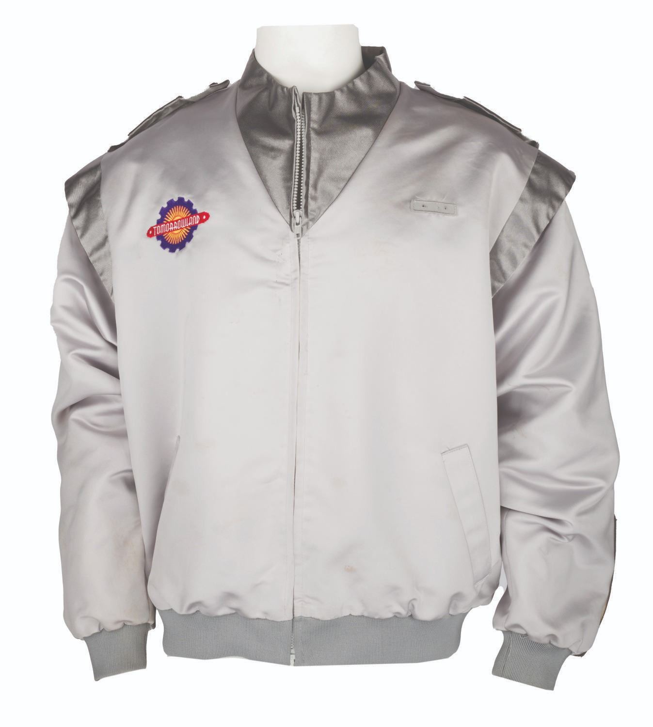 (Walt Disney World, 2000s) A shimmering jacket worn by Tomorrowland Attractions Hosts at the Magic Kingdom. The jacket measures a size "XL," and is in very good condition exhibiting light wear from Cast use.