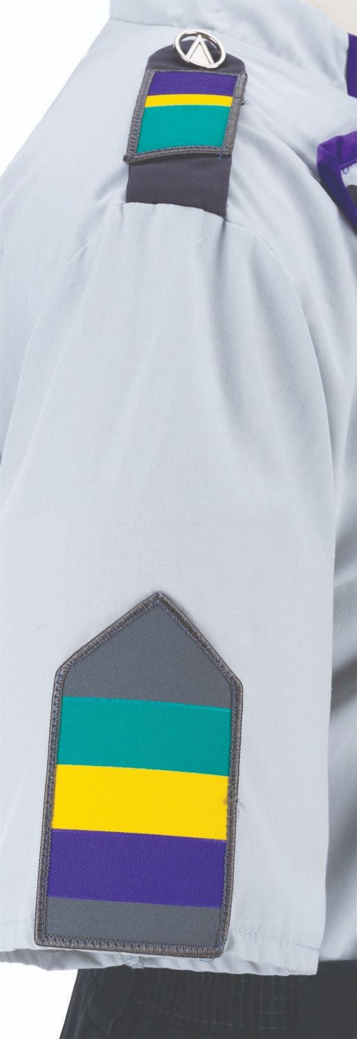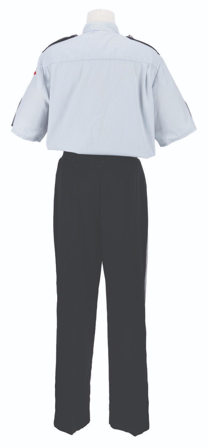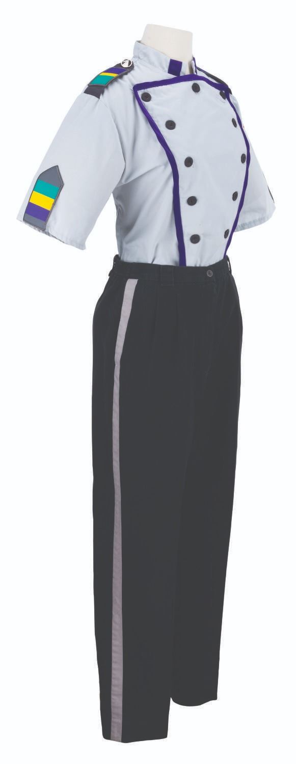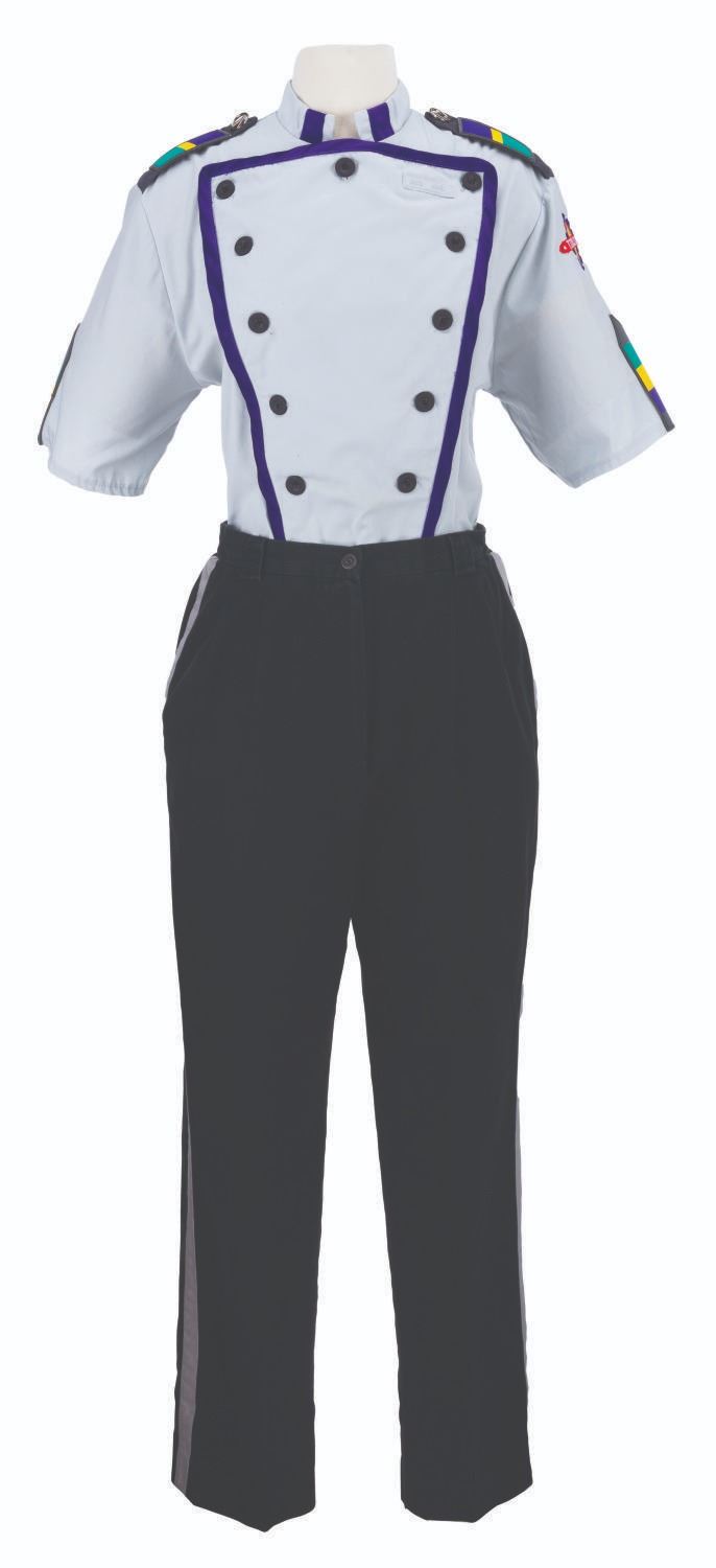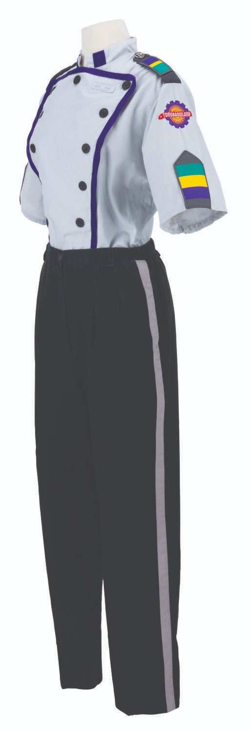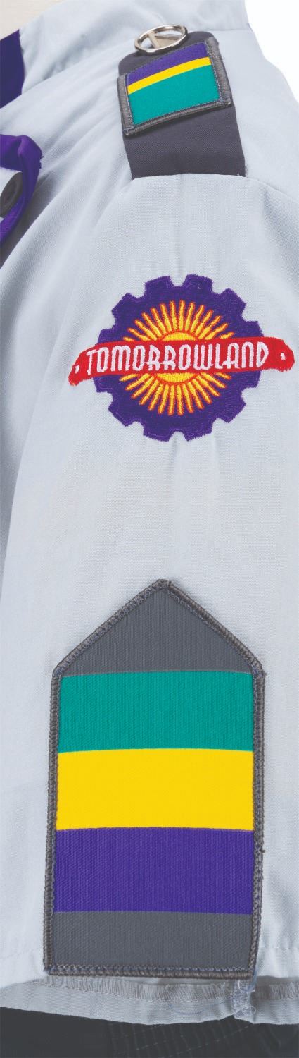 (Walt Disney World, 1990s-2000s) A uniform shirt and pants worn by Cast Members working food service in Tomorrowland at the Magic Kingdom. Labeled a size 12, the costume is in good to very good condition with stains, discoloration from age, and wear from Park use.