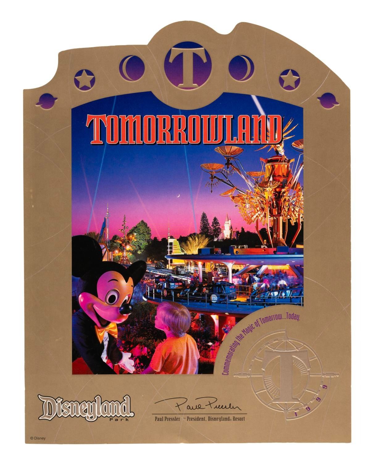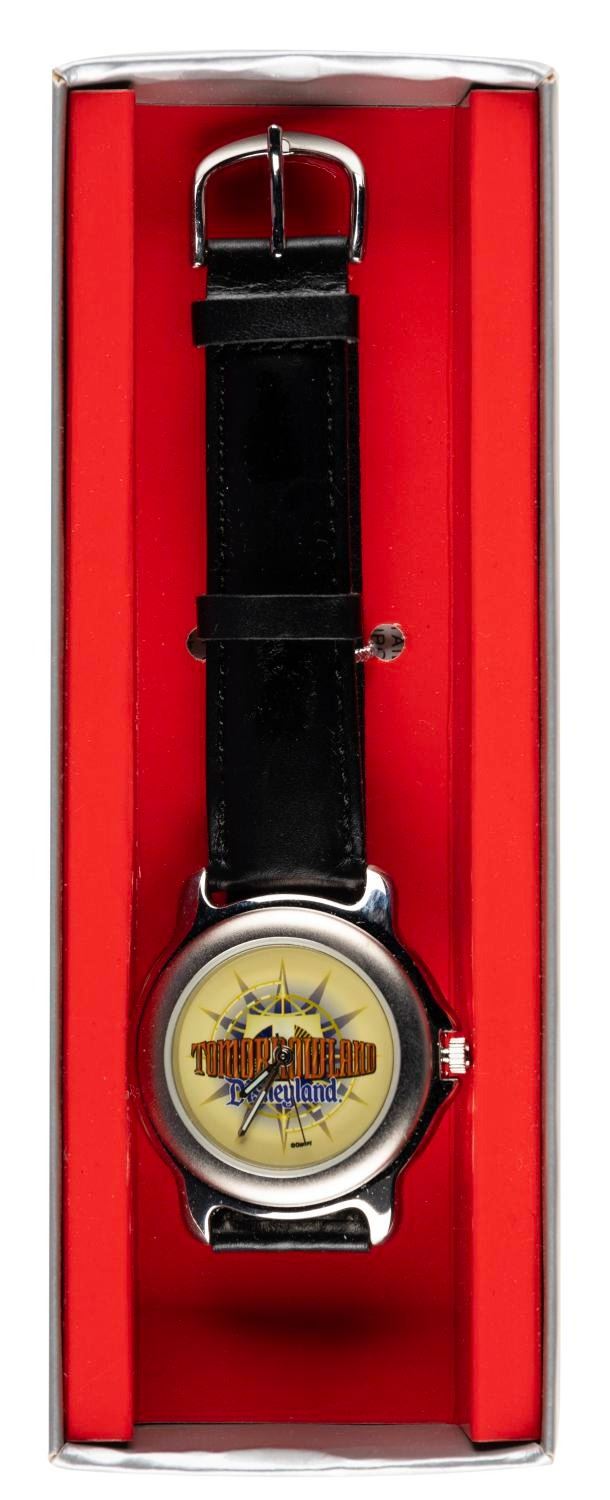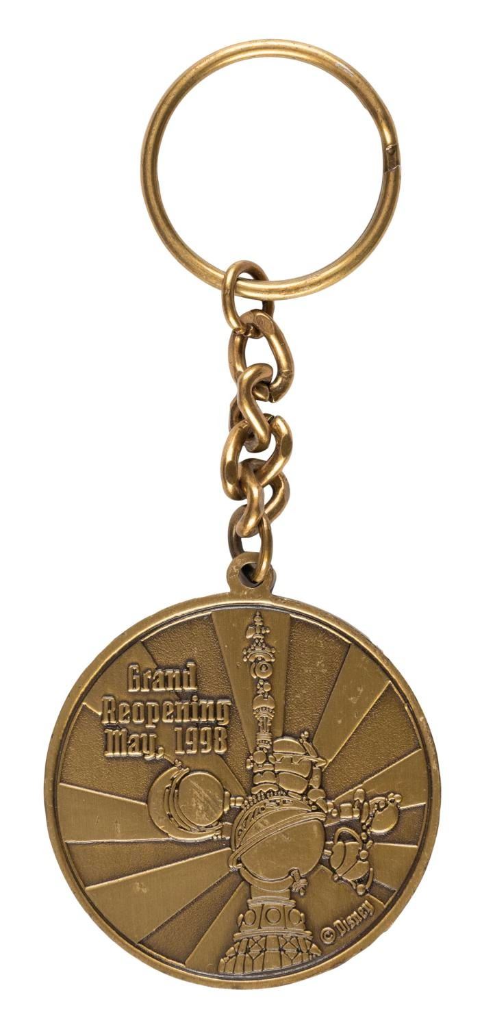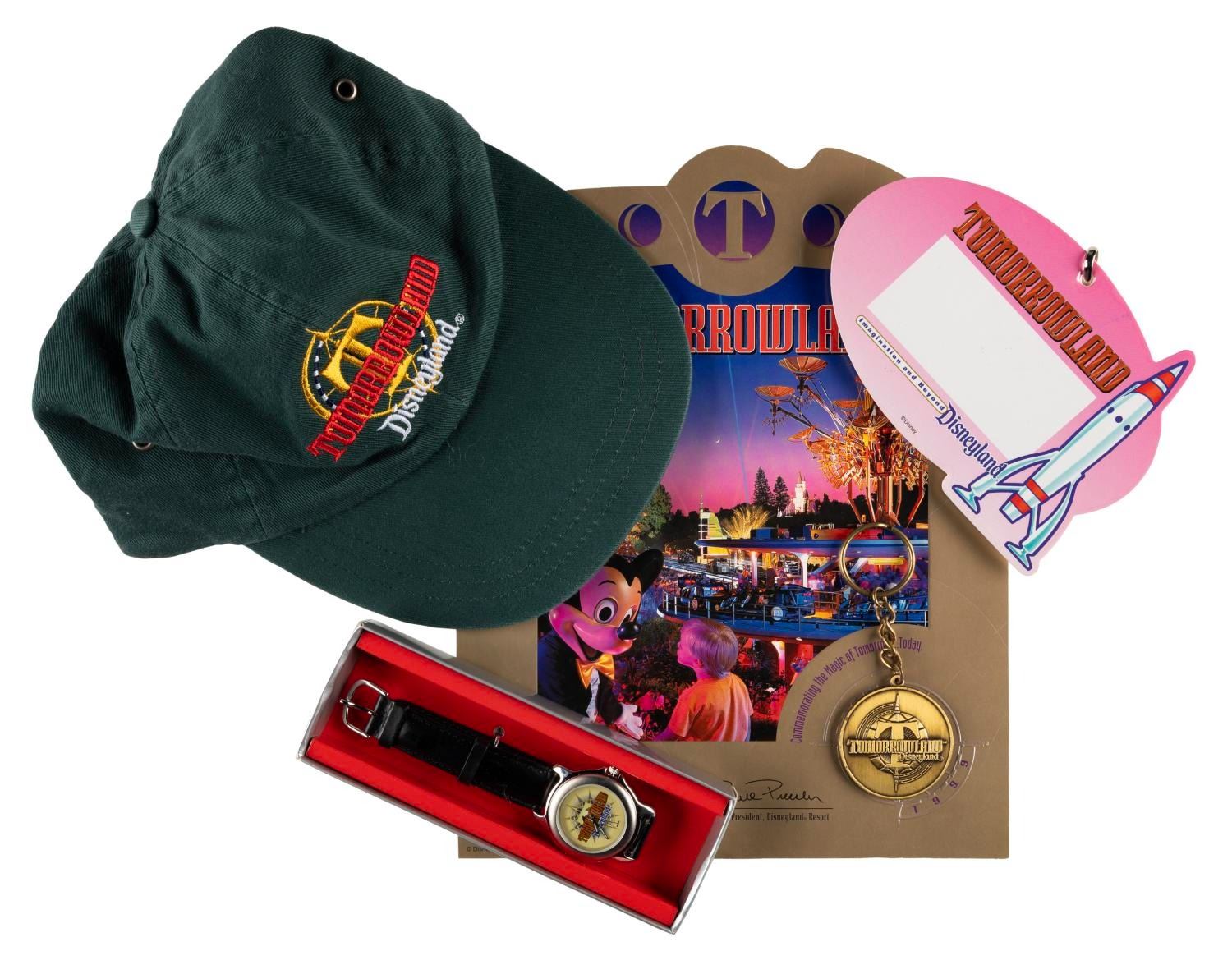 (Disneyland, 1998) A collection of souvenirs from Tomorrowland's Grand Re-Opening. Included are a hat, keychain, badge with lanyard, commemorative certificate, and a wristwatch. The hat is adjustable, the badge is 6"x4" on a 34" lanyard, the keychain is 1.75" in diameter, the watch 1.5" in diameter on a 9.25" band, and the certificate is 8.5"x11". Each piece is in very good condition exhibiting minor wear.
