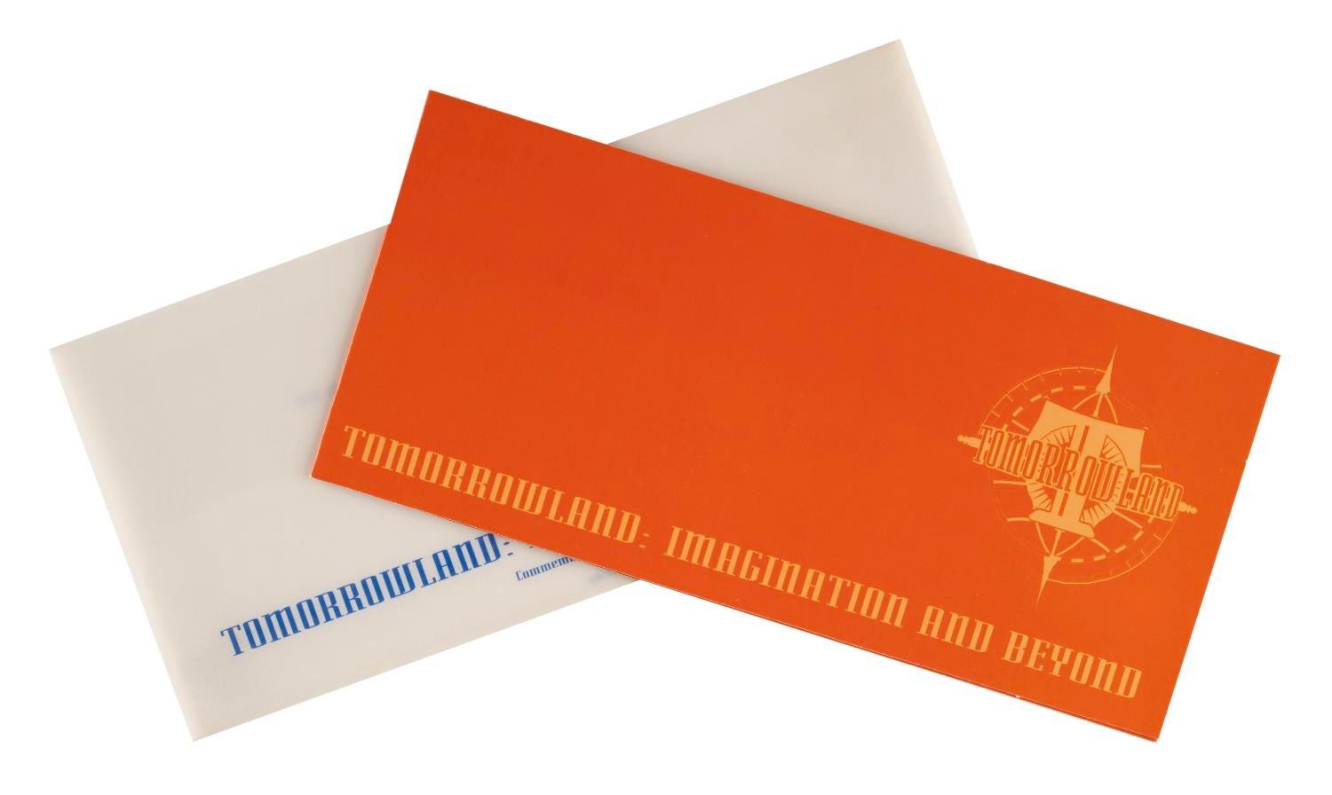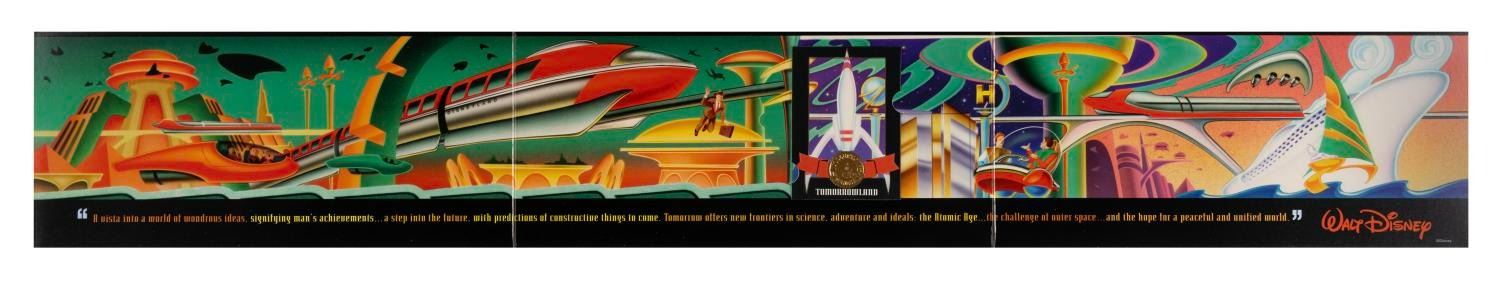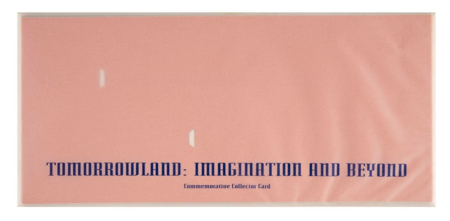 (Disneyland, 1999) A Disneyland Commemorative Collector Card titled "Tomorrowland: Imagination and Beyond." Part of the Disneyland Collectors' Series II, this limited edition trading card depicts a stylized Moonliner rocket and is numbered 1141 of 5000. The 2.5"x3.5" card is presented in a beautiful gatefold cardstock display featuring art from Imagineer Joe Spencer's Tomorrowland Pavillion mural. This item measures 5"x33" and is still in its original envelope. Both the card and gatefold display are in fine condition, with one .5" scuff to the card from the gatefold holder itself.