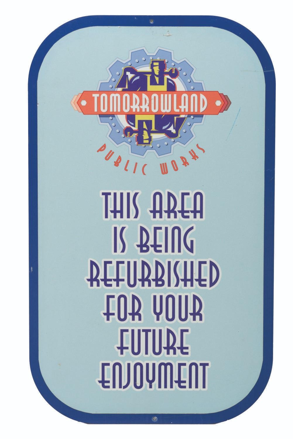 (Walt Disney World, 1990s-2000s) A large refurbishment sign from Tomorrowland in the Magic Kingdom. Measuring 18" x 30", the PVC board sign is in good condition with heavy scratches, scuffs, stains, intentional holes, and wear from Park use.