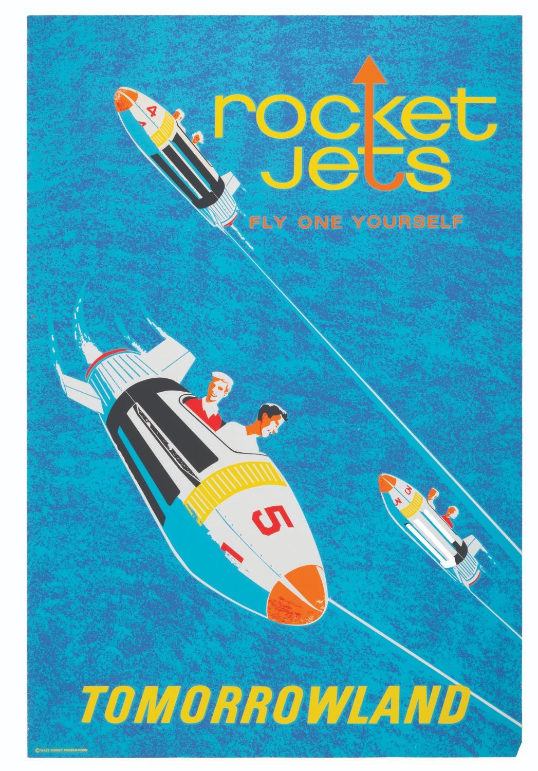 (Disneyland, 1967) An original hand-silkscreened attraction poster for the Rocket Jets in Tomorrowland. The poster was designed by Ken Chapman and borrows heavily from Bjorn Aronson's "Astrojets" poster design, which this attraction replaced in 1967. Measuring 36" x 54", the poster displays in very good condition with some edge wear, small creases only visible upon close inspection in the bottom left corner, and a 0.5" x 1" tear of the bottom right corner.