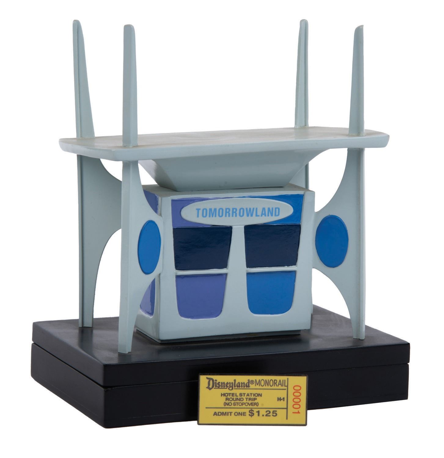 (Disneyland, 2005) A limited edition miniature Tomorrowland Ticket Booth created in celebration of the 50th anniversary of Disneyland. The intricately detailed miniature Tomorrowland Ticket Booth was designed by Kevin Kidney and Jody Daily, sculpted by Kevin Kidney, and manufactured in an edition of 1,500 pieces. The lid of the base can be removed to reveal a special pin inspired by Disneyland Monorail Admission Media Ticket Coupon. The resin and wood box measures 6.75" tall and 6"x4" while the pin is .75"x2", each is in fine condition with little wear and COA.