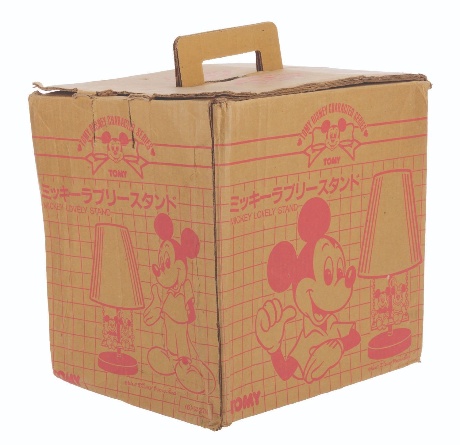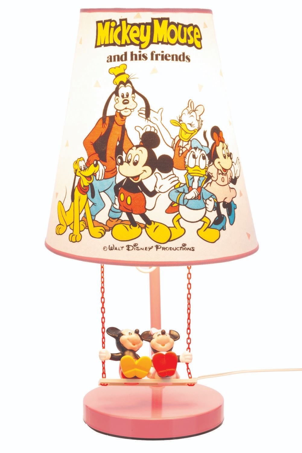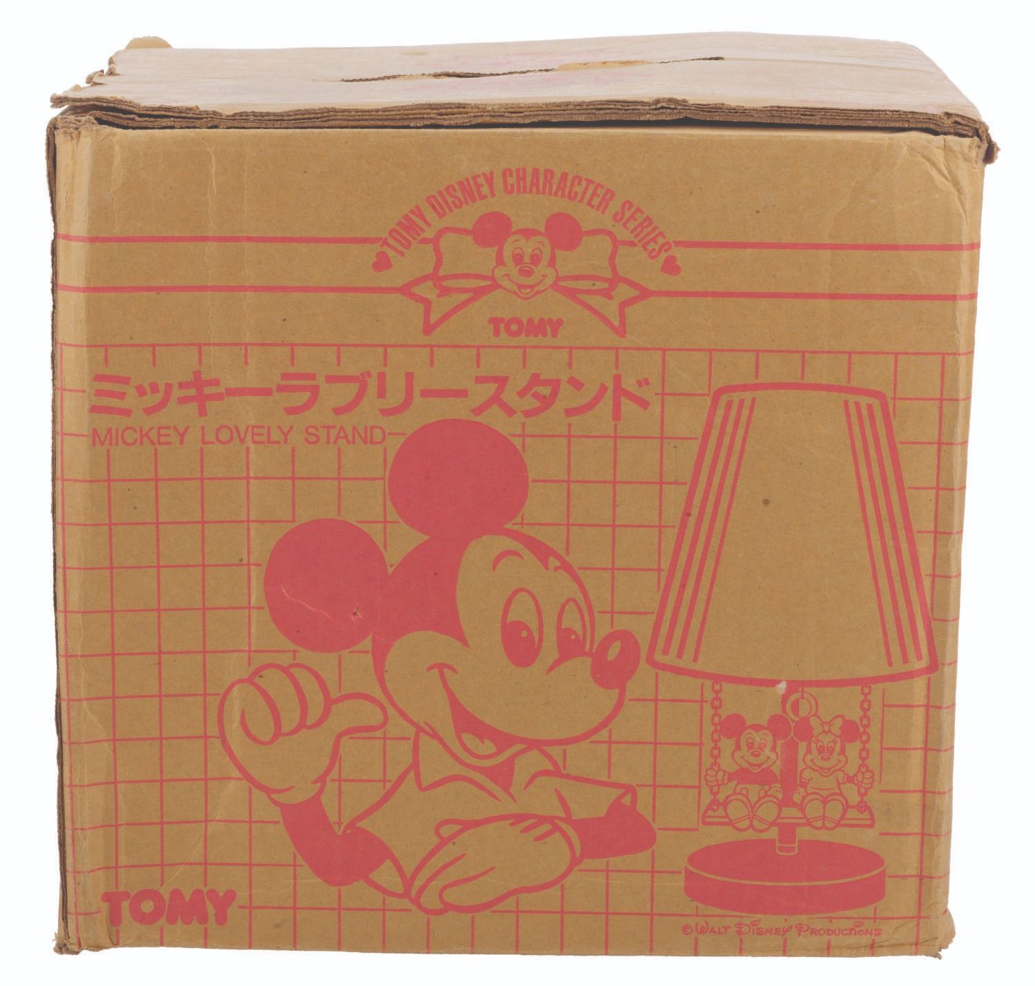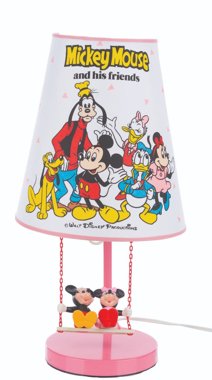 (Tomy, 1970s-80s) A table lamp featuring Mickey and other Disney characters in its original box. The lampshade features Mickey and his friends, and the lamp base has a 3D Mickey and Minnie sitting on a swing, which is used to turn the light on. The lamp is unused, and the box includes the original light bulbs and instructions. The lamp stands 17.5" tall and is in fine working condition. The 11.25" x 12" x 10" box is in good condition, with some crushing to the sides and wear from storage and age.