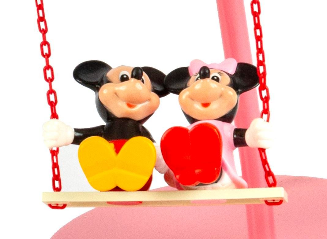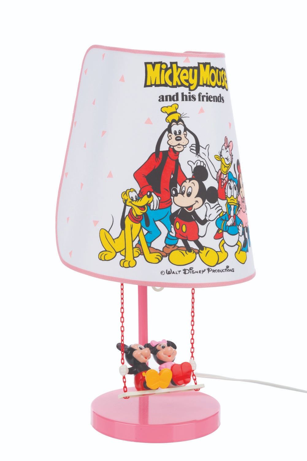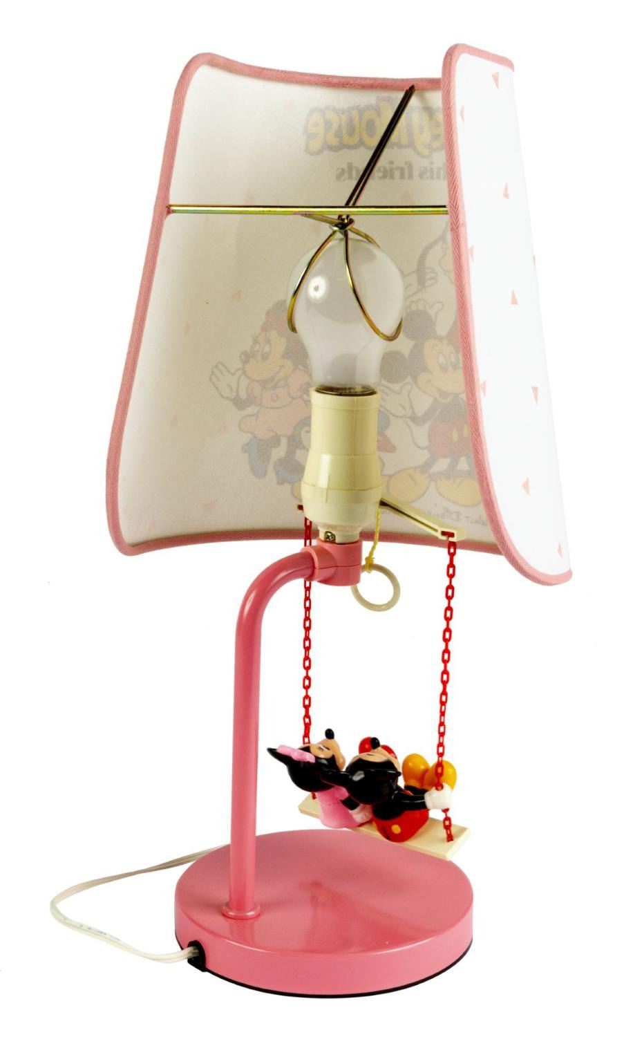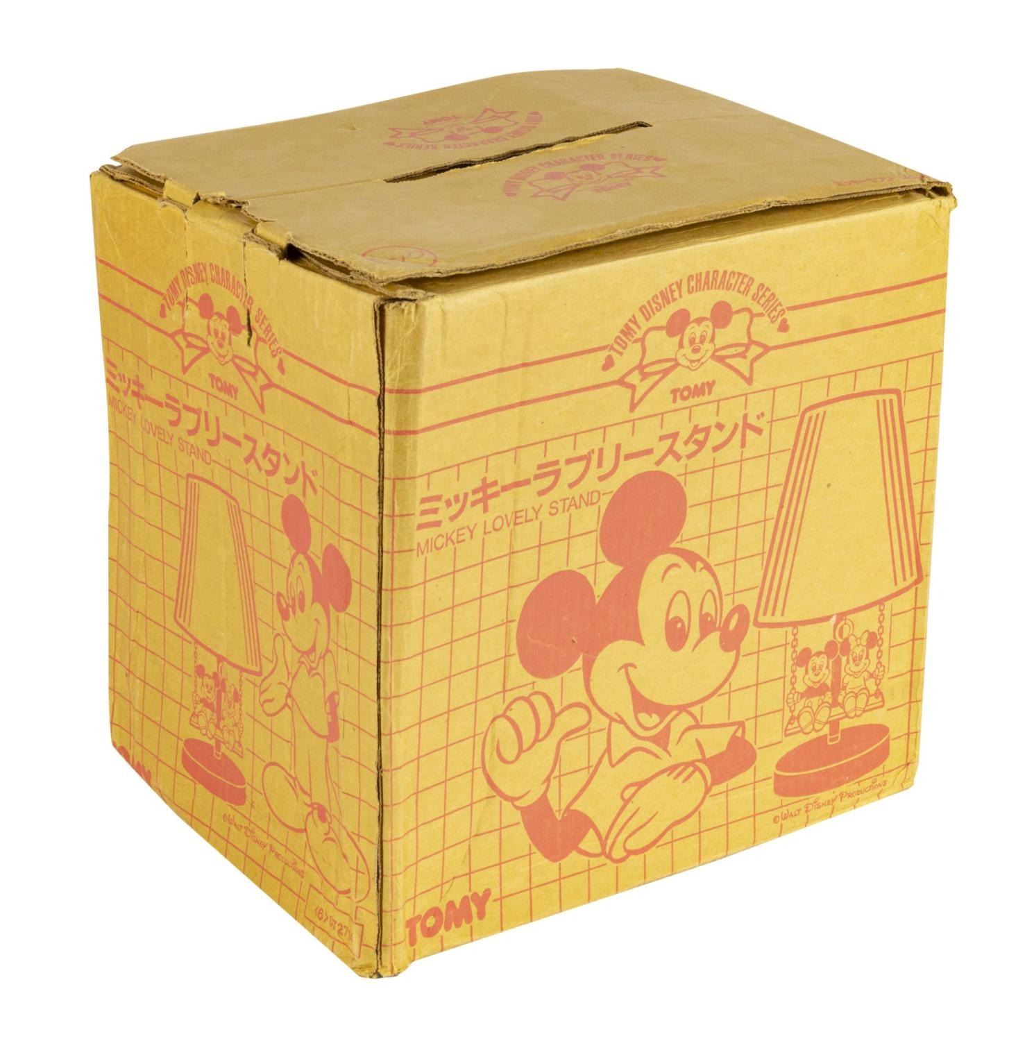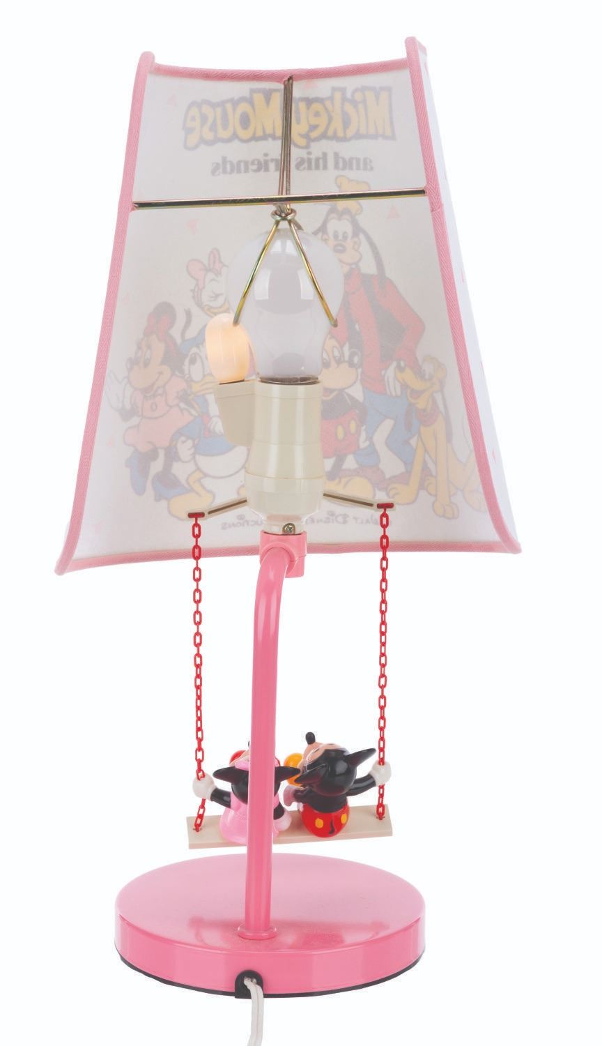 (Tomy, 1970s-80s) A table lamp featuring Mickey and other Disney characters in its original box. The lampshade features Mickey and his friends, and the lamp base has a 3D Mickey and Minnie sitting on a swing, which is used to turn the light on. The lamp is unused, and the box includes the original light bulbs and instructions. The lamp stands 17.5" tall and is in fine working condition. The 11.25" x 12" x 10" box is in good condition, with some crushing to the sides and wear from storage and age.