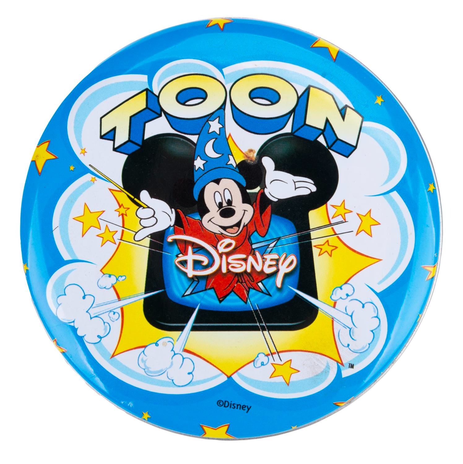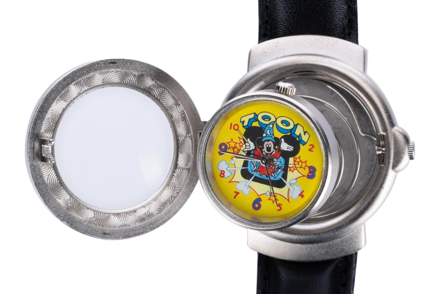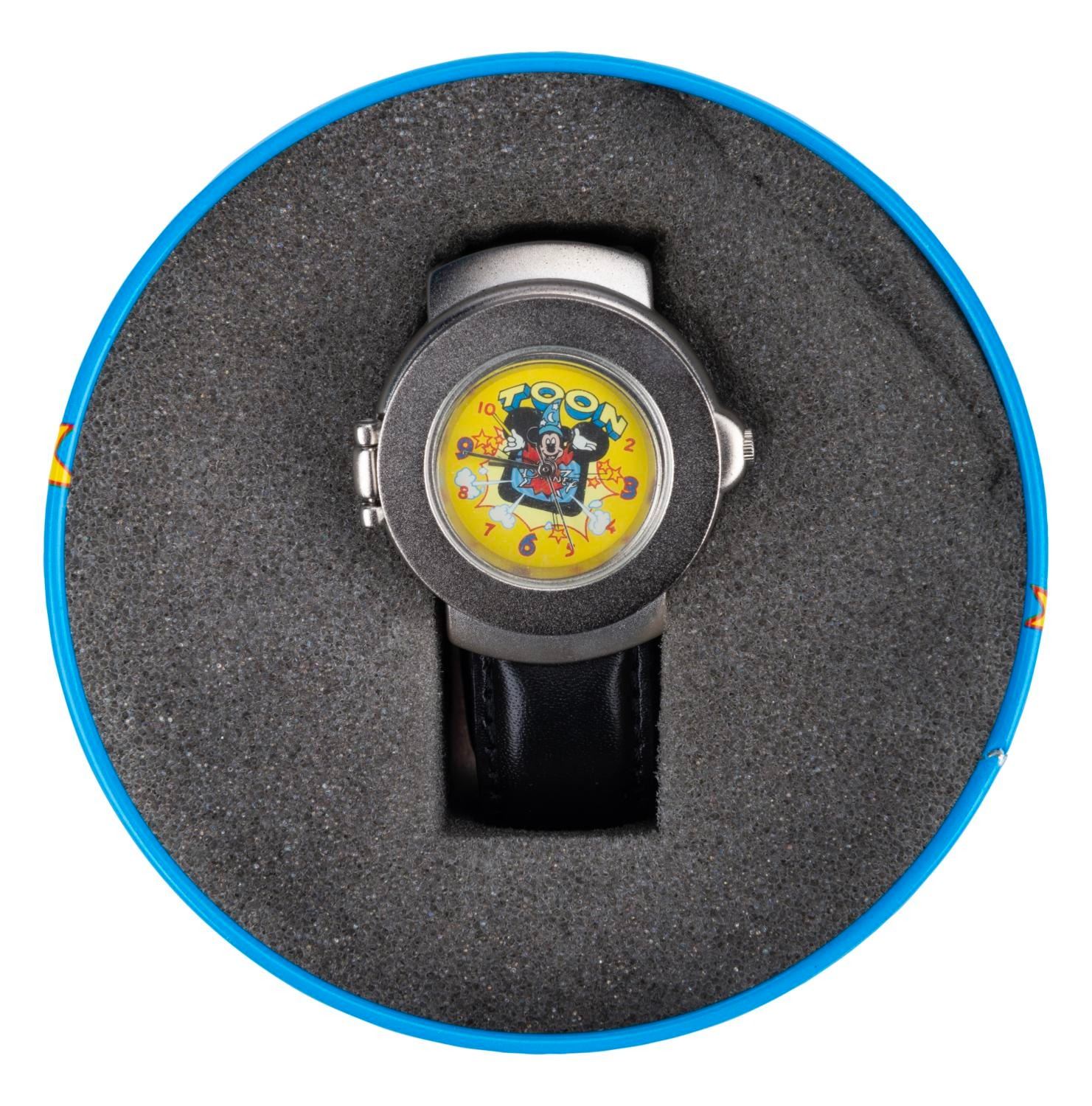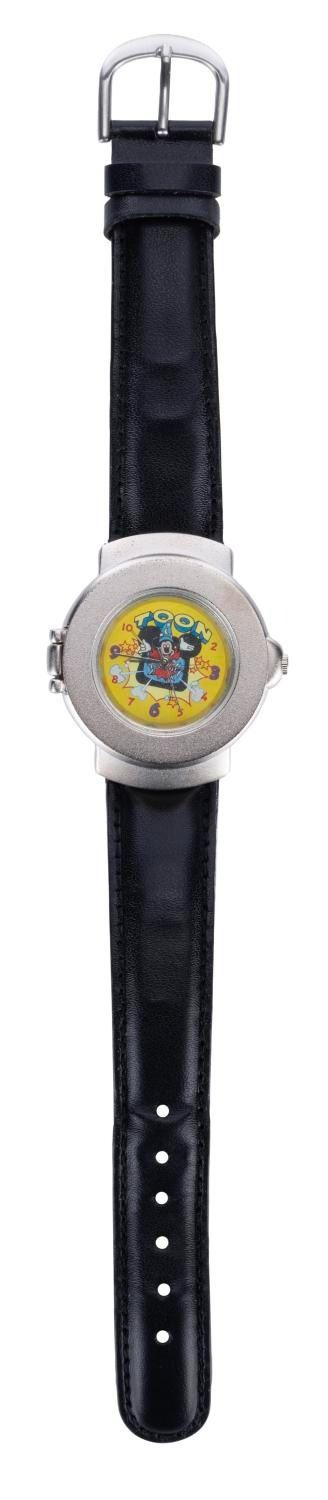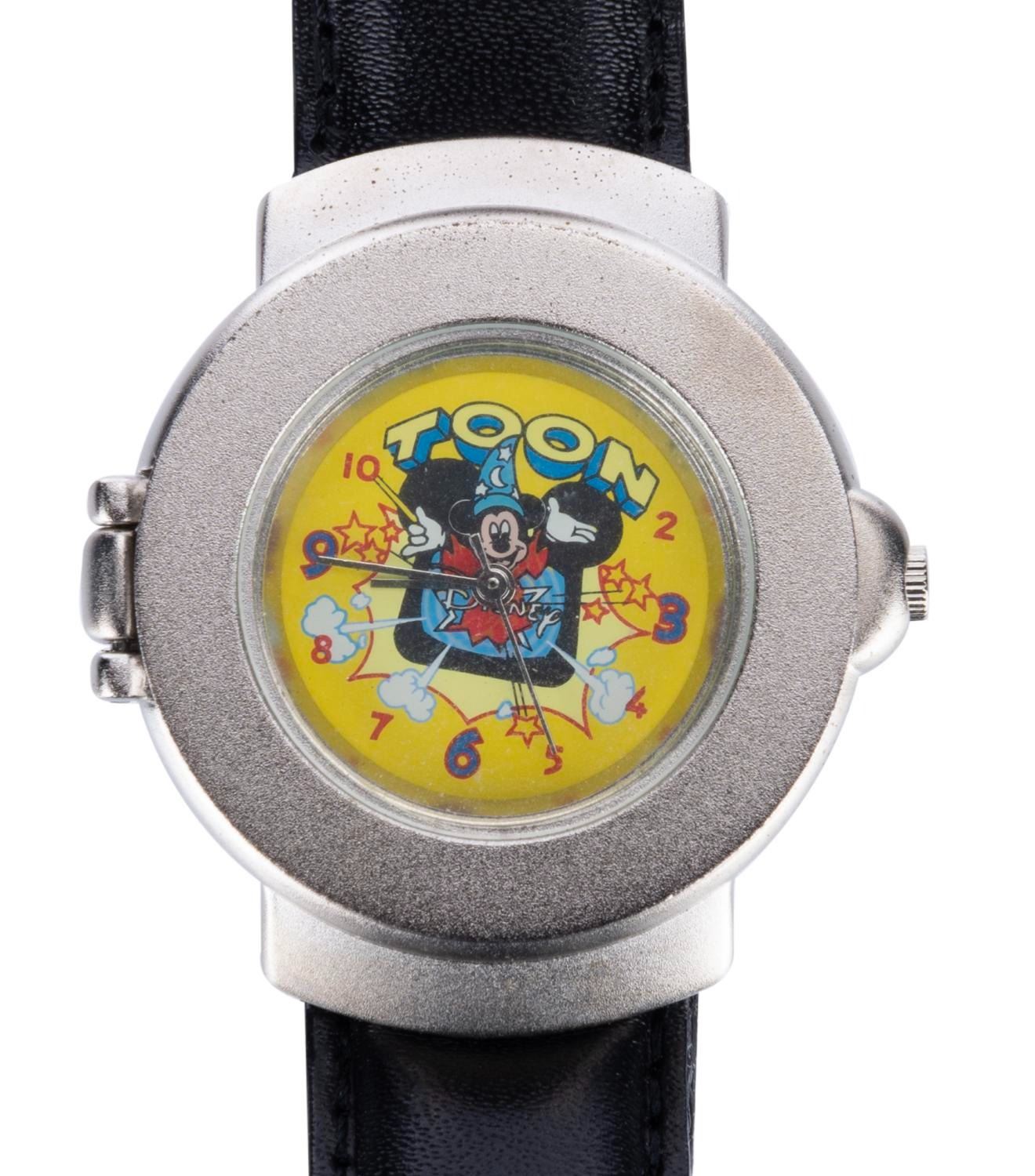 (Becora, 1990s) A Toon Disney wristwatch by Becora. This spring-loaded watch features the Mickey Mouse Sorcerer's Apprentice television logo. This rare timepiece measures 1.5" in diameter on a 9.75" band and is in fine condition.