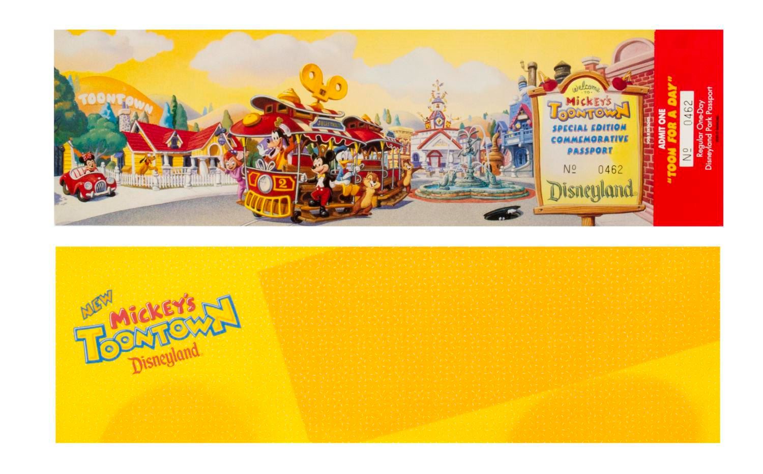 (Disneyland, 1993) A rare special edition commemorative passport from the Grand Opening of Disneyland's "Toontown." and is Numbered 0462, this unused passport has the regular one-day Disneyland Park passport stub still attached at the bottom, and comes with its original envelope. Measuring 4"x14", the passport is in very good condition with light handling wear.