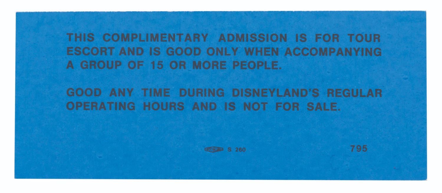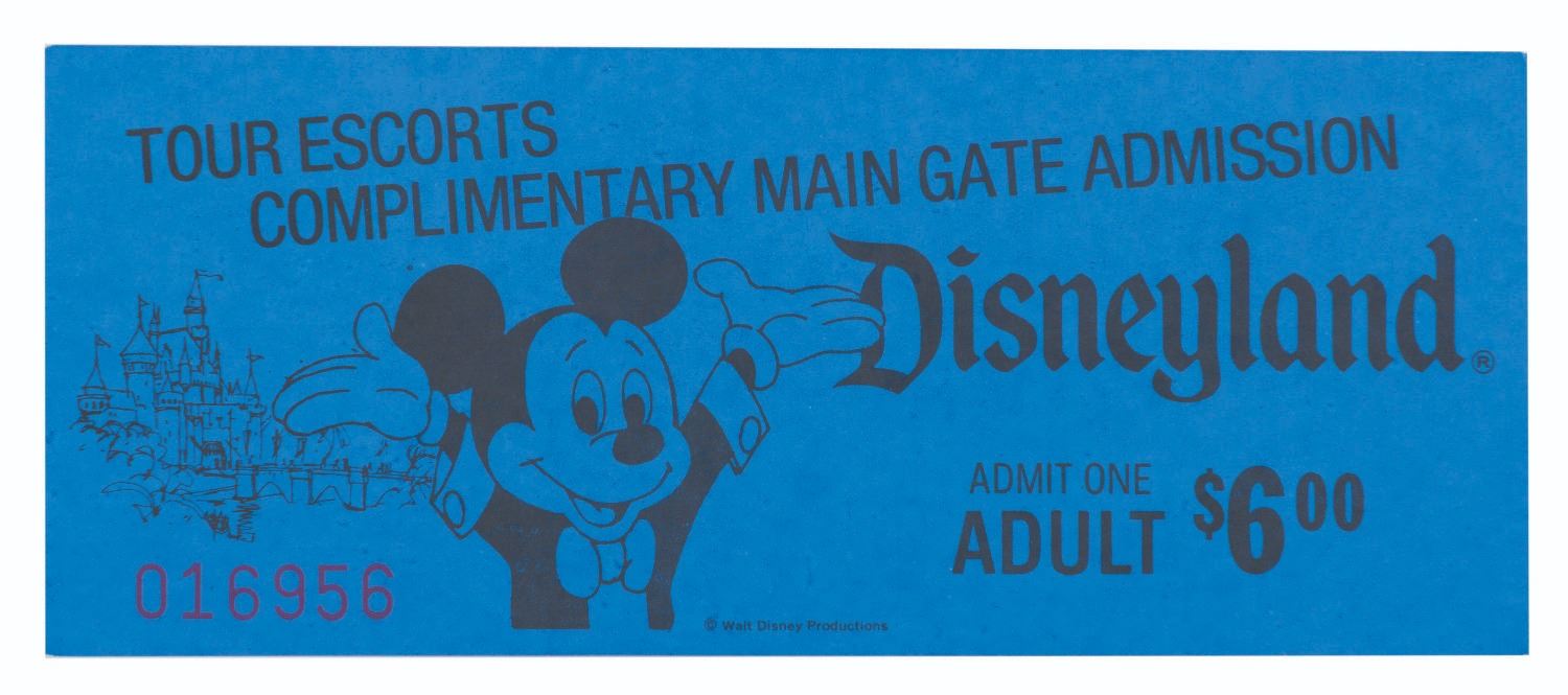 (Disneyland, 1960s-70s) A Tour Escort Complimentary Main Gate Admission Ticket, a special form of the complimentary Main Gate Admission for the guests of Disneyland Cast Members. Measuring 2.25" x 5", the ticket numbered 016956 is in very good condition with light wear.