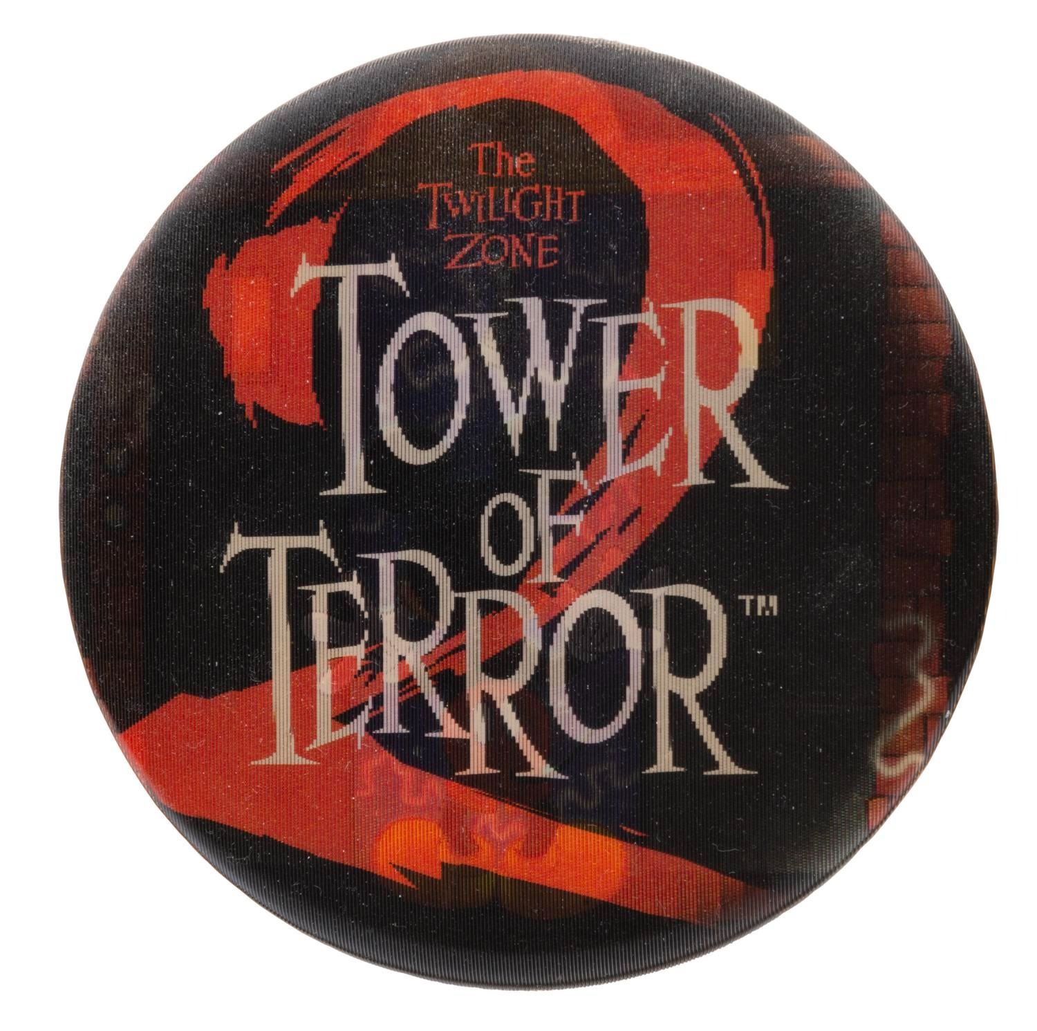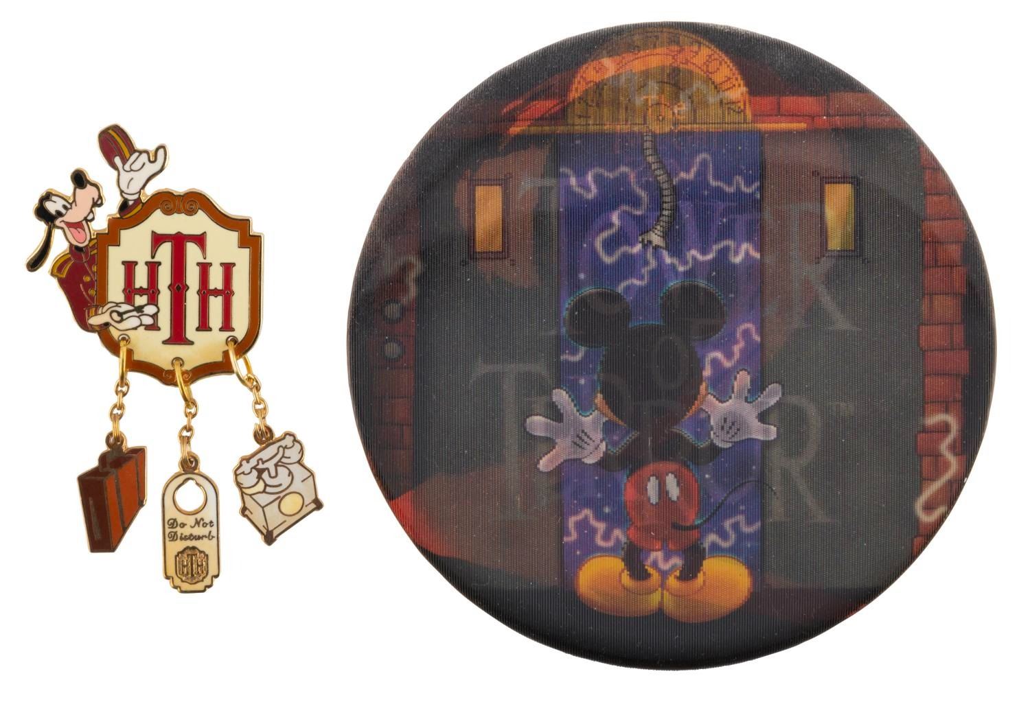 (Disneyland/ Disney-MGM Studios, 2000-2004) A Disneyland Twilight Zone Tower of Terror event dangle pin featuring Goofy as a bellhop and a Disney-MGM Studios lenticular button. Measuring 3" to 4" diameter the pin and button are in very good condition.