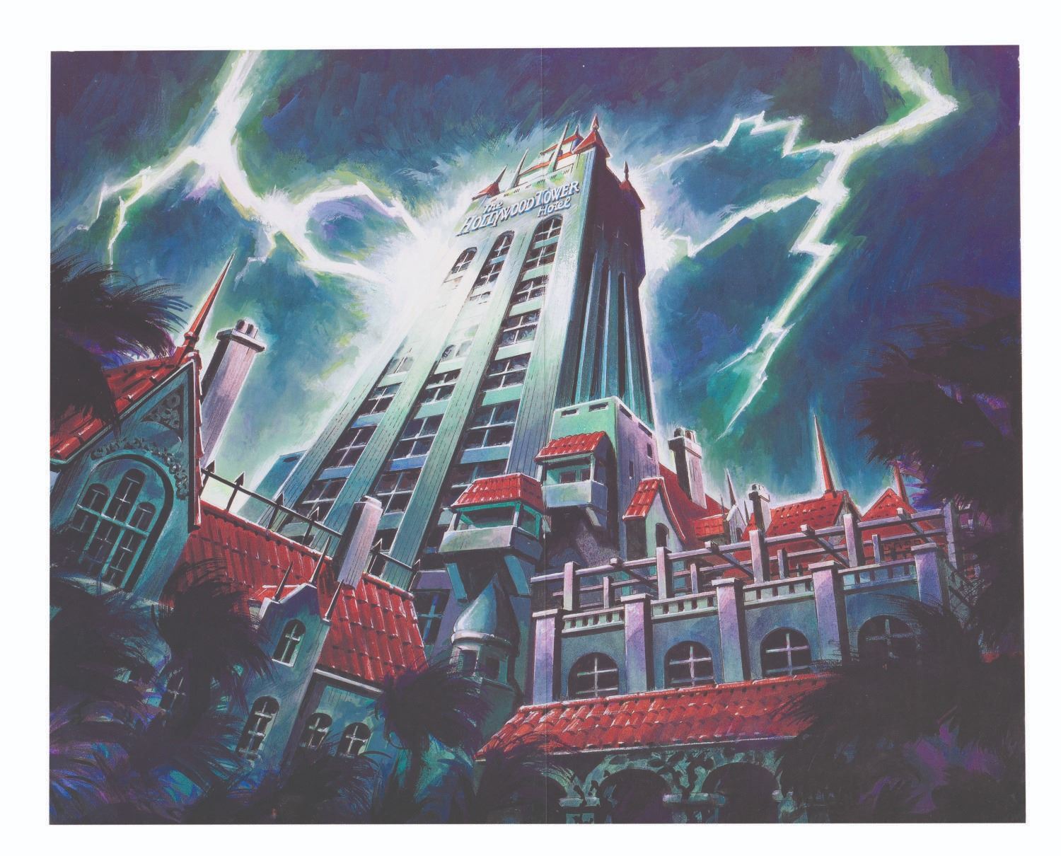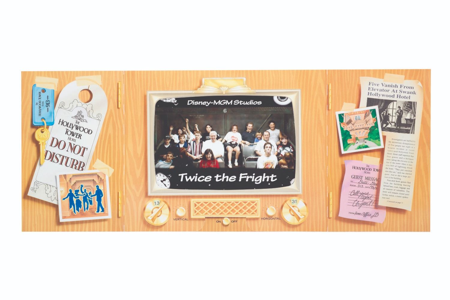 (Disney-MGM Studios, 1997) A souvenir photo and holder from The Tower of Terror at Disney's Hollywood Studios. The time stamped photo depicts guests making a stop in the fifth dimension in 1998. The photo measures 8.5"x7", and the holder is 8"x10", with each piece in fine condition.