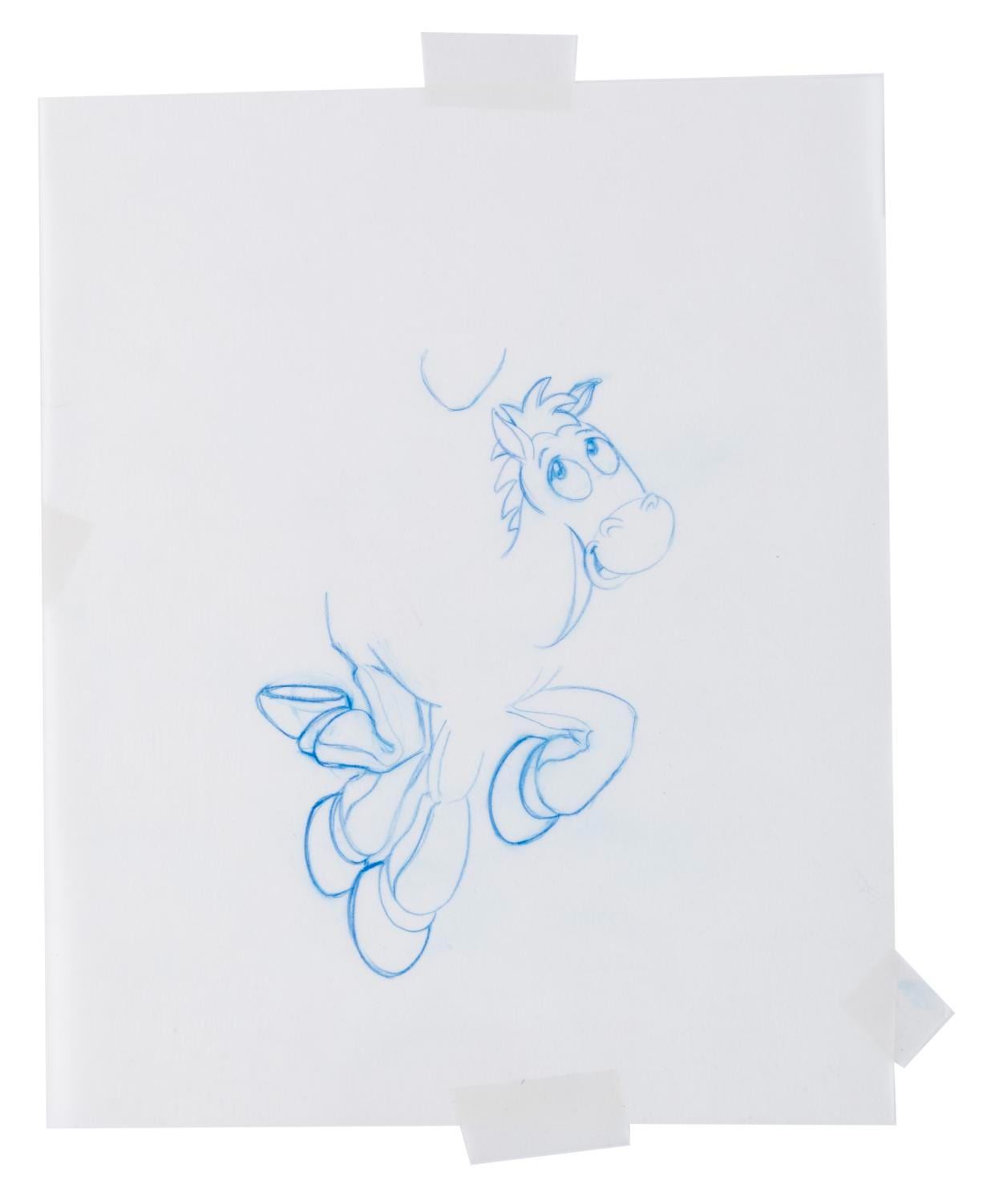(Disney, 1990s-2000s) An original drawing of Woody and Bullseye from “Toy Story,” likely used for merchandising purposes. With a character image size of 7.75” x 4.75” on 11” x 17” animation paper, the blue pencil drawing is in very good condition with light smudging from production use.