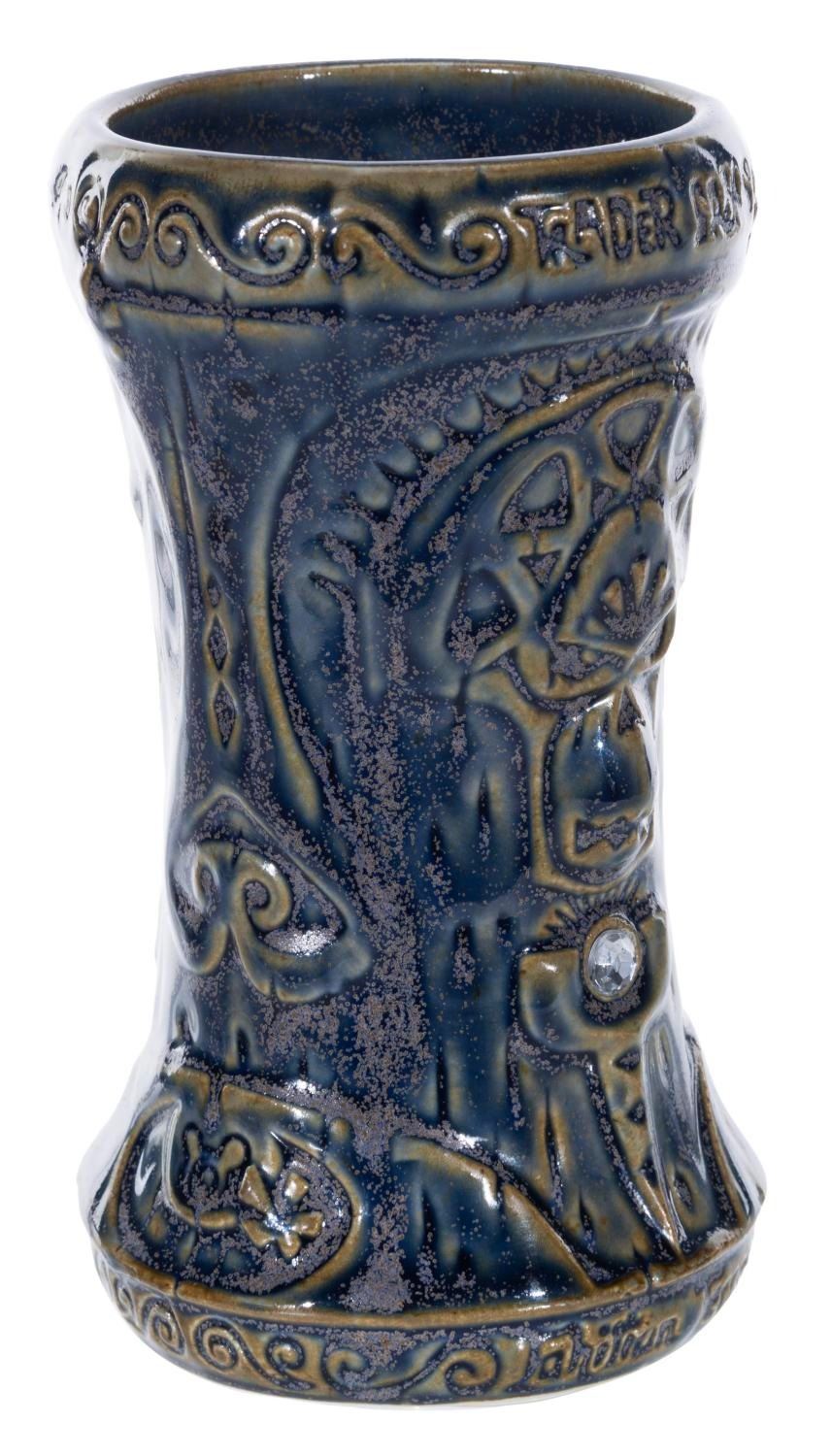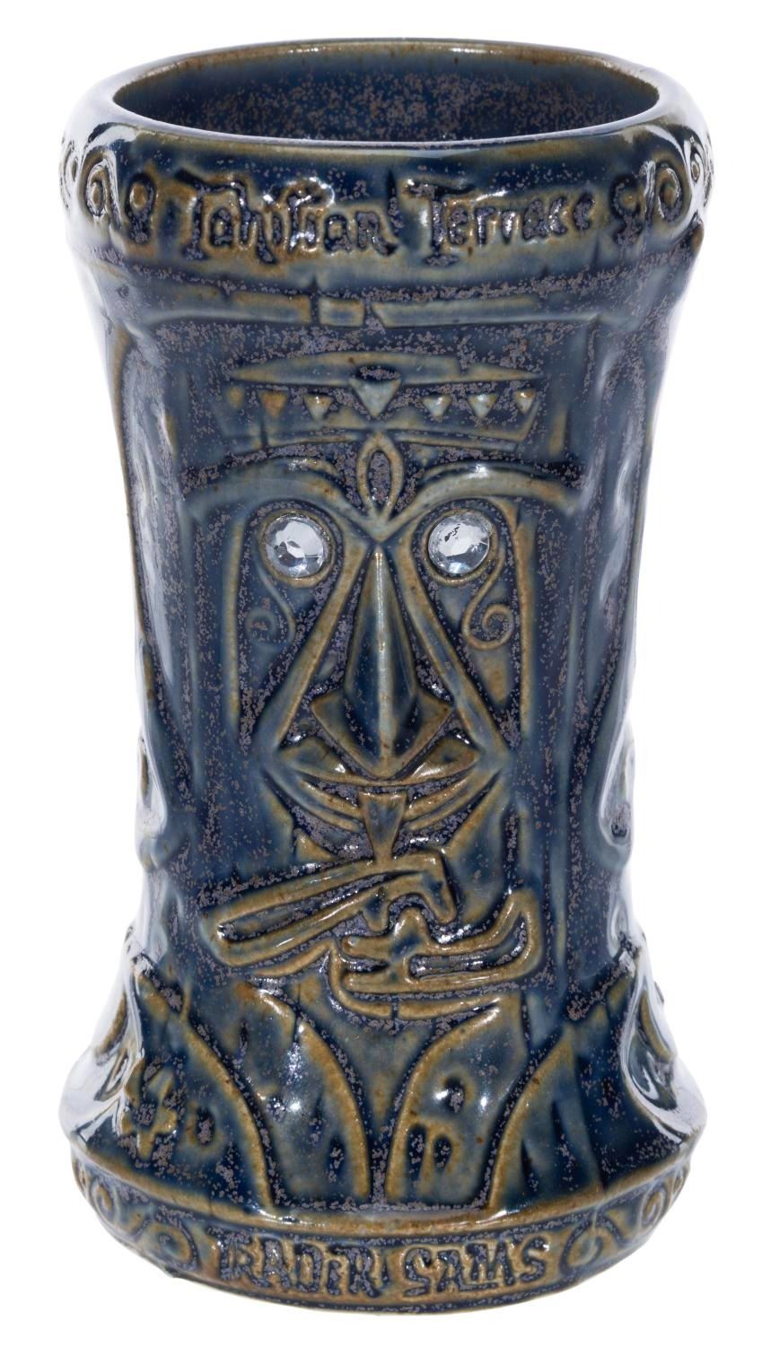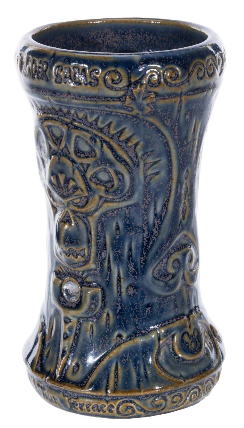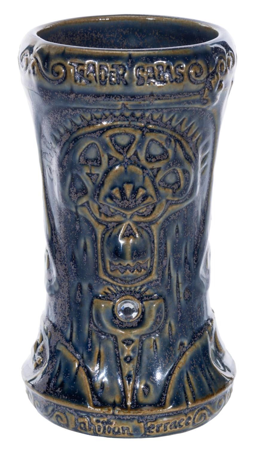 (Disneyland, 2015) A 2nd edition ceramic tiki mug created for the Tahitian Terrace Diamond Luau tribute event on August 10, 2015, at the Disneyland Hotel. The mug features tiki faces on either side with faux diamond accents and both the Trader Sam’s and Tahitian Terrace logos. Measuring 6” tall and 3.5” in diameter, the mug is in very good condition with light wear.
