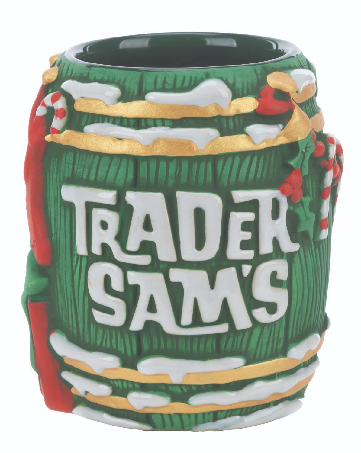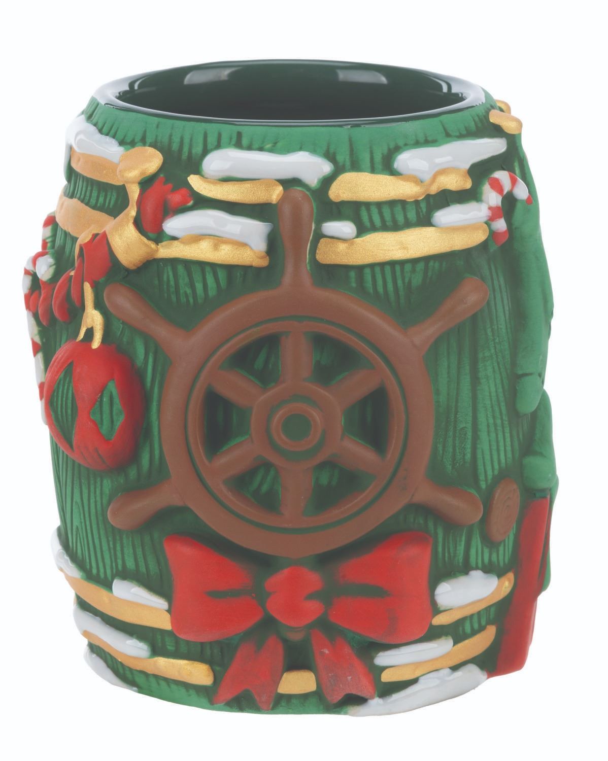 (Disneyland, 2024) A Holiday Edition 2024 rum barrel mug from Trader Sam’s Enchanted Tiki Bar. This green iteration, covered in festive designs, is the second holiday-themed rum barrel released by the beloved Disneyland Hotel bar. Measuring 4.5” tall and 3.5” in diameter, the ceramic mug comes with its original box and is in fine condition.