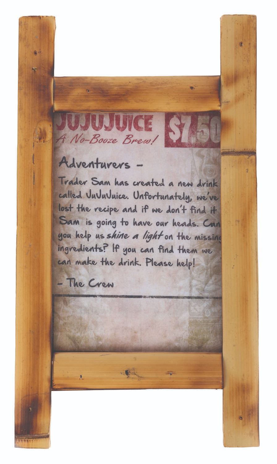 A Trader Sam's "JujuJuice" Scavenger Hunt Sign.