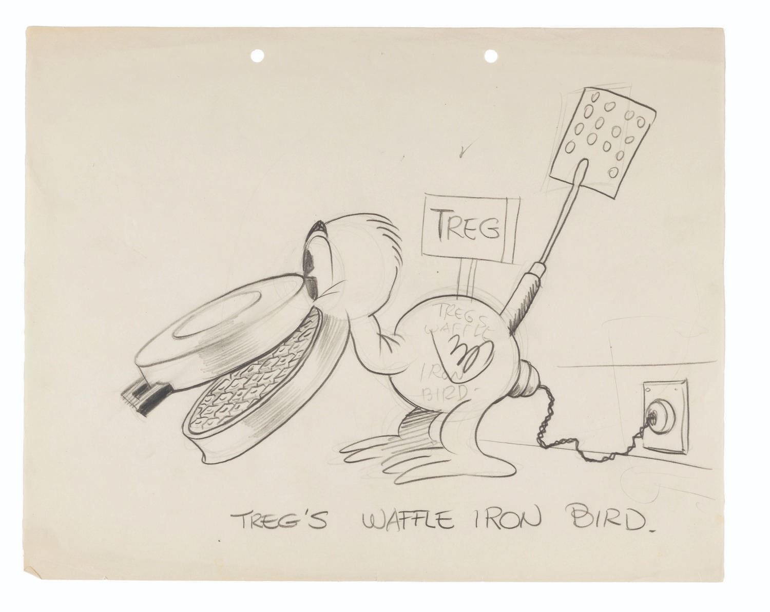 (Clampett, 1930s-40s) A drawing of a “Treg’s waffle iron bird” by Bob Clampett. Treg Brown was the studio’s sound editor for Looney Tunes and Merrie Melodies. He suggested this character to Clampett for “Porky In Wackyland”, but the character was not used. Accomplished in graphite and measuring 9.5” x 12”, the drawing is in good condition with edge wear, creasing to the lower left corner and along the bottom edge, and light discoloration from age.