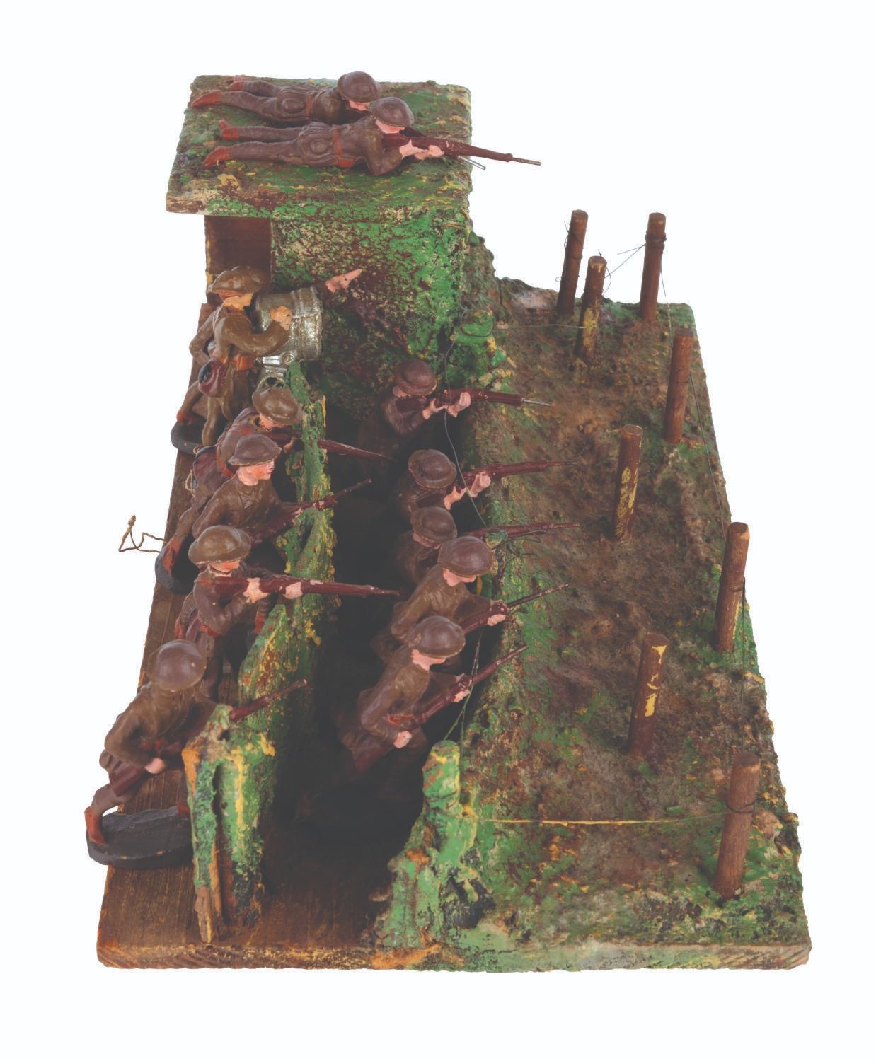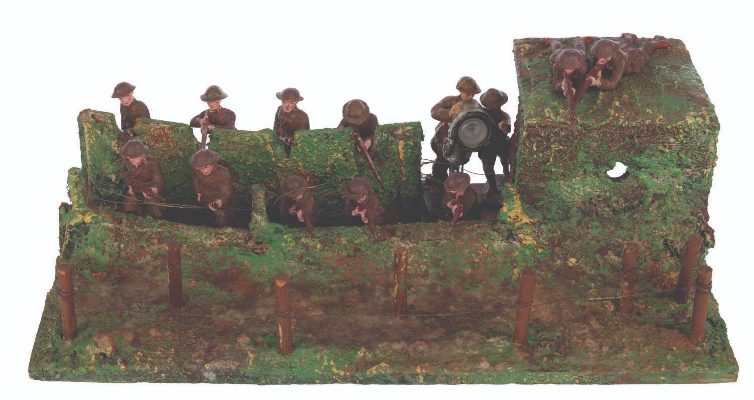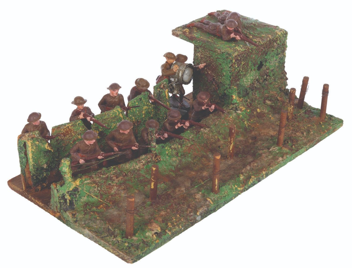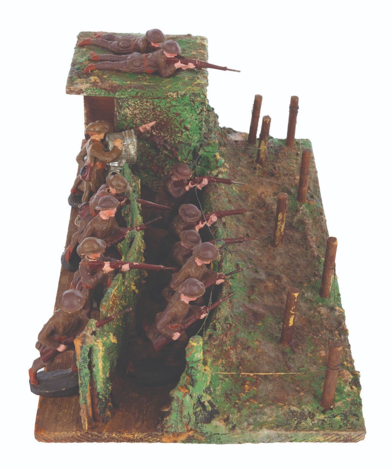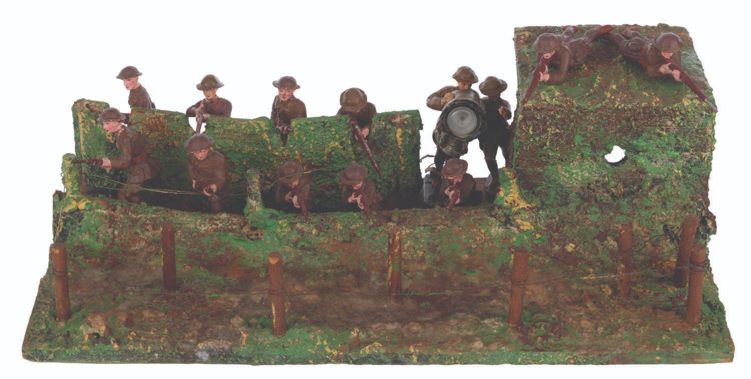 (Elastolin/Duro, 1920s-1950s) A collection of thirteen Elastolin and Duro toy soldiers in an Elastolin trench warfare scene, featuring a wired-off no man’s land and a sniper perch. Ranging in size from 1.75” tall to 4.25” long on the 6.75” x 12.75” x 4” tall trench, the figures display in good condition with large chips, scuffs, cracks, scratches, and intentional distress on the trench.