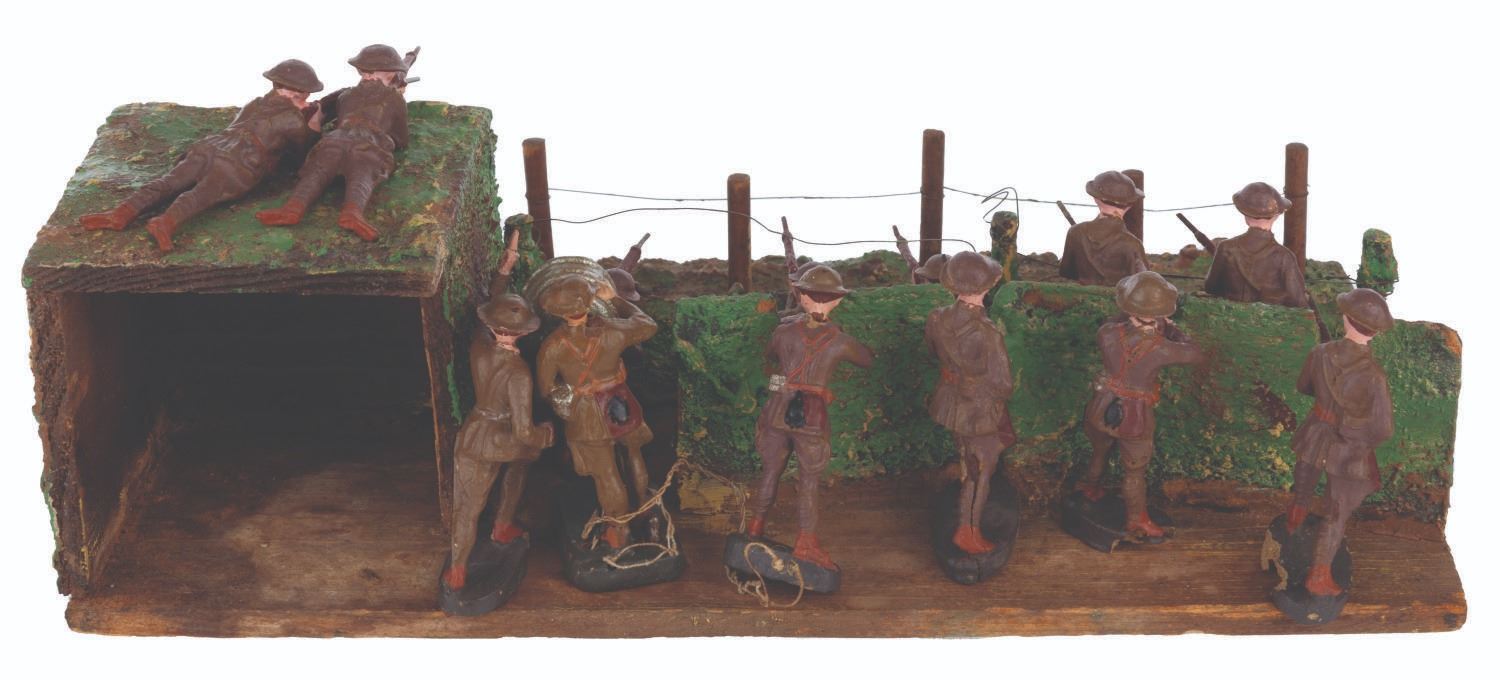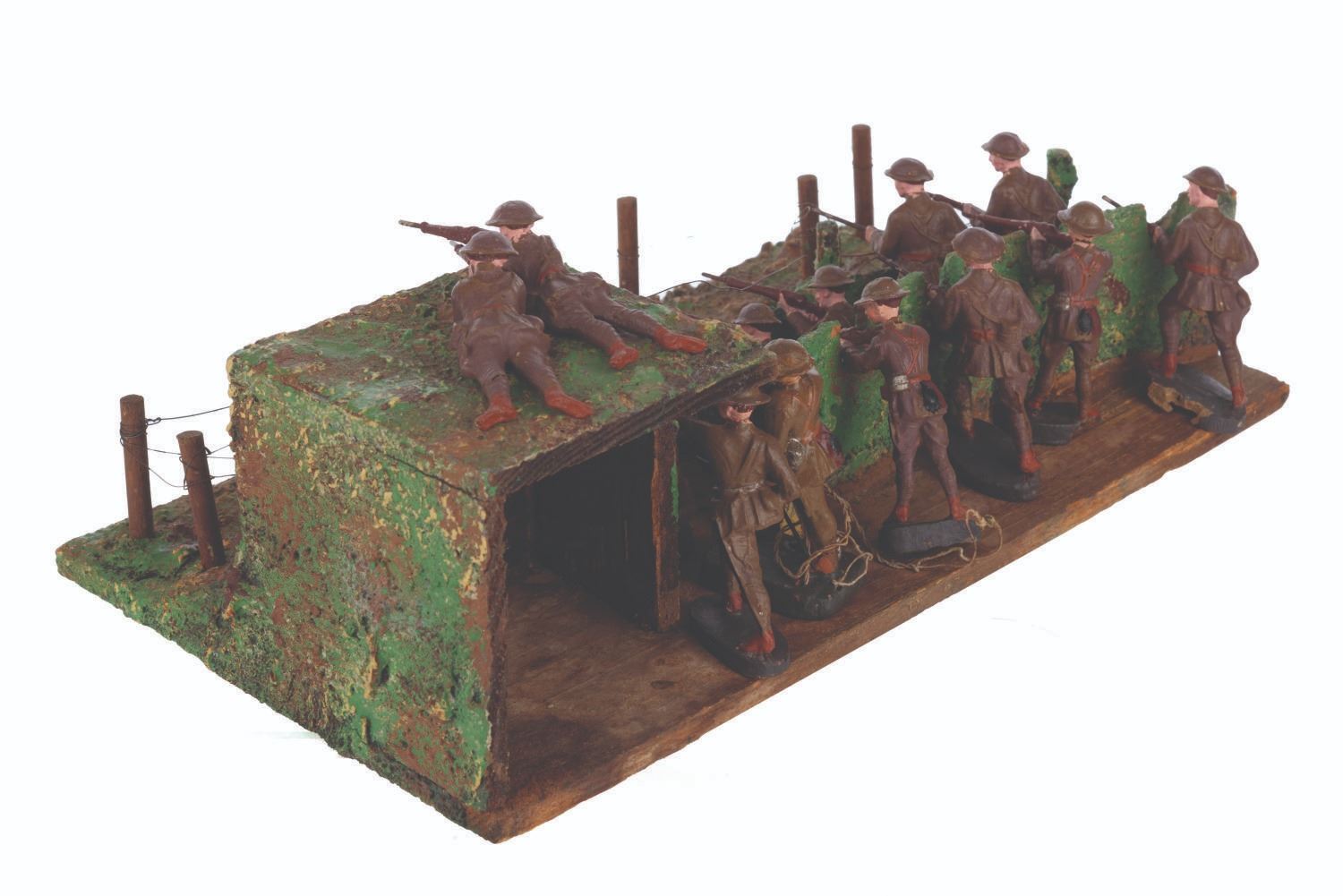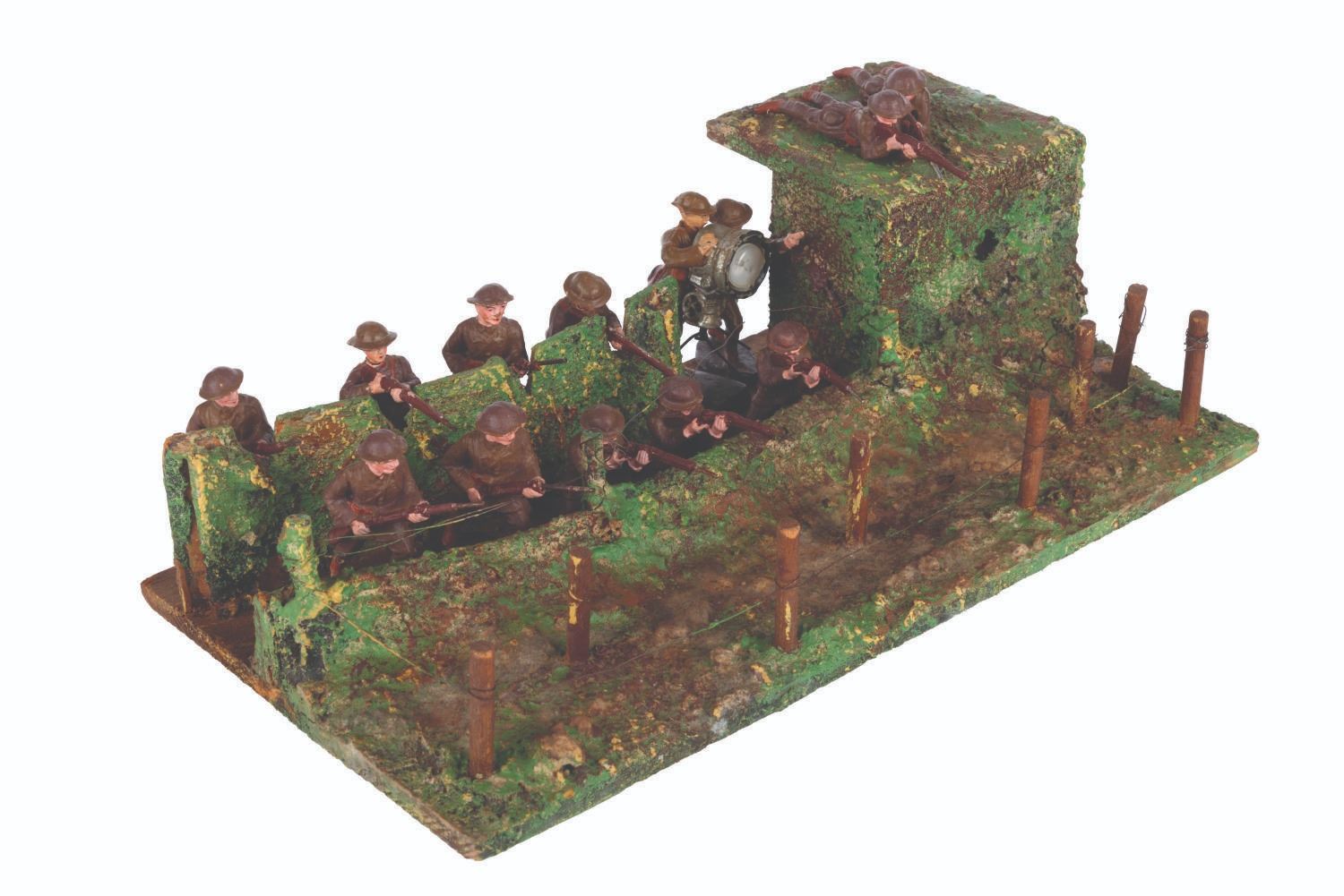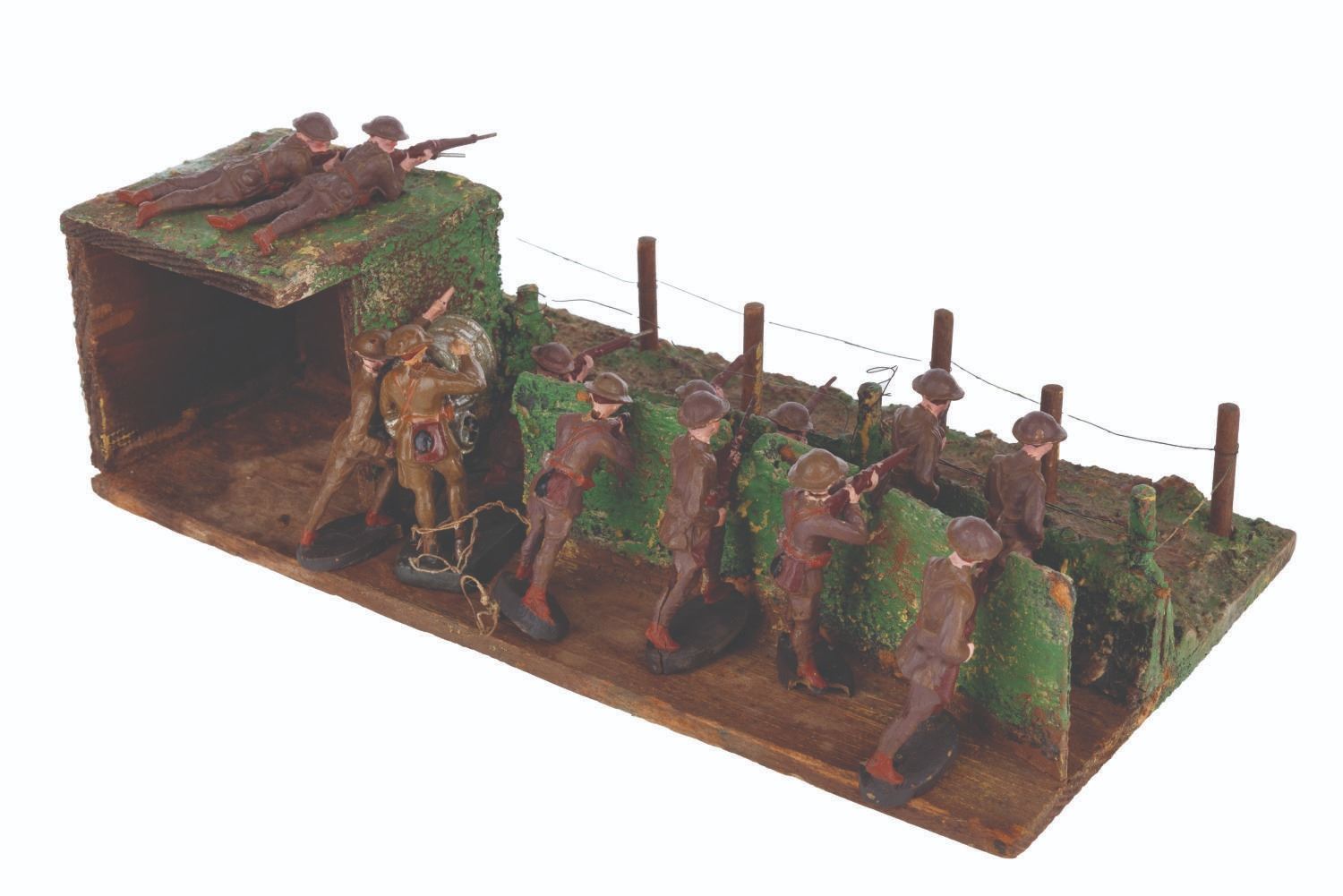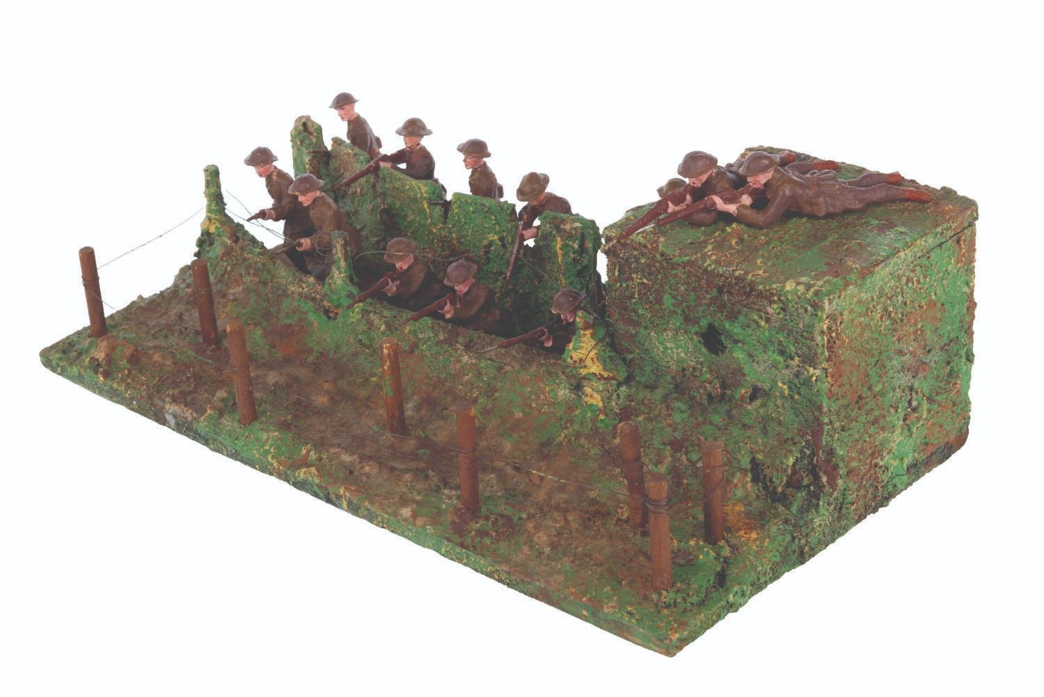 (Elastolin/Duro, 1920s-1950s) A collection of thirteen Elastolin and Duro toy soldiers in an Elastolin trench warfare scene, featuring a wired-off no man’s land and a sniper perch. Ranging in size from 1.75” tall to 4.25” long on the 6.75” x 12.75” x 4” tall trench, the figures display in good condition with large chips, scuffs, cracks, scratches, and intentional distress on the trench.
