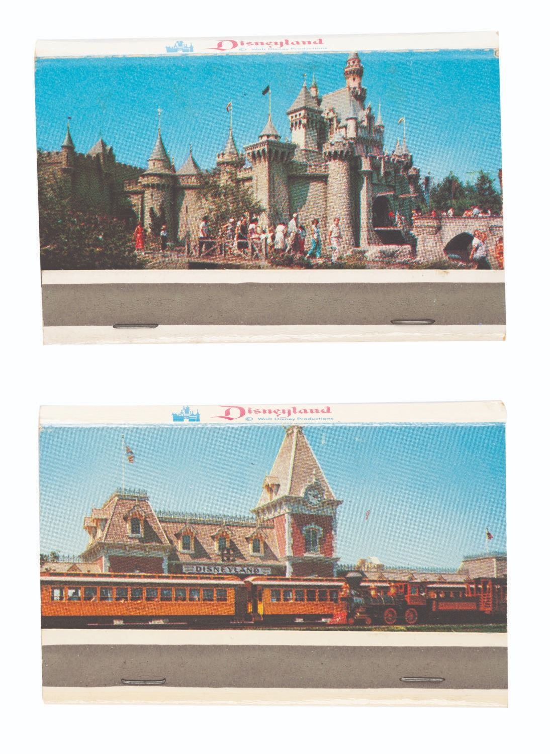 (Disneyland, 1956-58) A Set of three Disneyland souvenir panoramic matchbooks by Universal Match Co. Each rare matchbook features photo images of (2) Park attractions and opens to reveal descriptive captions. One of the books does not contain its matches. Measuring 3"x2", each book cover is in very good condition, with faint dimples, a few small creases, wear to their edges, and pencil annotation inside the cover of one.