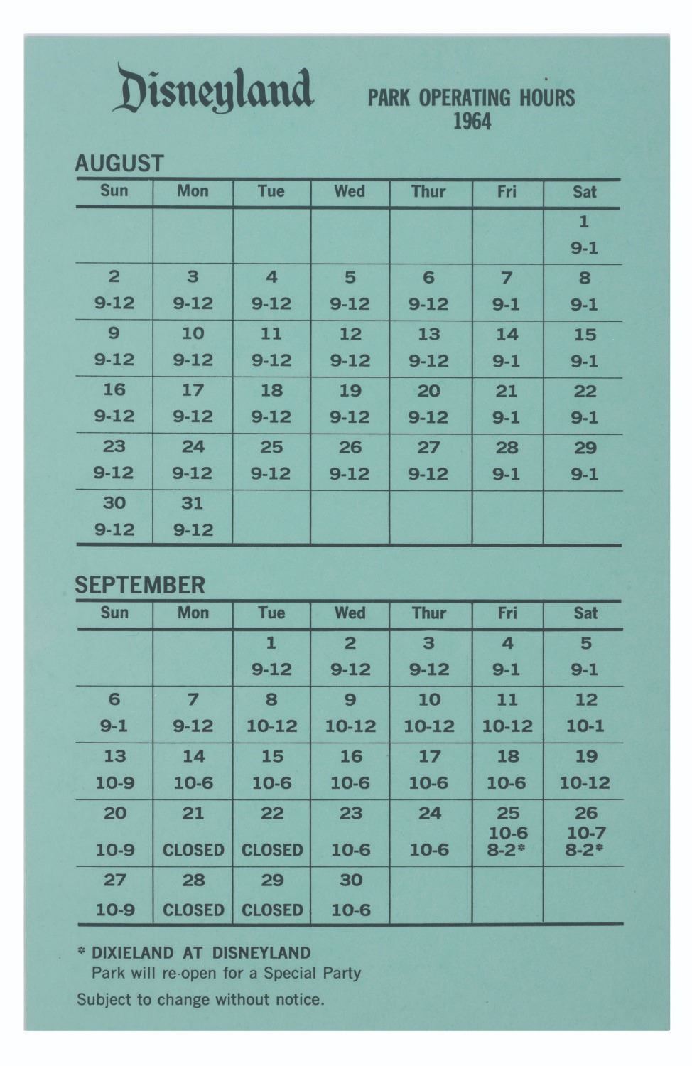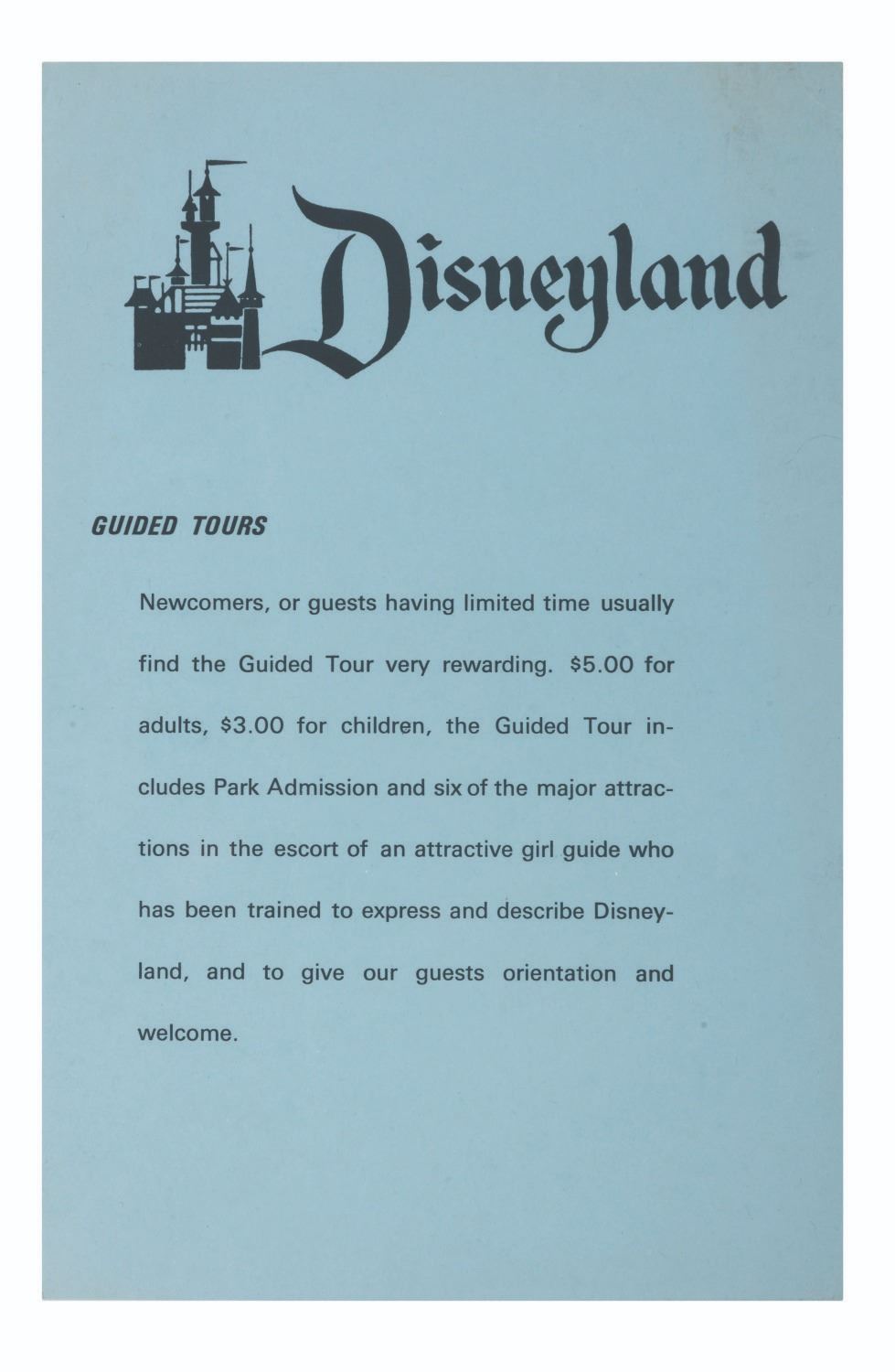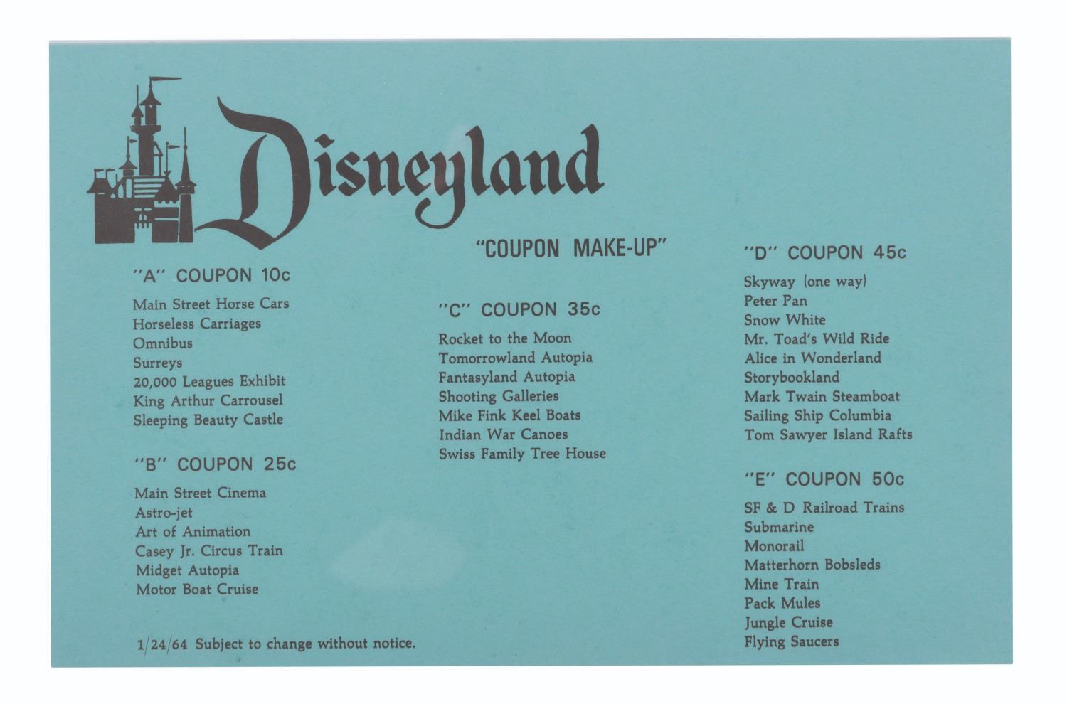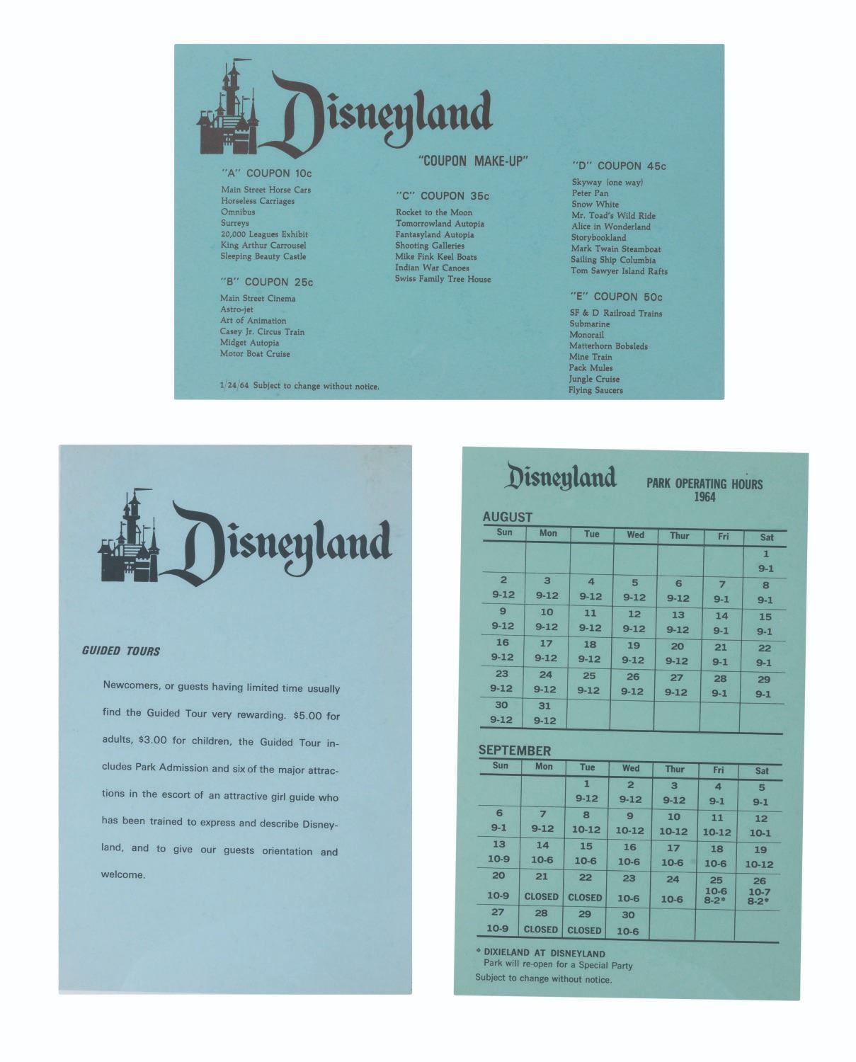 (Disneyland, 1964) A trio of Disneyland informational gate flyers, including Park Operating Hours for August and September of 1964, Disneyland Guided Tours, and a "Coupon