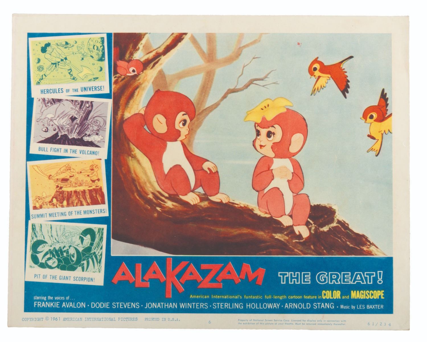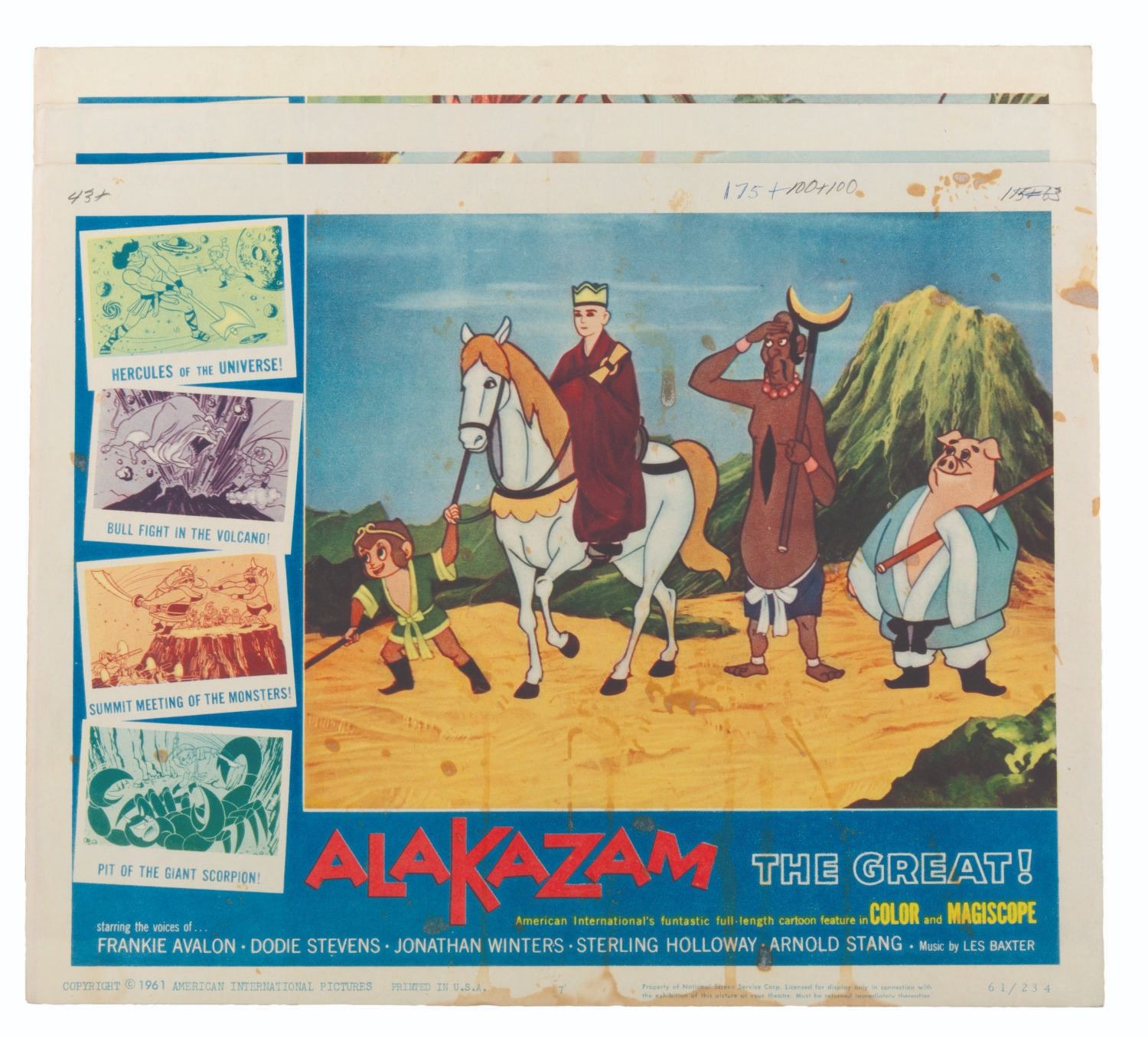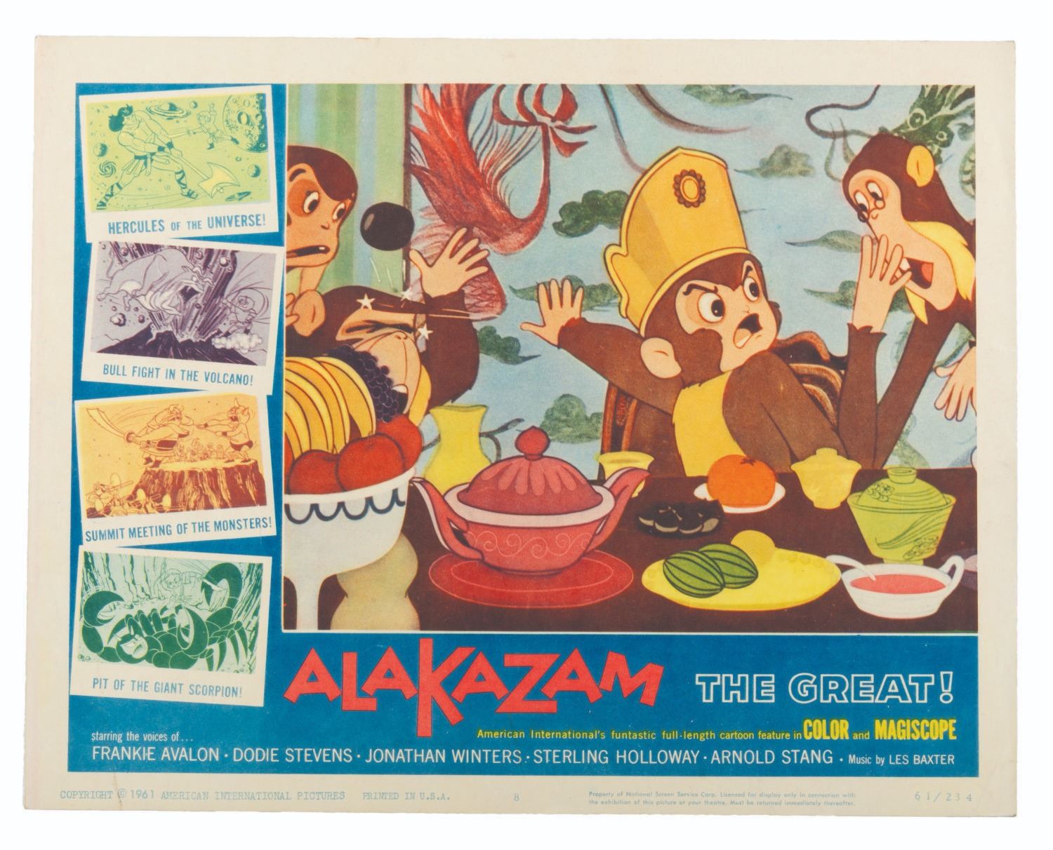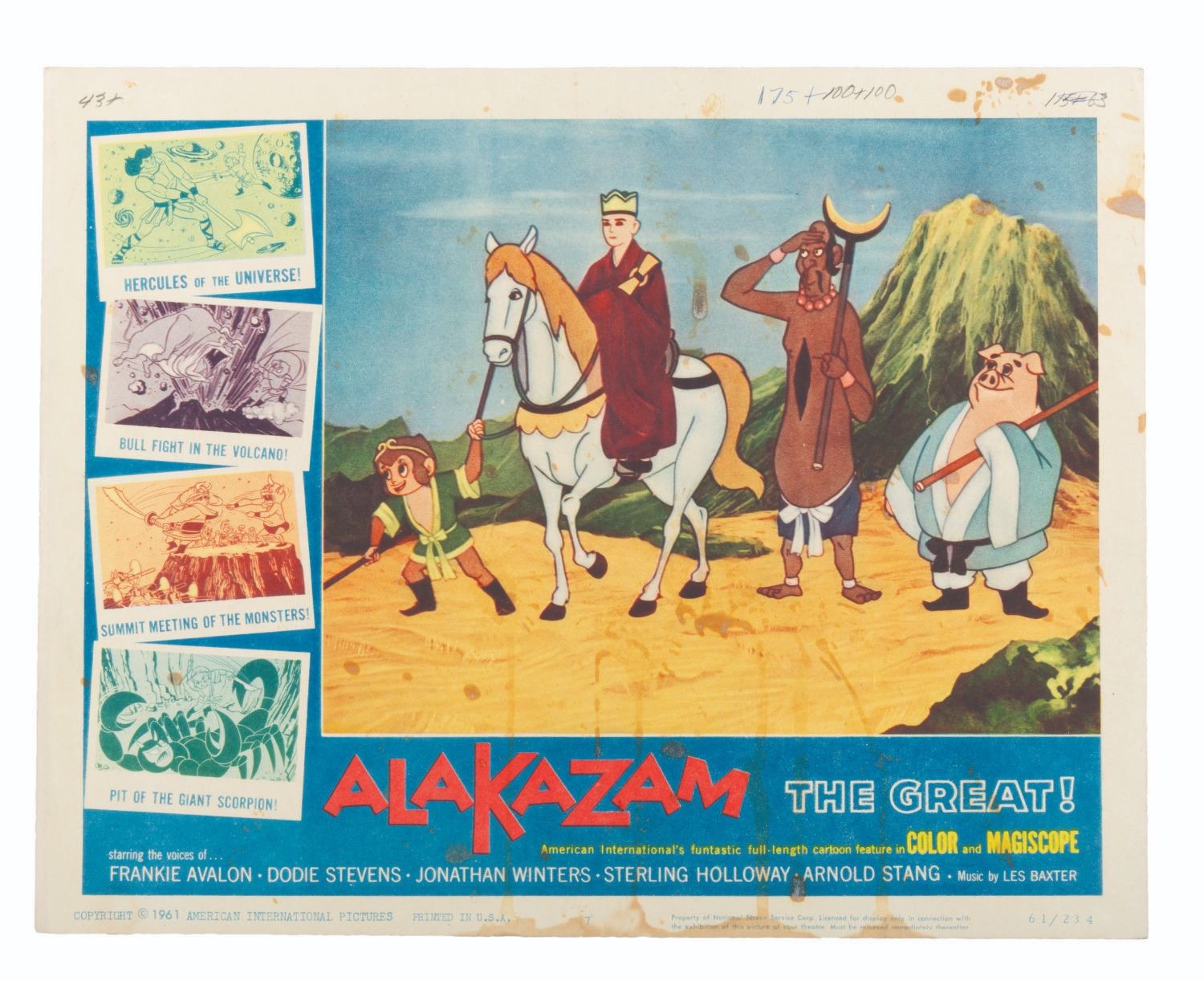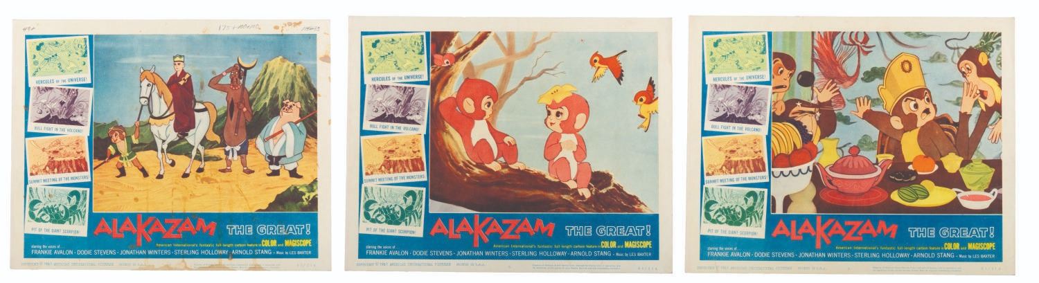 (American International, 1961) Three lobby cards for the Japanese anime musical "Alakazam the Great! " based on the Chinese novel Journey to the West. Measuring 11 " x 14 ", one card is in fair condition with heavy staining, while the other two are in good condition with light discoloration, creasing, and spots on the reverse.