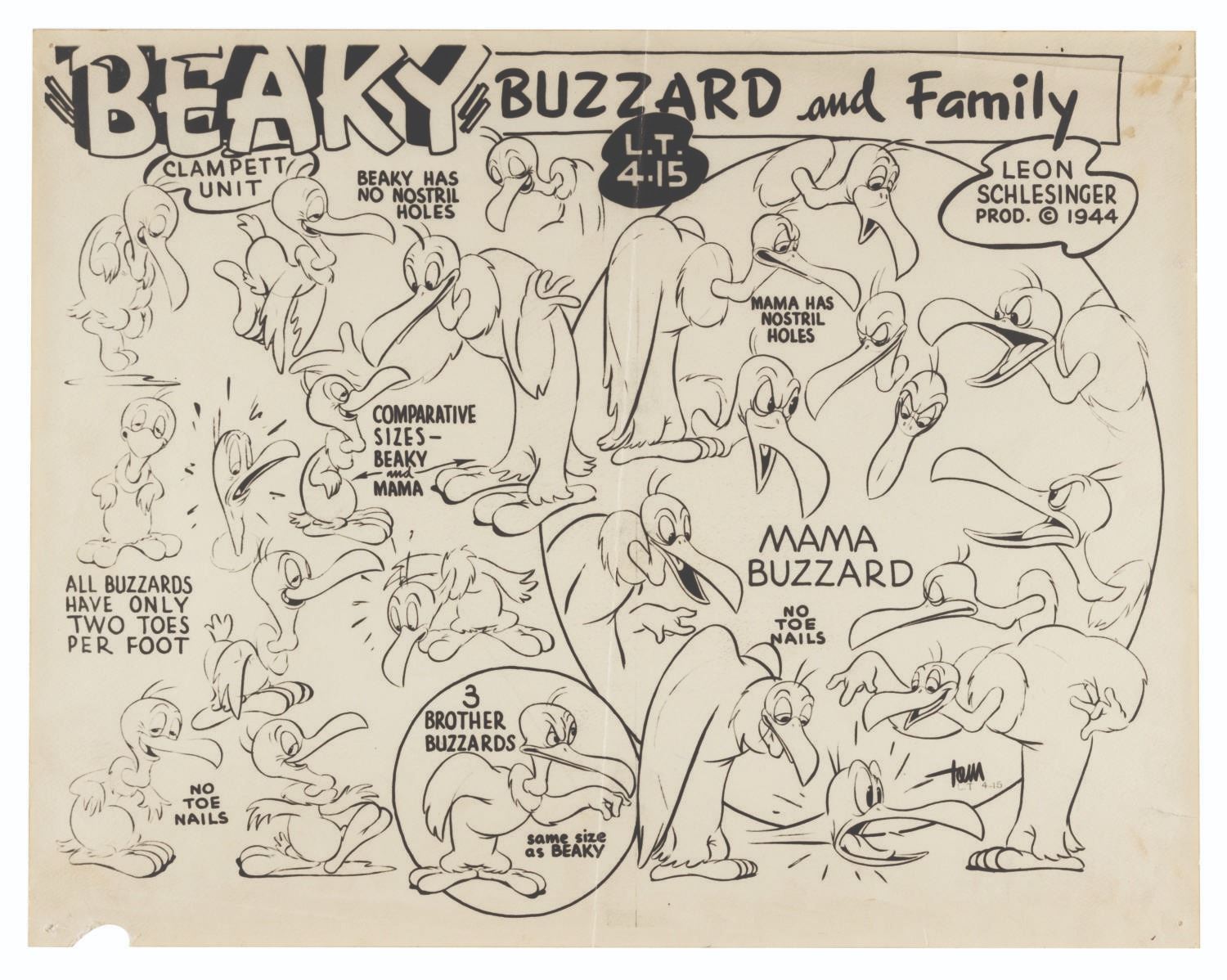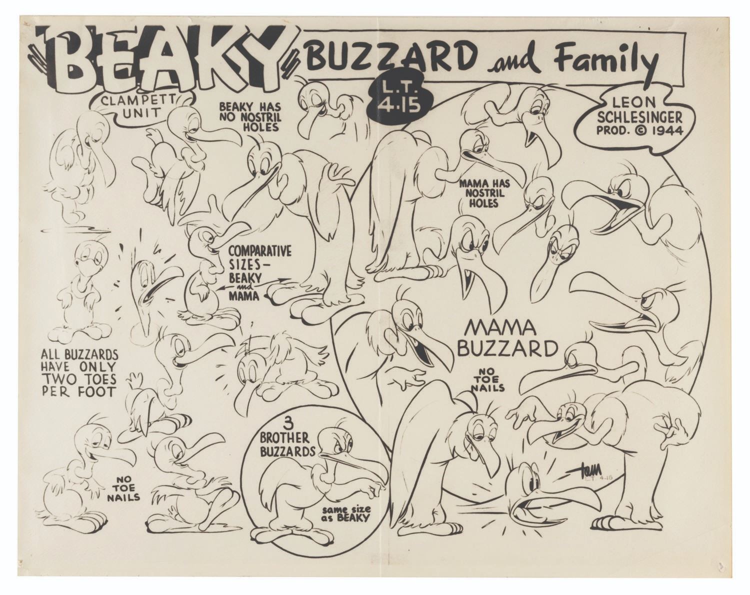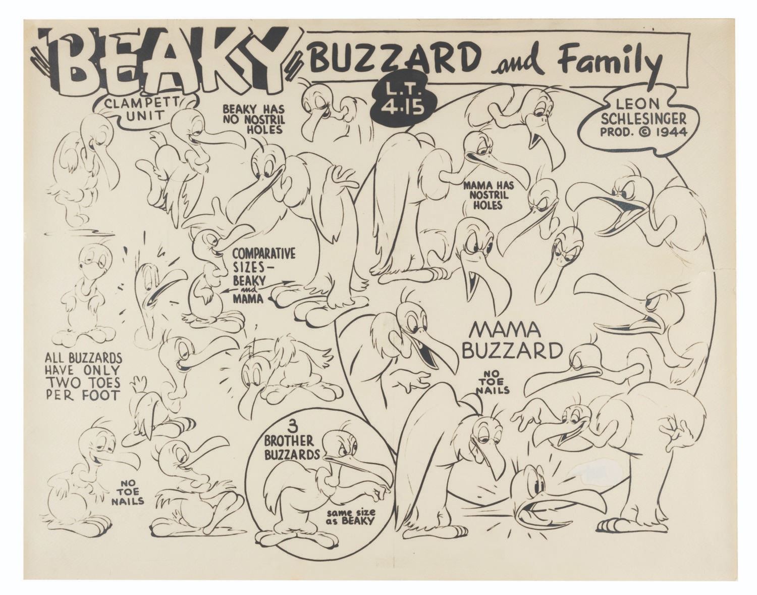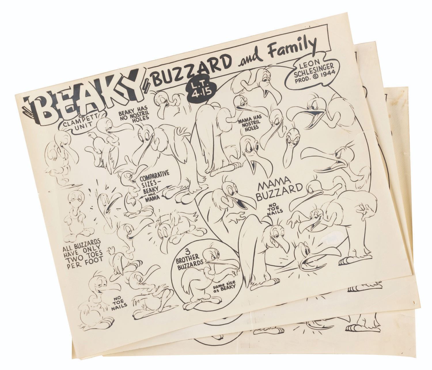 (Schlesinger, 1944) A trio of Beaky Buzzard and Family photostat model sheets from the Merrie Melodies short “The Bashful Buzzard,” directed by Bob Clampett. Measuring 10.75” x 13.75”, the model sheets are in good condition with edge wear, creasing, pinholes and corner tears from production use, vertical folds down the center from being folded in half, and light discoloration from age.