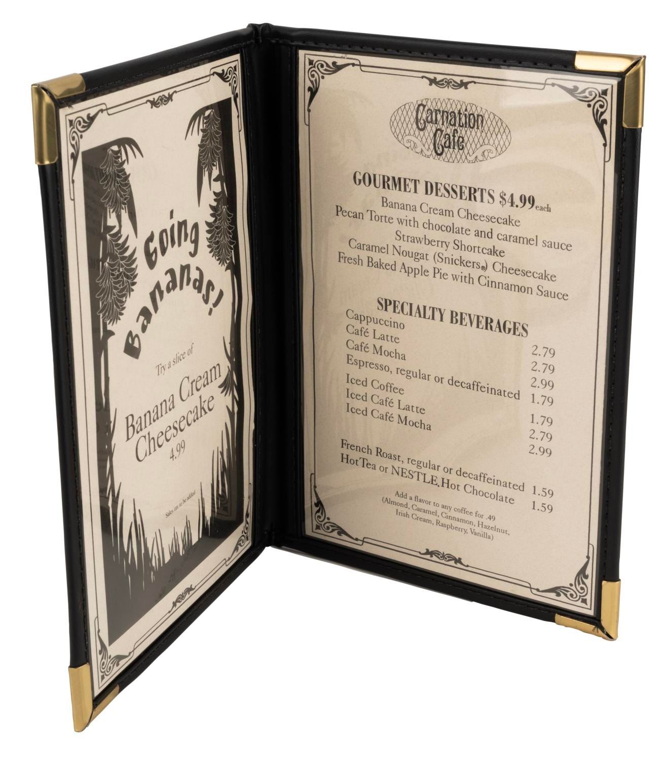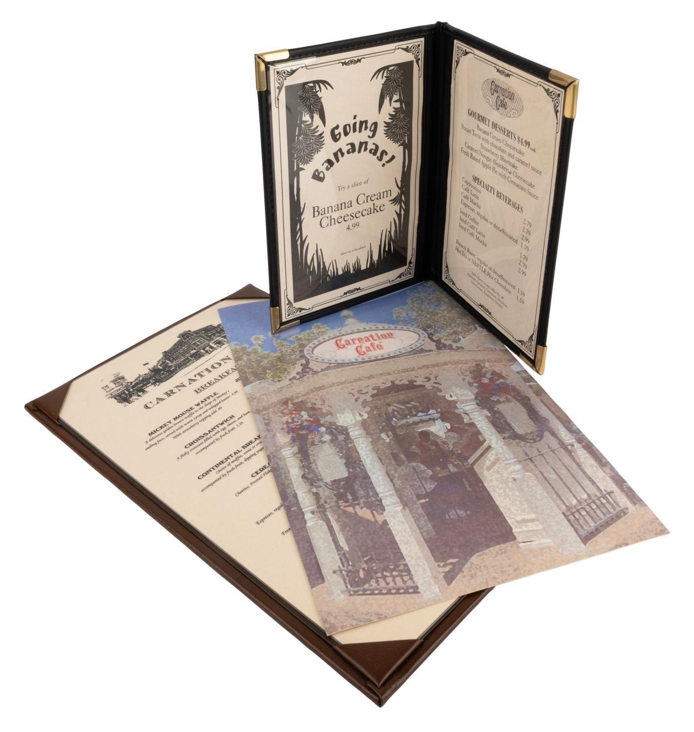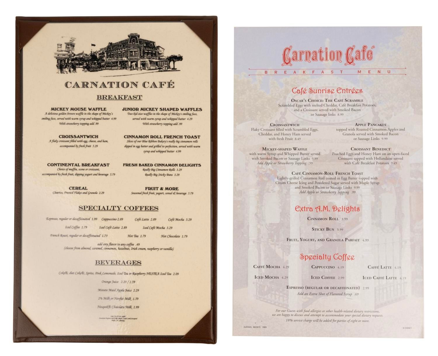 (Disneyland,2000s-2010s ) A collection of three menus from the Carnation Café located on Main Street USA, including two breakfast menus and one dessert menu. Measuring between 6.5"x9.25" and 9.25"x14.75", the menus are in fine condition with minimal handling wear.