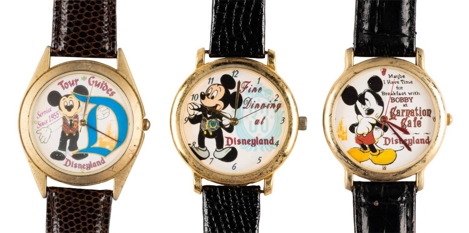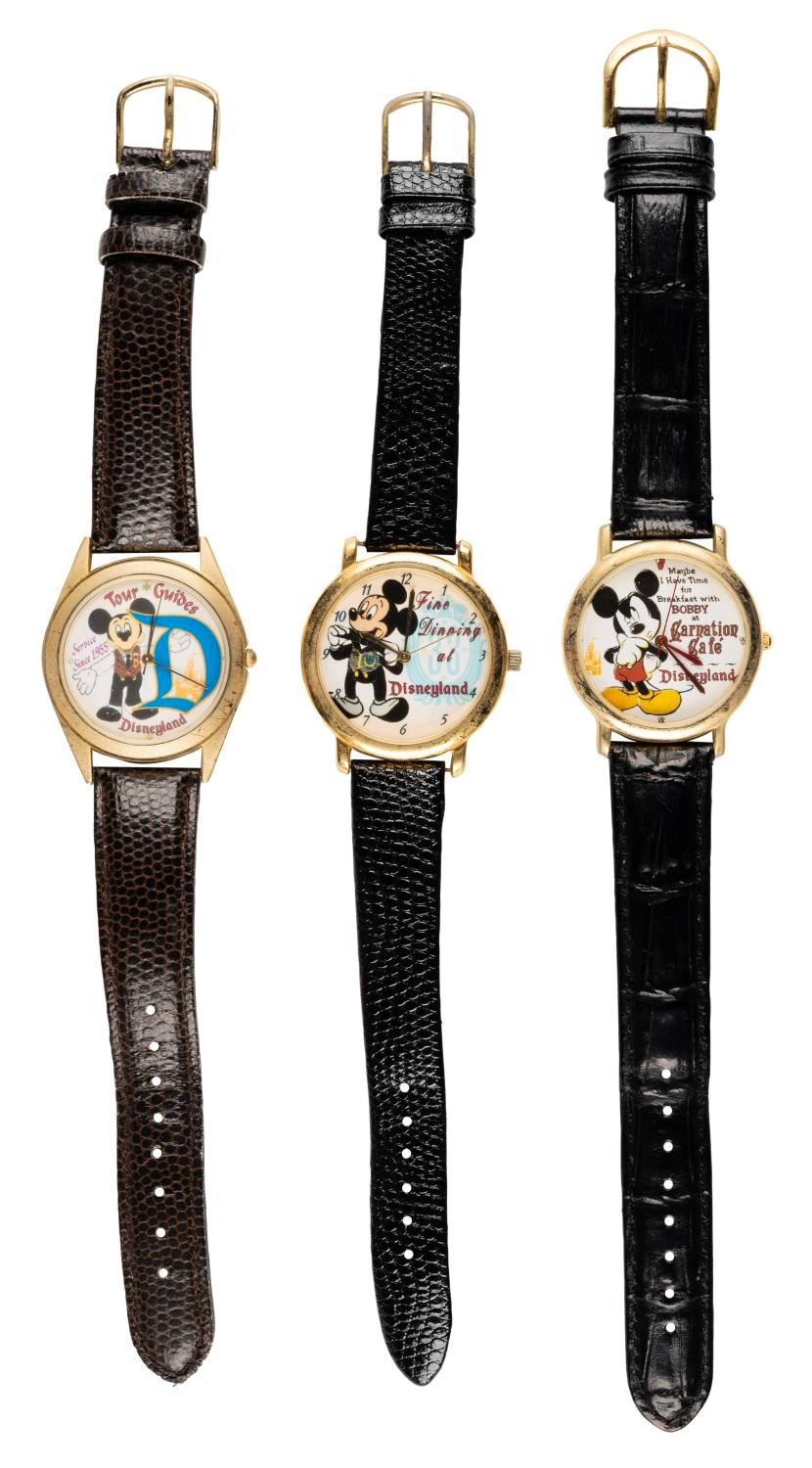 (Disneyland, 1980s-90s) Three Disneyland Cast Member-exclusive watches featuring Mickey Mouse. Included are a Tour Guides watch, a Club 33 Fine “Dinning” at Disneyland watch, and a “Maybe I Have Time for Breakfast with Bobby at Carnation Cafe” watch. The watches did not work when tested, requiring repair to function properly. Measuring 9” to 9.5” long, the watches are in good to very good condition with light scratches, scuffs, creases on the bands, and wear.