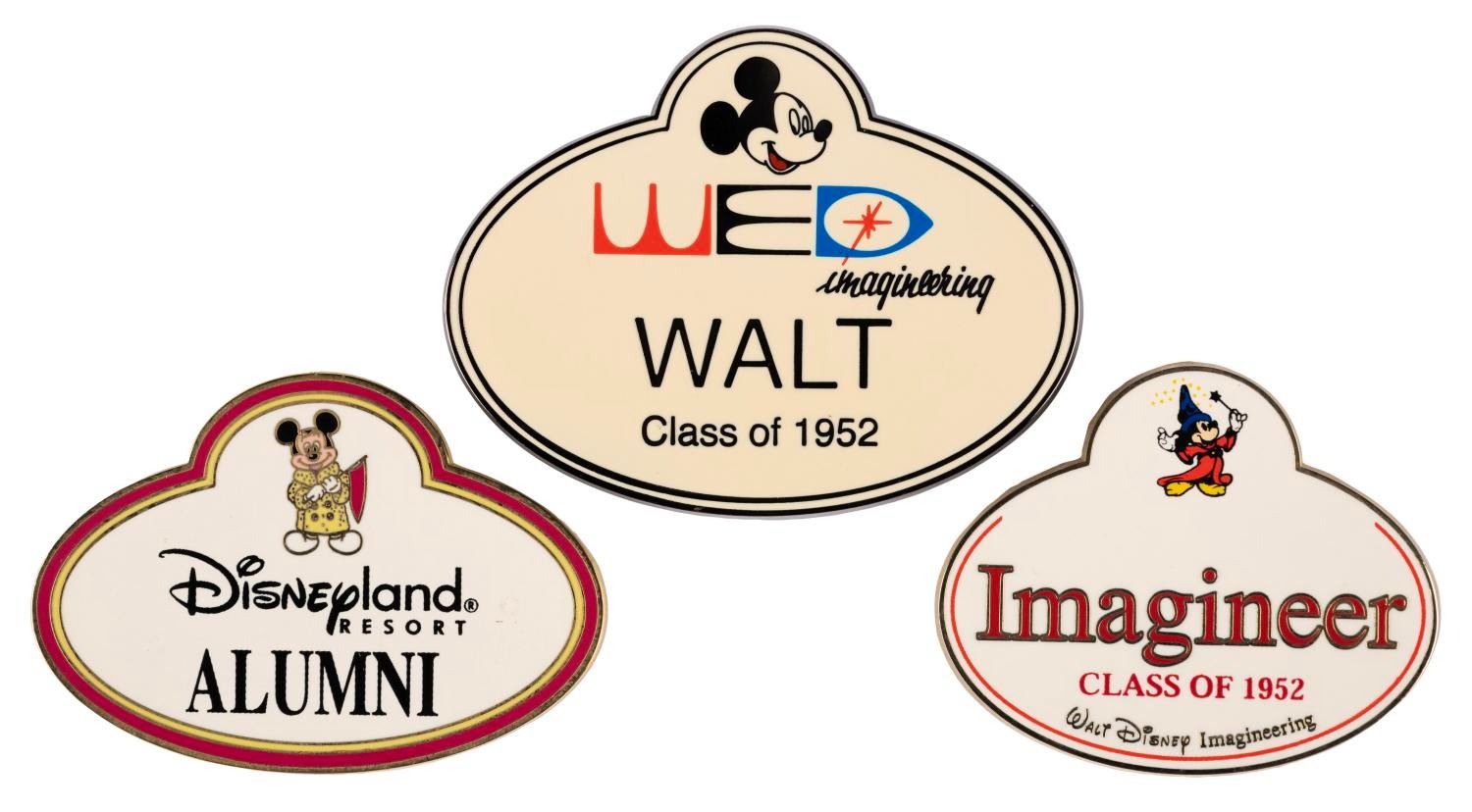 (WDI/Disneyland, 2003-2009) Three Disney Cast Member exclusive pins including two from Imagineering and one from Disneyland. The WED "Walt" pin measures 2.25" x 1.75" and was released in an edition of 300. The Imagineer pin measures 1.75" x 1.5", released in an edition of 500. The 2" x 1.5" Disneyland Alumni pin measures 2" x 1.5". All the pins are in very good to fine condition.