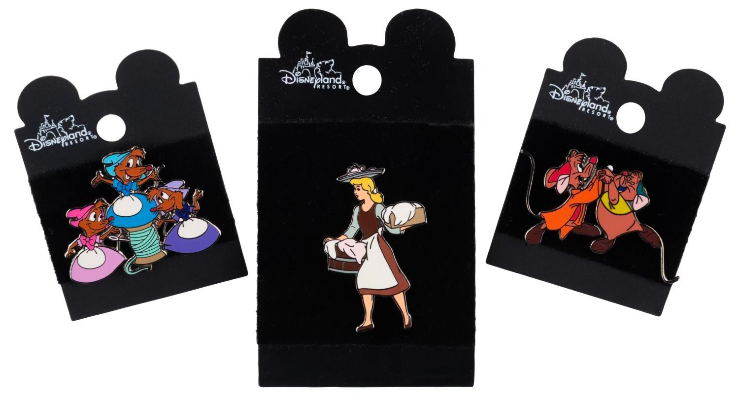 (Disneyland, 2000s) Three pins from "Cinderella" featuring Gus and Jaq, the sewing mice, and Cinderella working. The pins are in fine condition on the original cards.