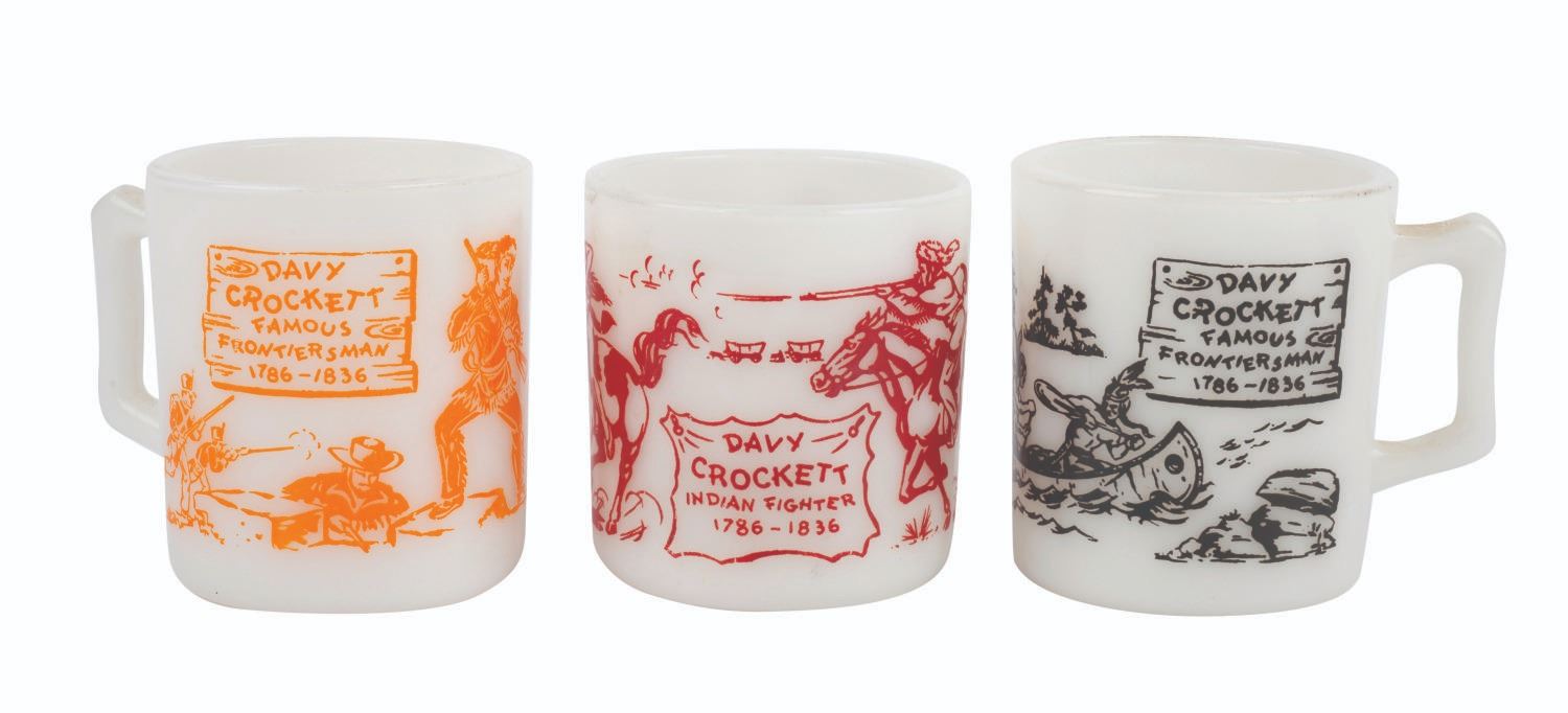 (1950s) A set of three Davy Crockett child-sized mugs. The milk glass mugs depict scenes of Crockett exploring, fighting, and defending the Alamo. Measuring 3" x 3.5" each, the mugs are in very good condition with light wear and discoloration on the interior from age.