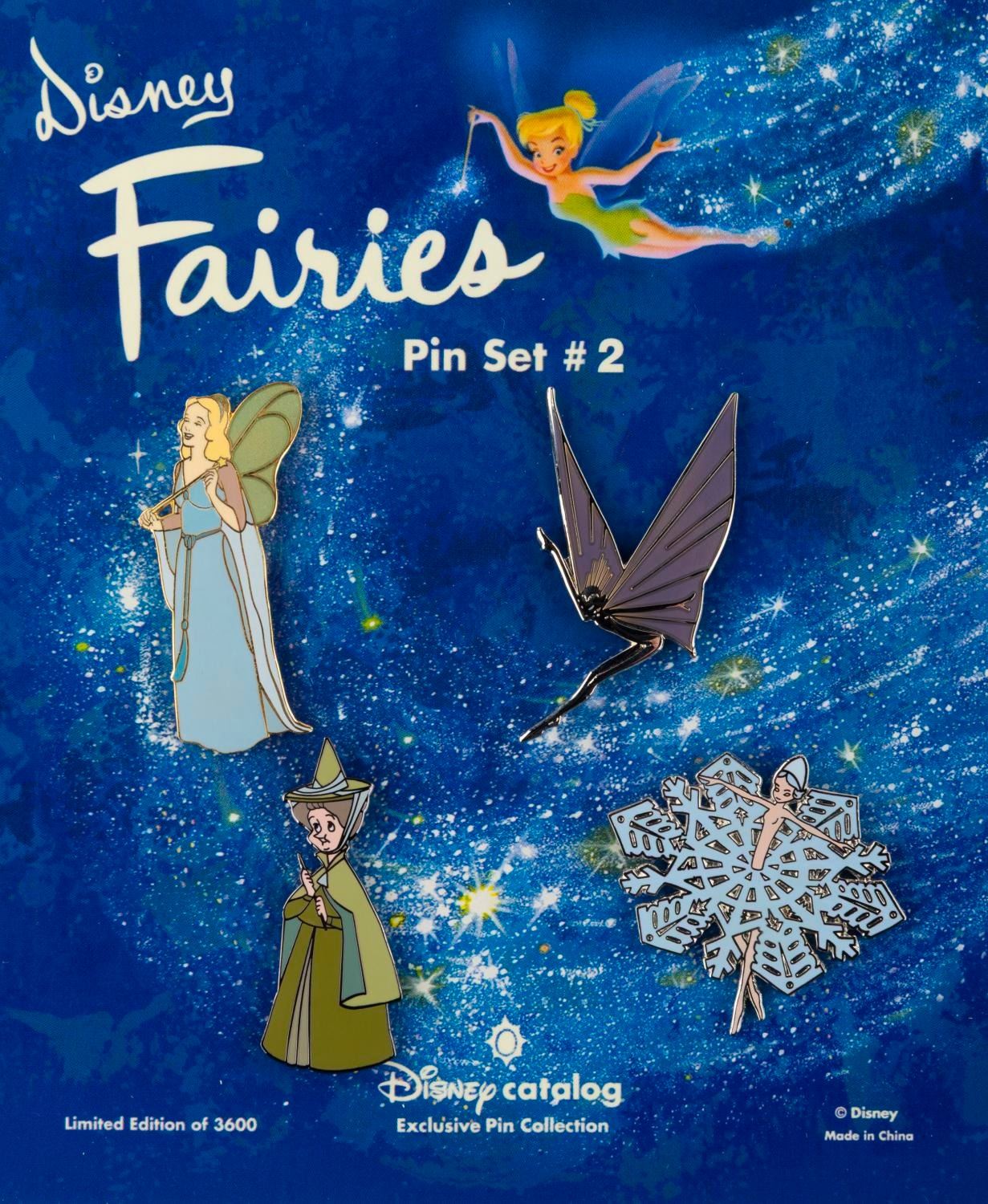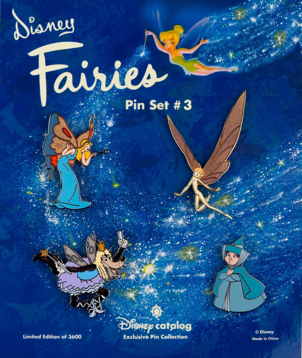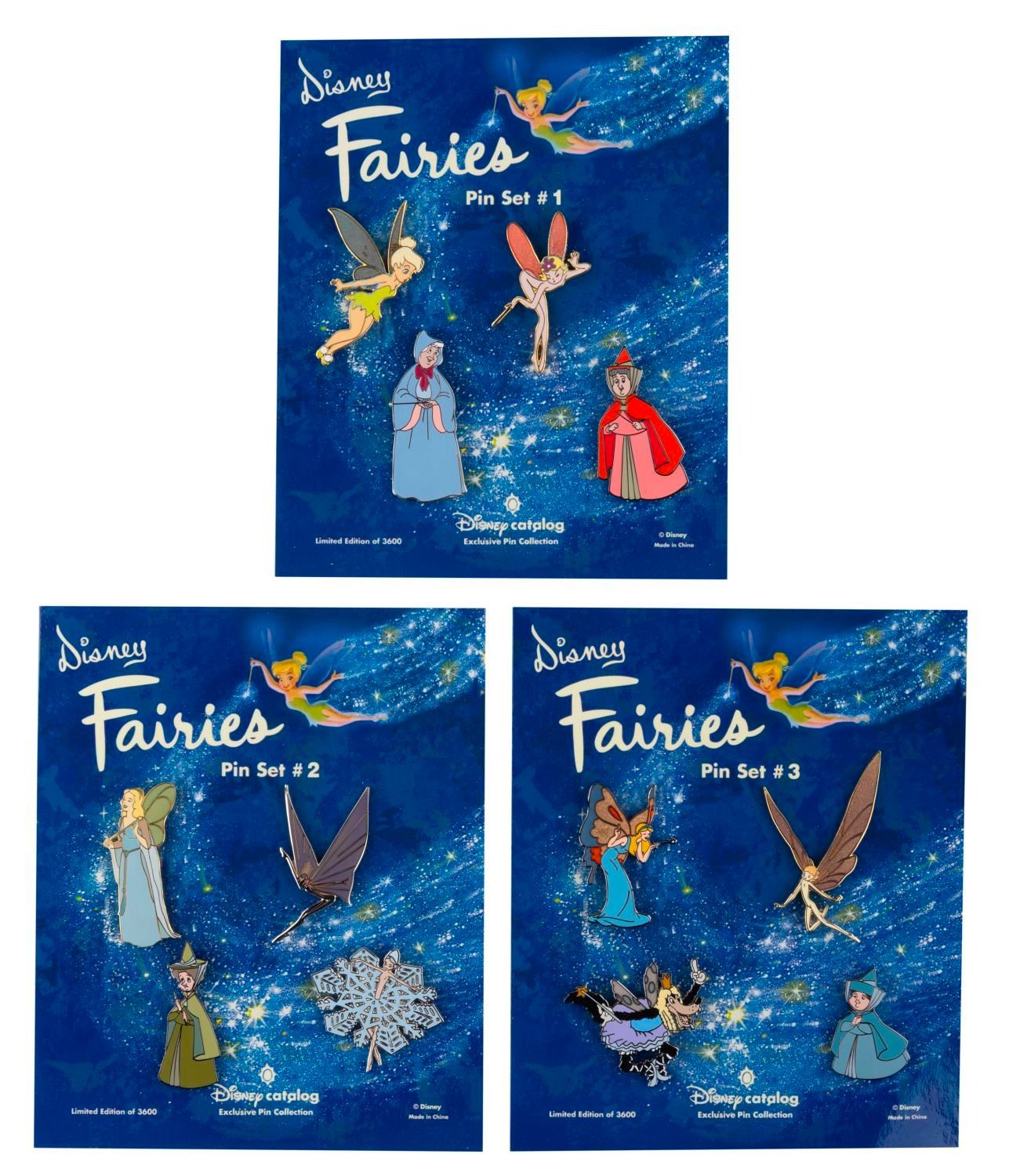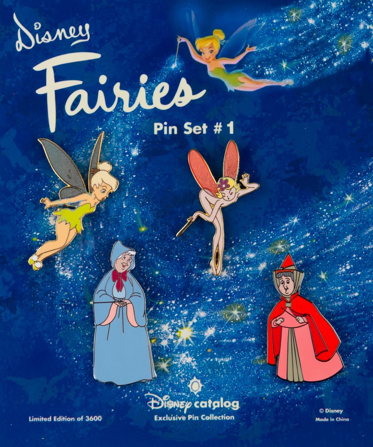 (Disney Catalog, 2002) A set of all three Disney "Fairies" pin sets released by the Disney Catalog in 2002. Each includes four pins of different fairies, including Tinker Bell, a "Fantasia" fairy, Cinderella’s Fairy Godmother, the fairies of "Sleeping Beauty," and more. Each set was released in a limited edition of 3600. The pins are in fine condition on the original cards.