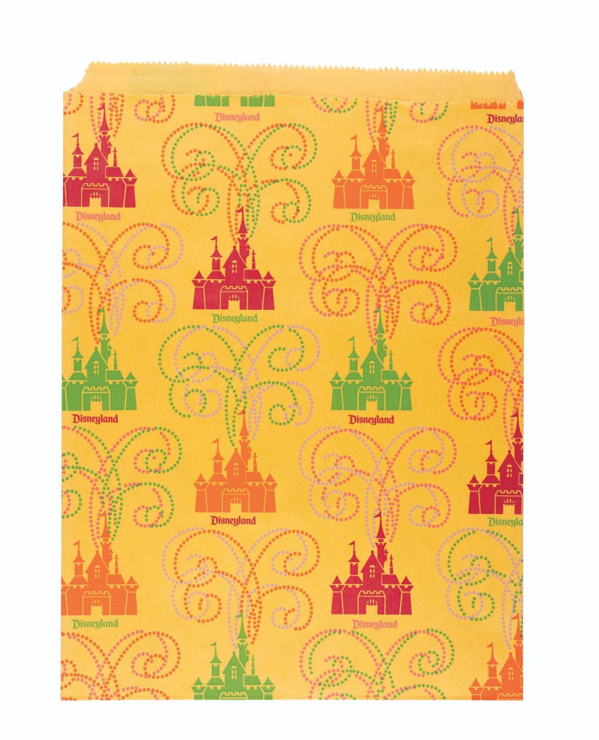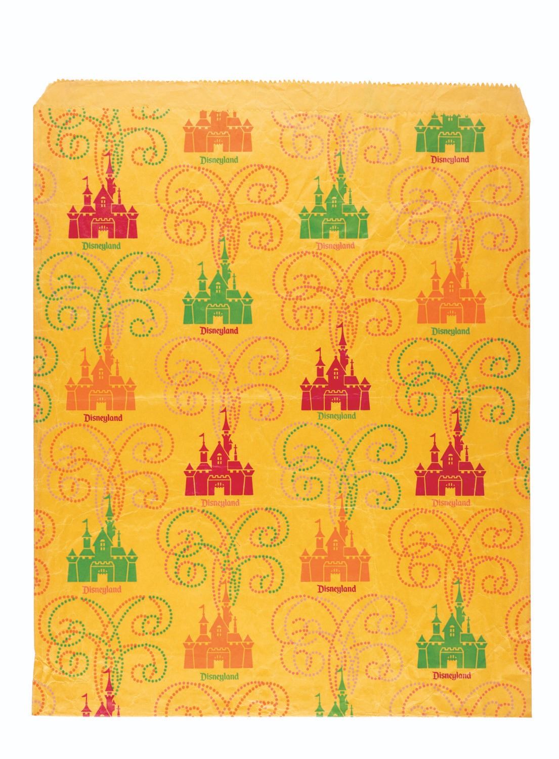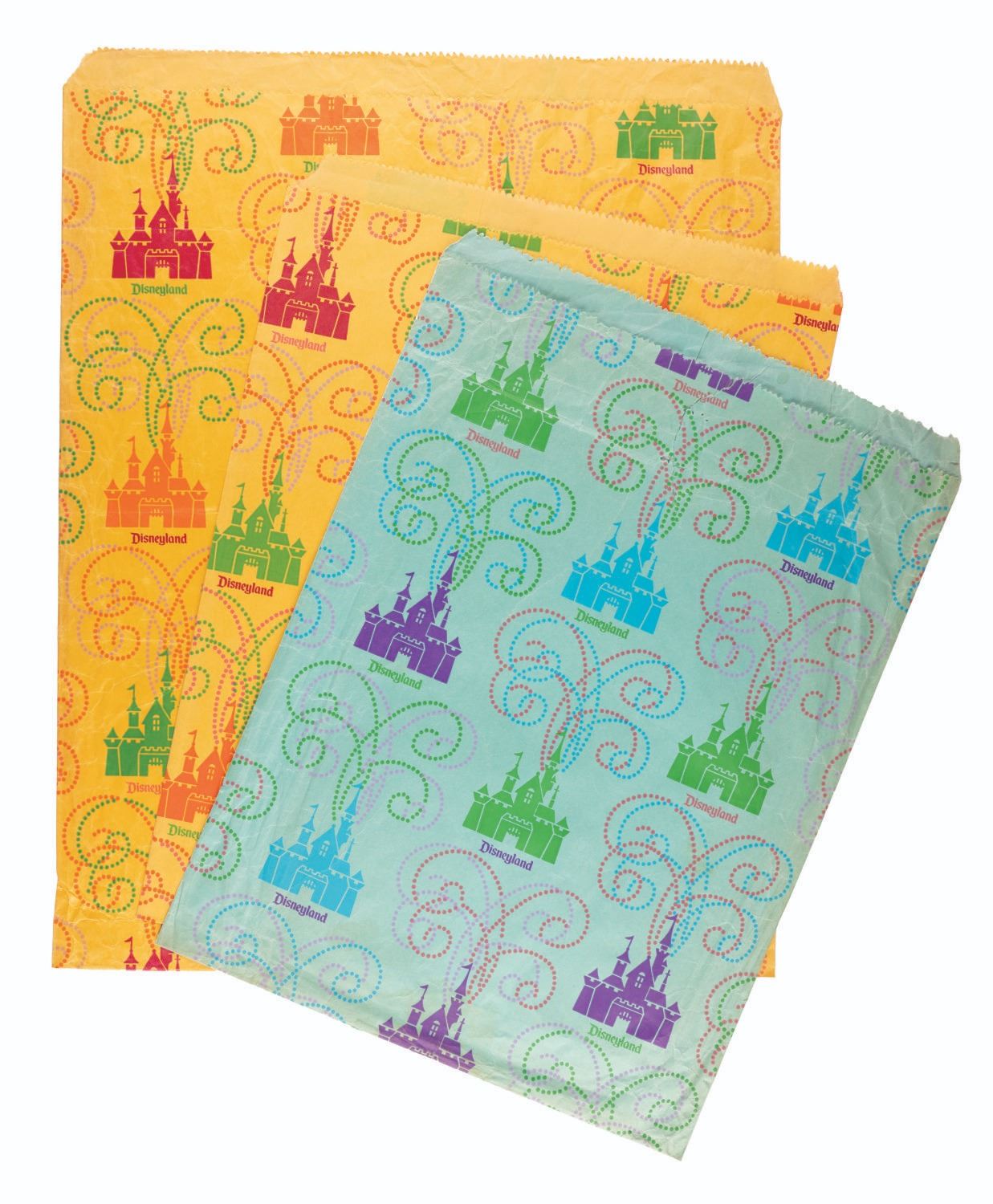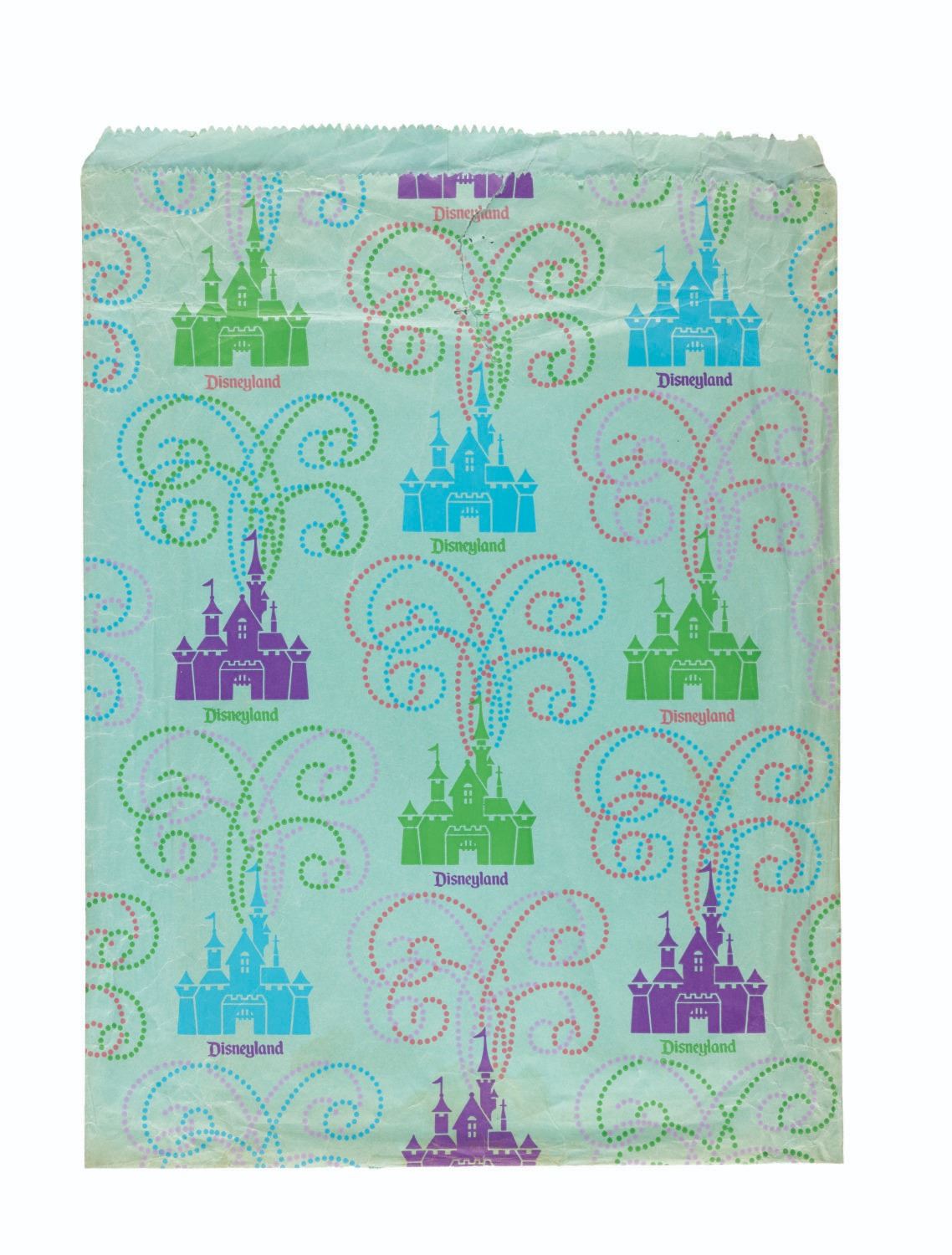 (Disneyland, 1960s-70s) A collection of three colorful paper shopping bags from Disneyland. Two bags measure 11.5” x 15.5”, and one is 14.5” x 18.5”. The bags are in good condition with wear throughout typical of use, and the green bag fair with a 4” tear at the top of on edge.
