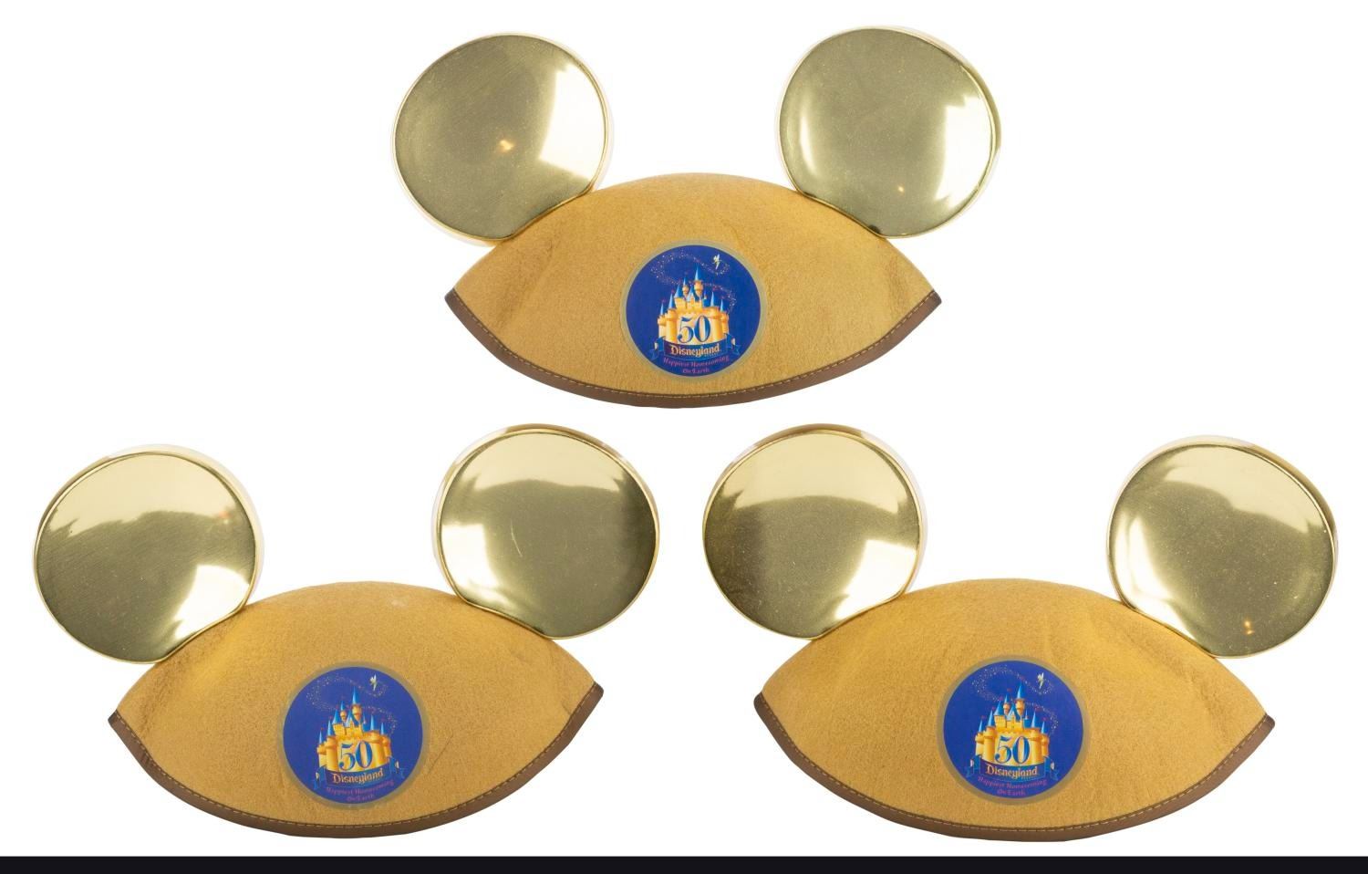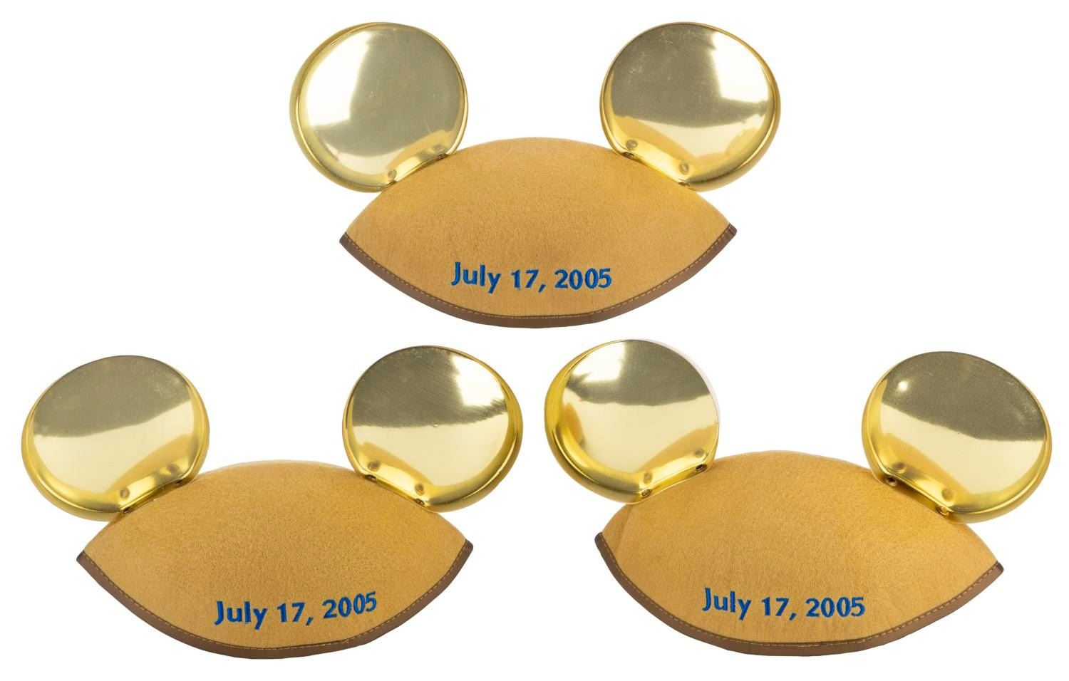 (Disneyland, 2005) Three sets of golden Mickey Mouse ear hats labeled for the “Happiest Homecoming on Earth” and embroidered the date of Disneyland’s 50th Anniversary, July 17th, 2005, on the back. Each labeled a size “Adult,” the ear hats are in very good condition with light handling wear.