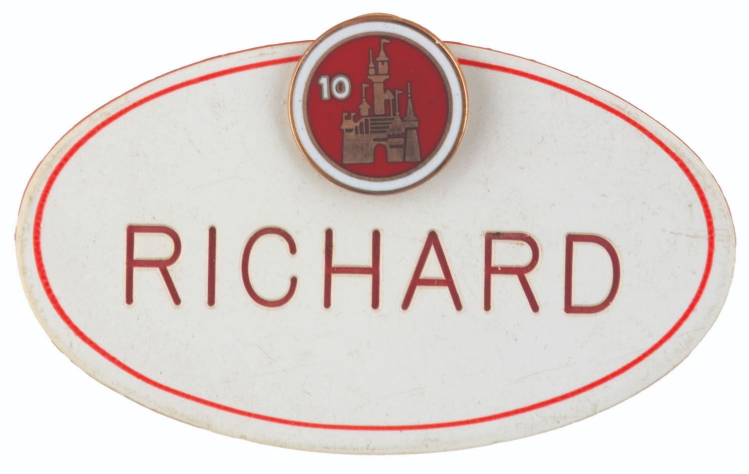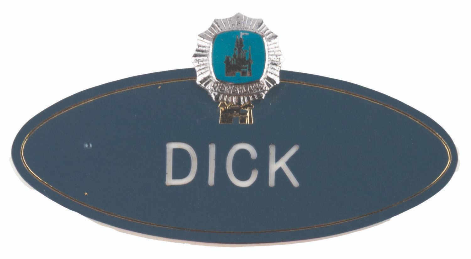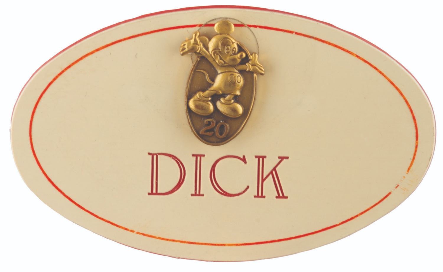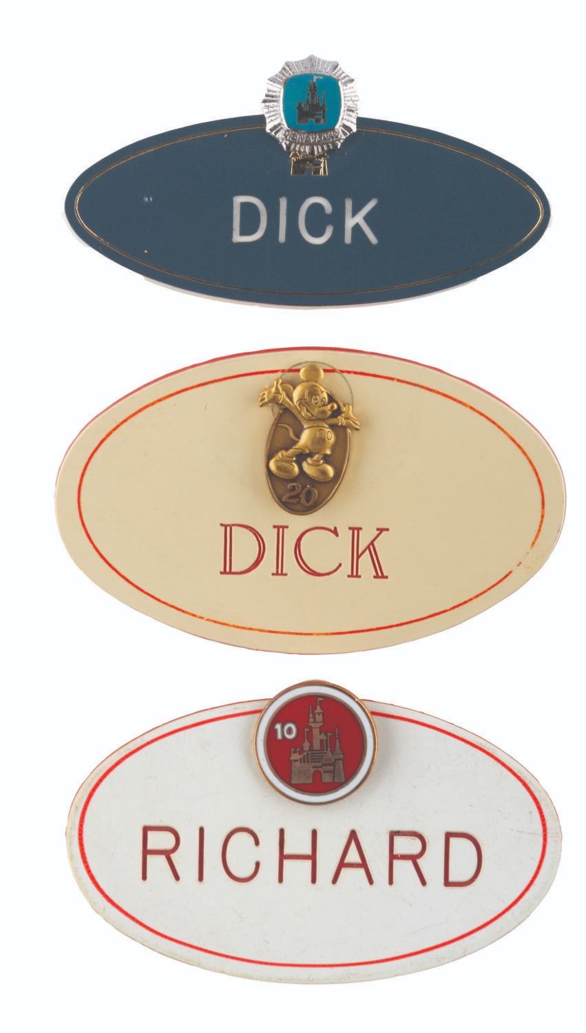 (Disneyland, 1960s-80s) A set of three Disneyland Cast Member name badges for "Dick" or "Richard," with pins chronicling 20 years of service at the Park. The 1960s badge has a 5-year pin, the 70s style a 10-year pin, and the 80s style badge has a 20-year Mickey Mouse service pin. Measuring up to 1.75" x 3", the badges and pins are in very good condition, with very slight wear to the badges typical of Park use.