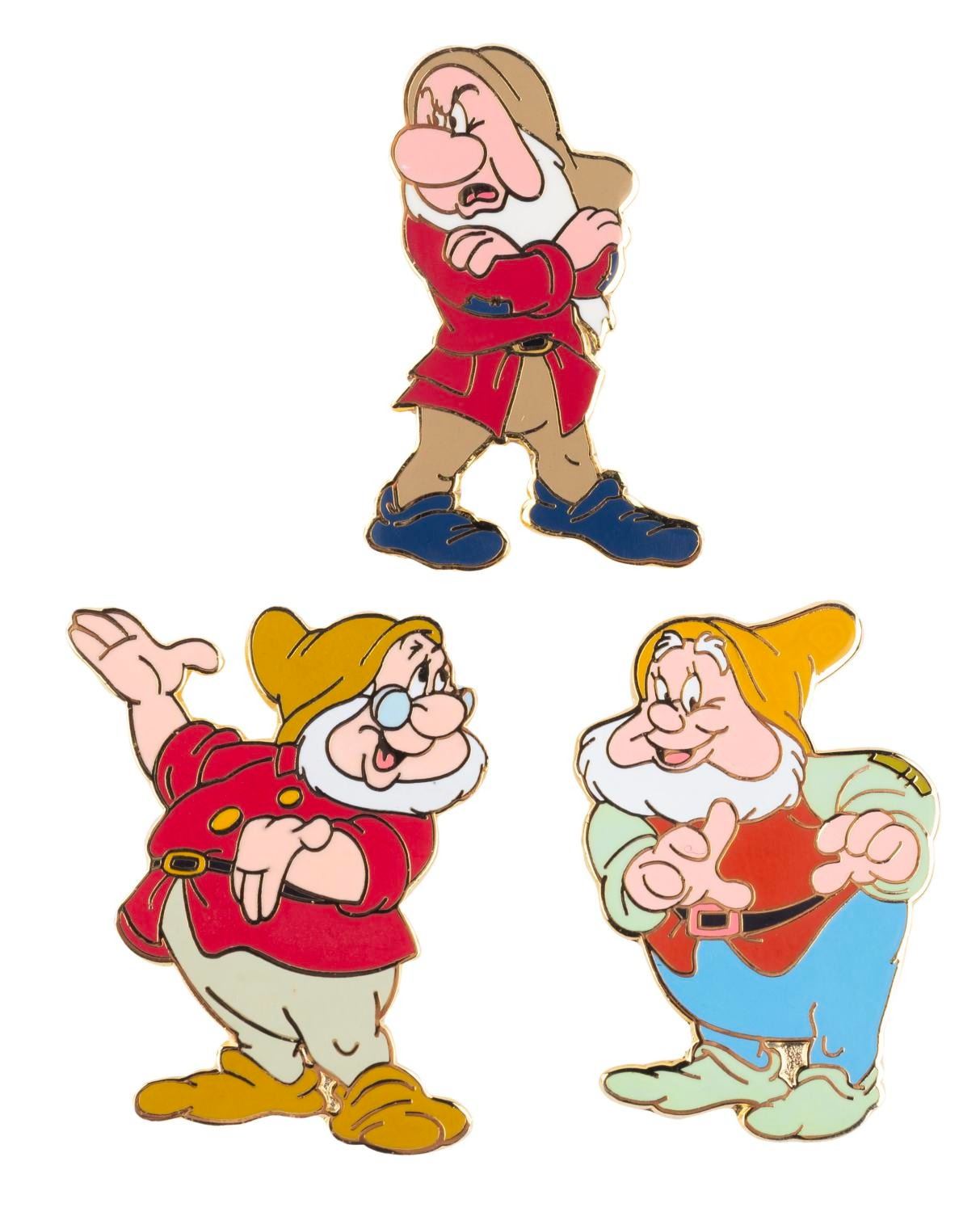 (Disney Parks, 1990s) Three pins from "Snow White and the Seven Dwarfs” incuding Grumpy, Happy, and Doc. The pins are in fine condition.