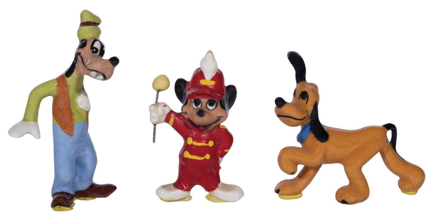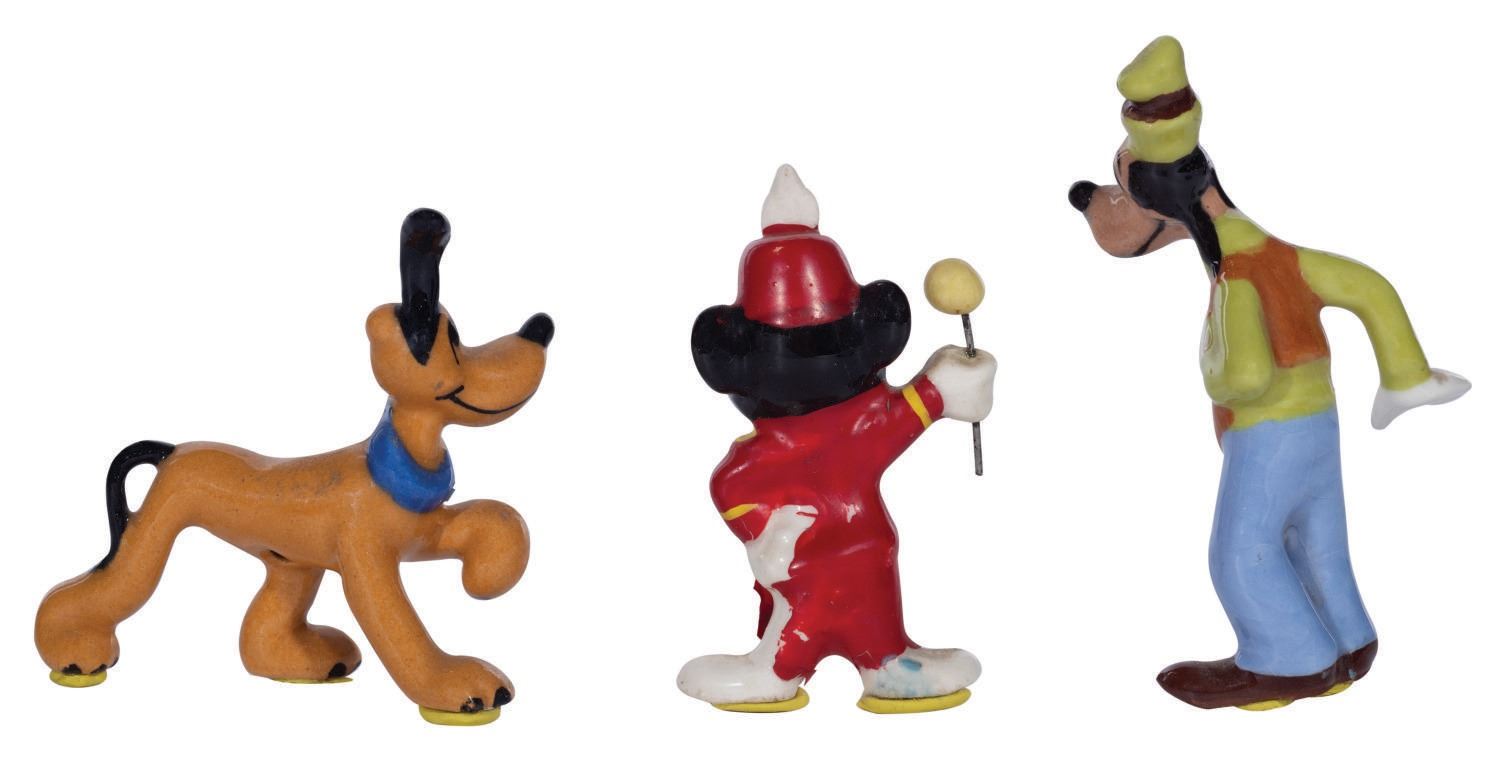 (Hagen-Renaker, 1950s) A collection of (3) hard-to-find painted glazed ceramic figurines by Hagen-Renaker. Included are Goofy, Pluto, and Bandleader Mickey. The pieces all stand between 1.5" and 2" tall. All are in fine condition