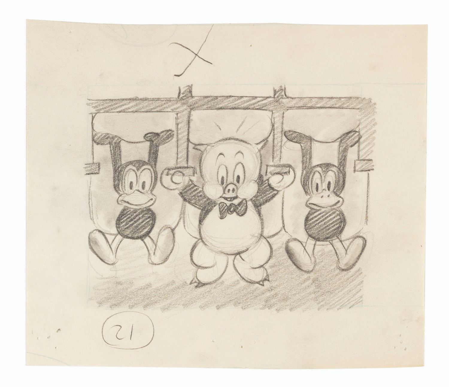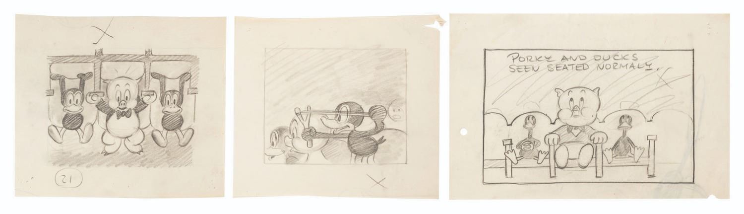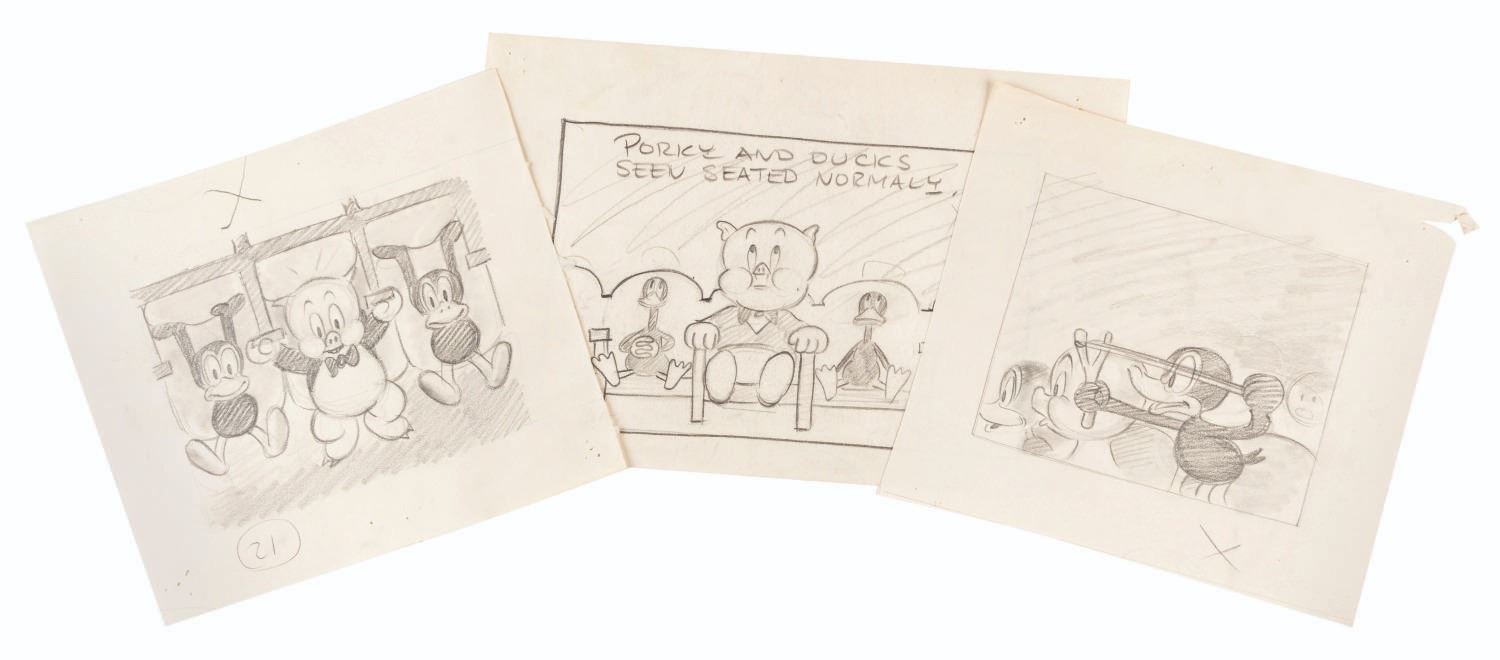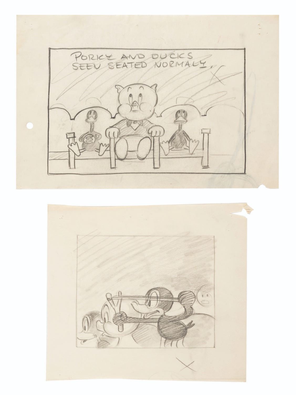 (Schlesinger, 1939) A trio of storyboard panels for the Looney Tunes short “The Film Fan” directed by Tex Avery. The panels feature Porky in the audience between two ducks, with one of a “standing on their heads” gag that was cut from the film. With image sizes from 4” x 5” up to 4.5” x 7” on paper up to 6.25” x 9.5”, the drawings accomplished in graphite are in good production-used condition with pinholes, smudges, and two small tears to corners that do not affect the images.