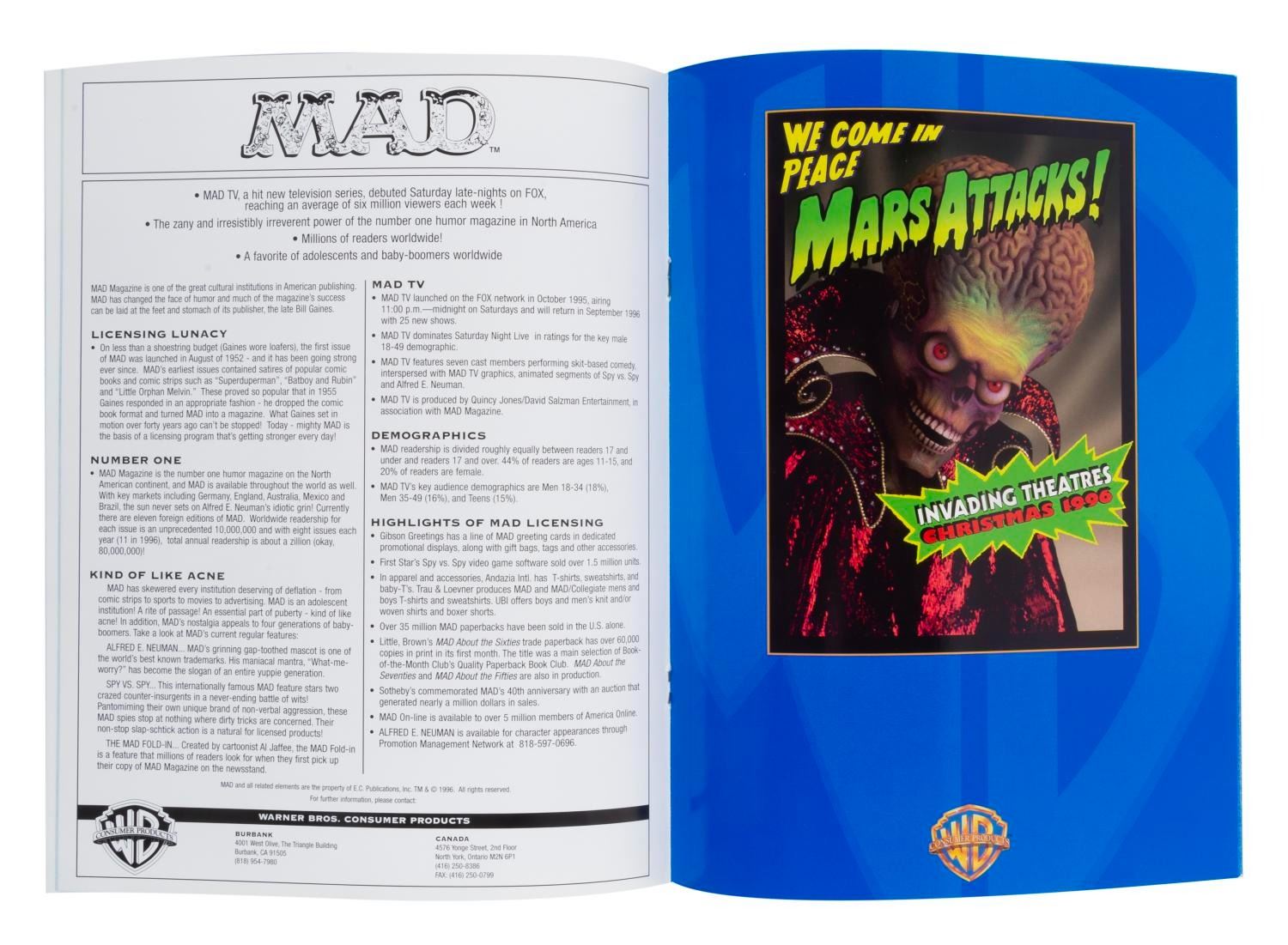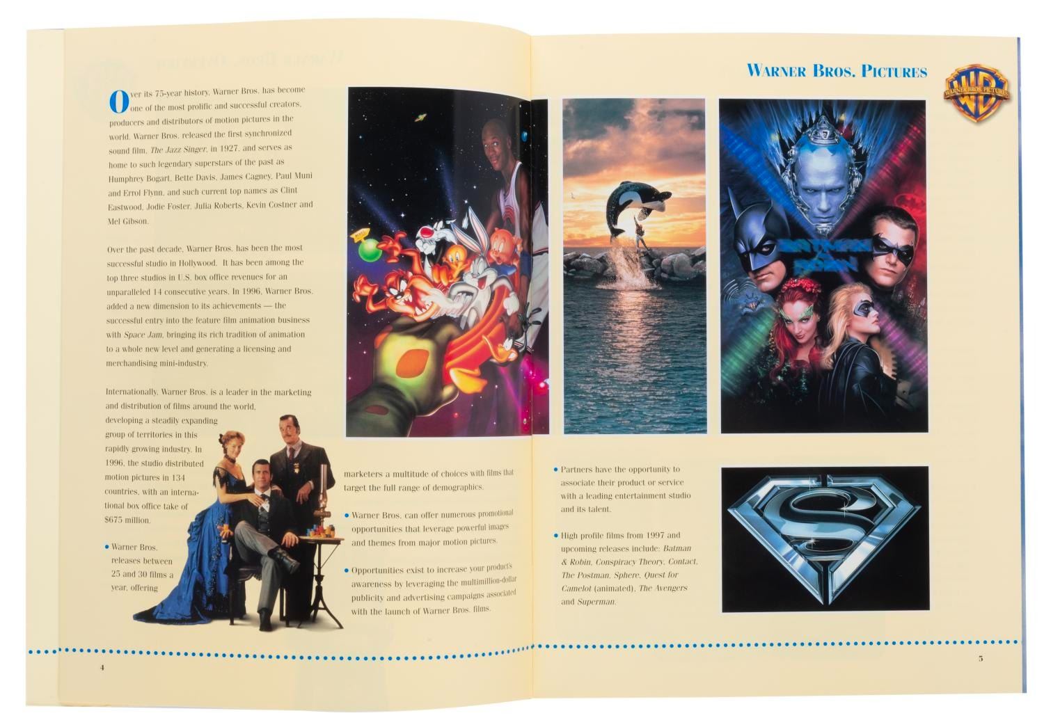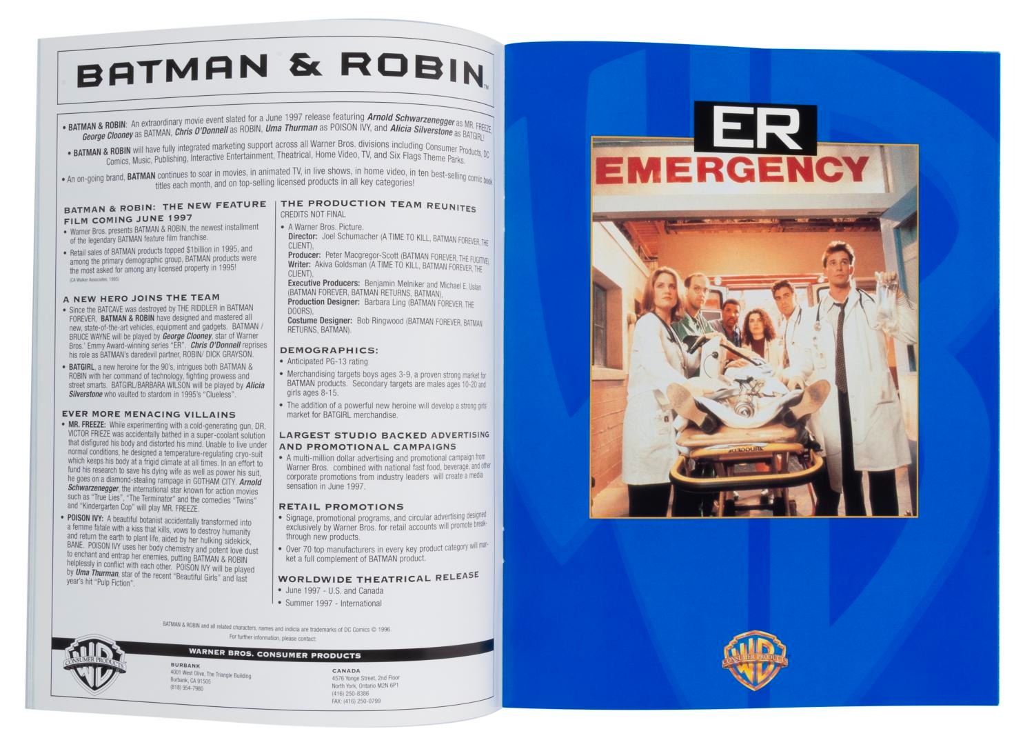 (Warner Bros., 1993-97) A set of three Warner Bros. Consumer Products Press Kits from 1993, 1996, and 1997. Pages inside give overviews on the Studio’s releases at the time, including"Tiny Toon Adventures," Batman movies, and more. The press kits are in good condition with typical wear from handling, mostly to the outer folders.
