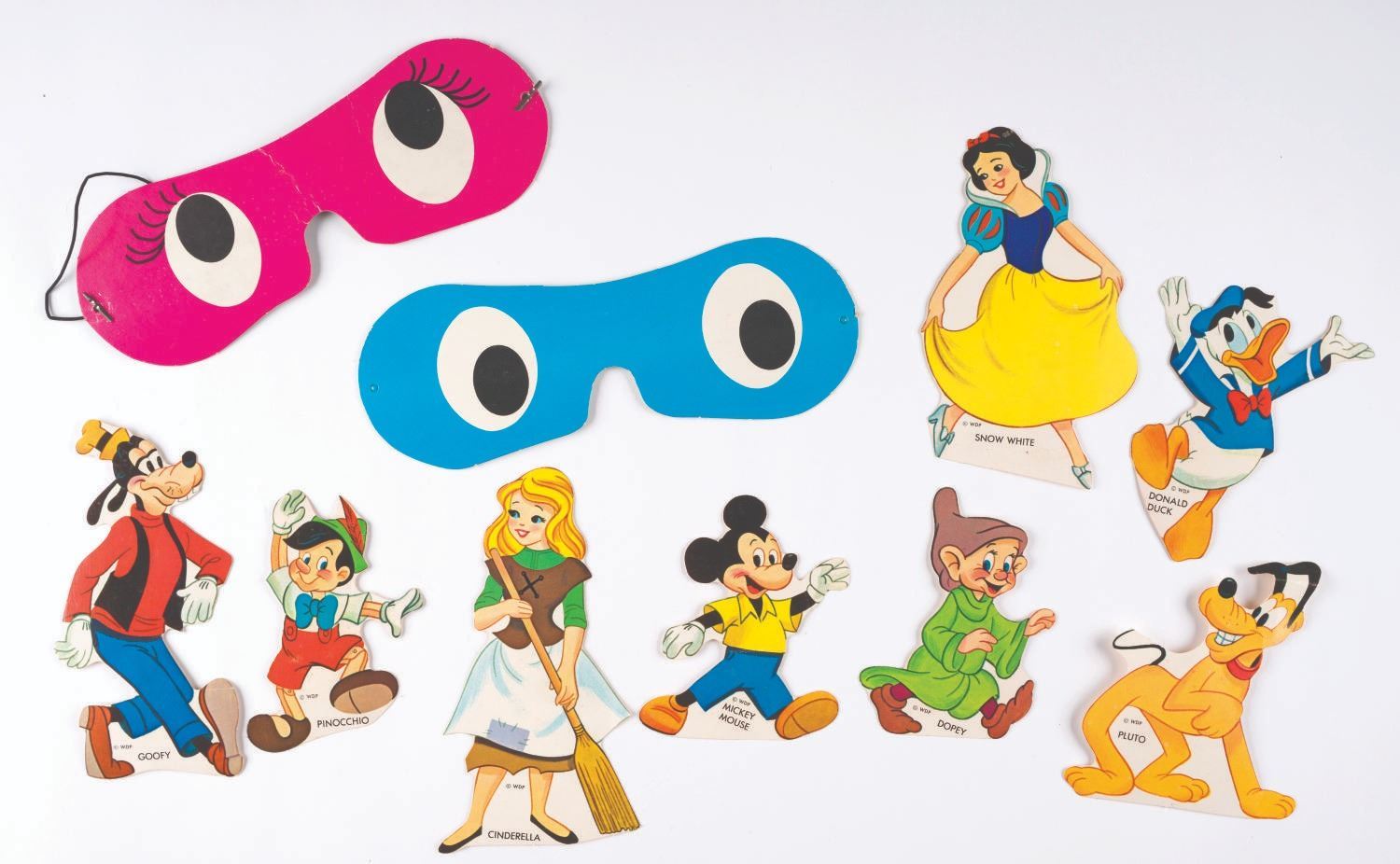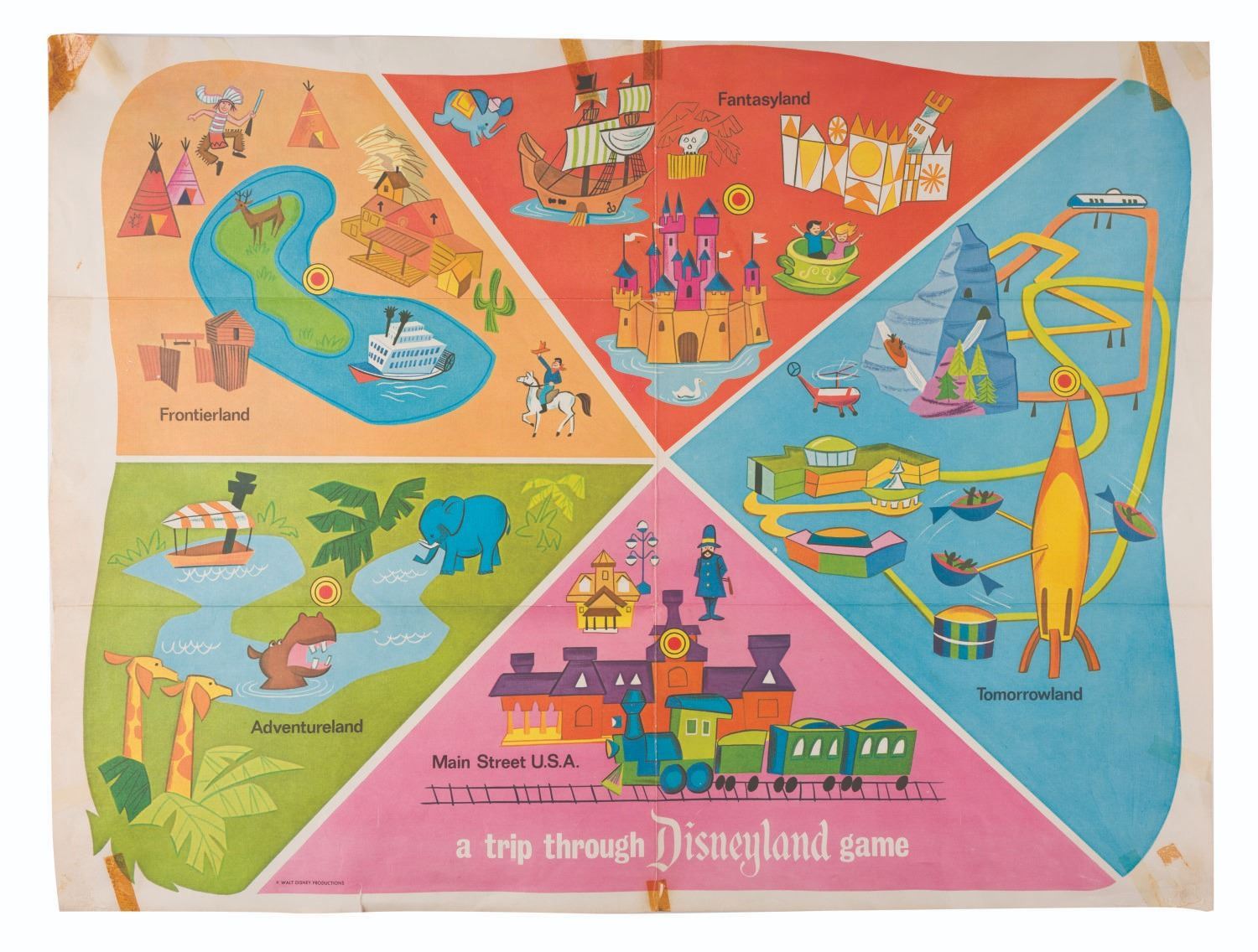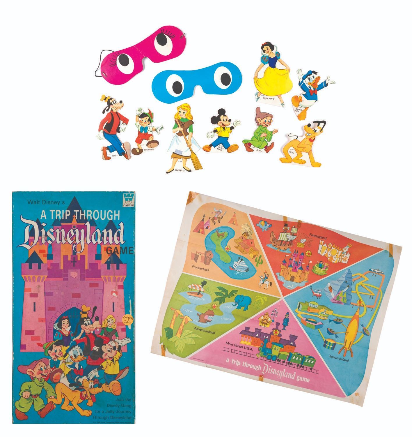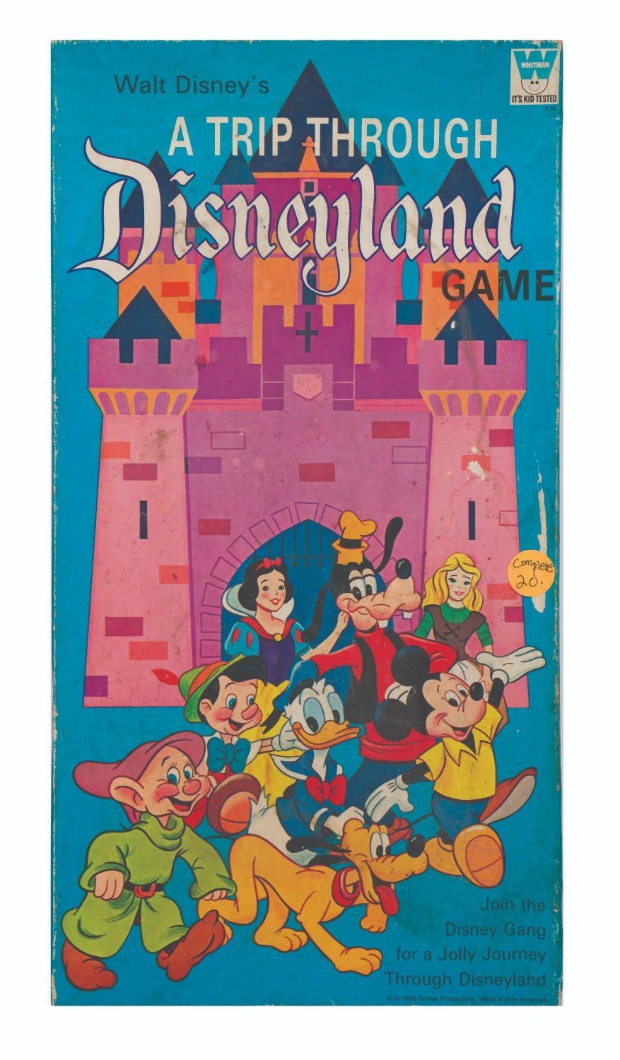 (Disney/Whitman, 1965) A Disneyland-themed "pin the tail on the donkey" game. Blindfolded players pin their Disney character to a game sheet representing the Park. Complete with all pieces in good condition, the sheet is in fair condition with tape marks and residue. The 8.25” x 15.5” box is in fair condition with edge wear, some scuffs, and warping to the front.