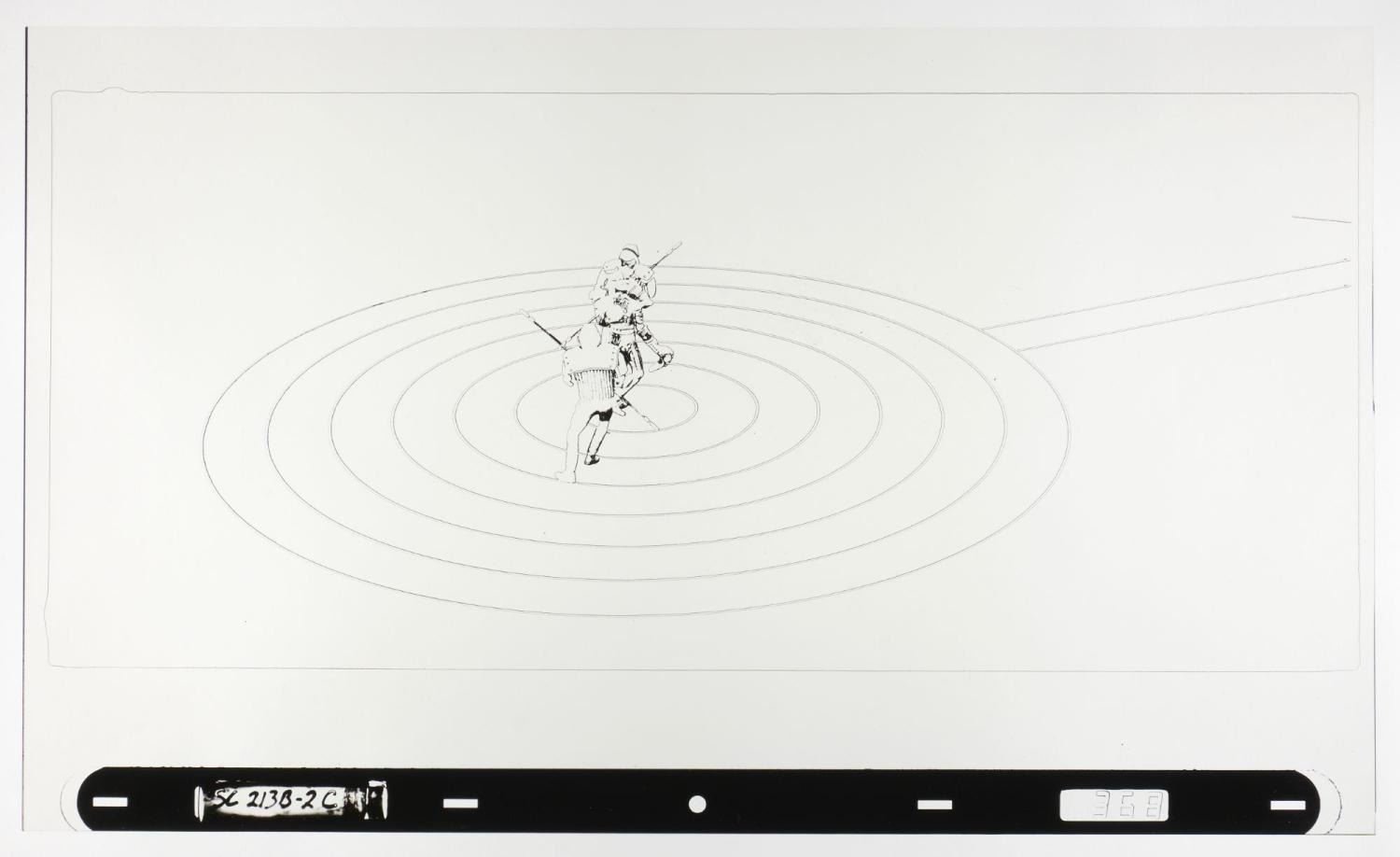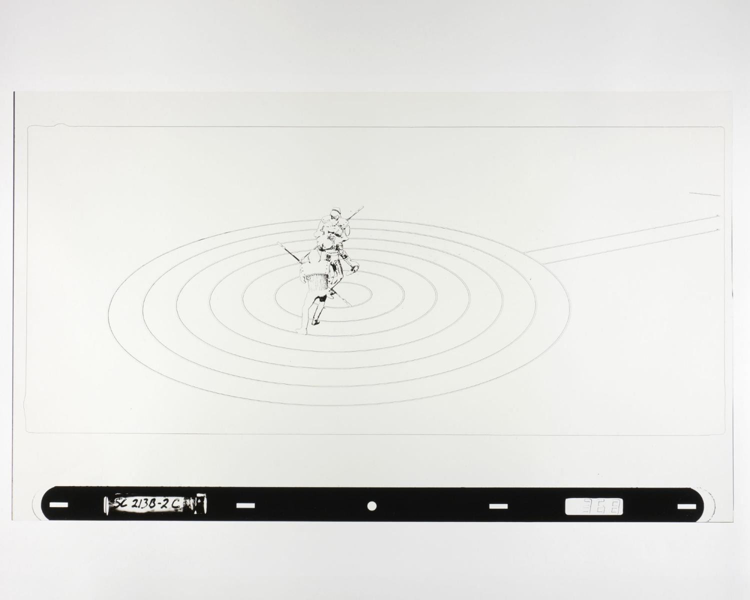 (Disney, 1982) An original Ektachrome continuous-tone transparency cel from "Tron" featuring Flynn and two guards in the ring game. The Ektachrome cel was created at the Studio and used during the production of the special effects sequences in the film. The ground-breaking film predated modern-day computer animation, requiring the unique lighting effects to be hand-created frame by frame. This painstaking process was only used for "Tron," making the film's effects artwork a special piece of Disney and cinema history. Measuring 12.5" x 20" with an image size of 5.5" x 17". The transparency cel is in very good condition with some light scratches and wear typical of production use.