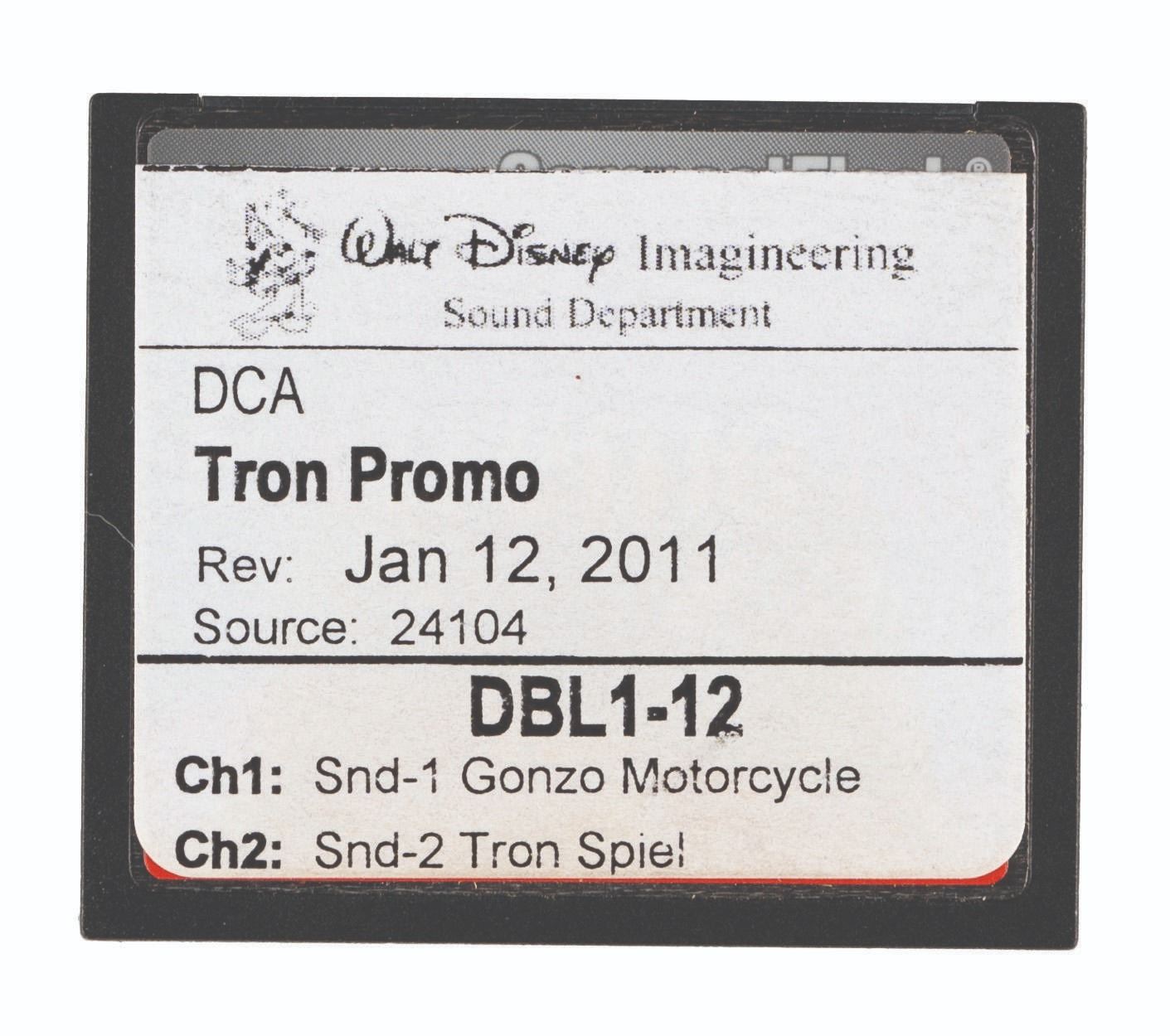 (Disney California Adventure, 2011) A Walt Disney Imagineering Sound Department SD memory card containing promotional material for the Tron franchise. Tron-related events in the Park at the time included the ElecTRONica nighttime street party, a “Tron: Legacy” preview in the Muppet*Vision 3D theater, and a World of Color finale segment themed to “Tron: Legacy.” The label reads that the card has audio channels for “Gonzo Motorcycle” and “Tron Spiel.” Measuring 1.5” x 1.75” in a 1.75” x 2.25” plastic case, the untested SD card displays in very good condition with light wear.