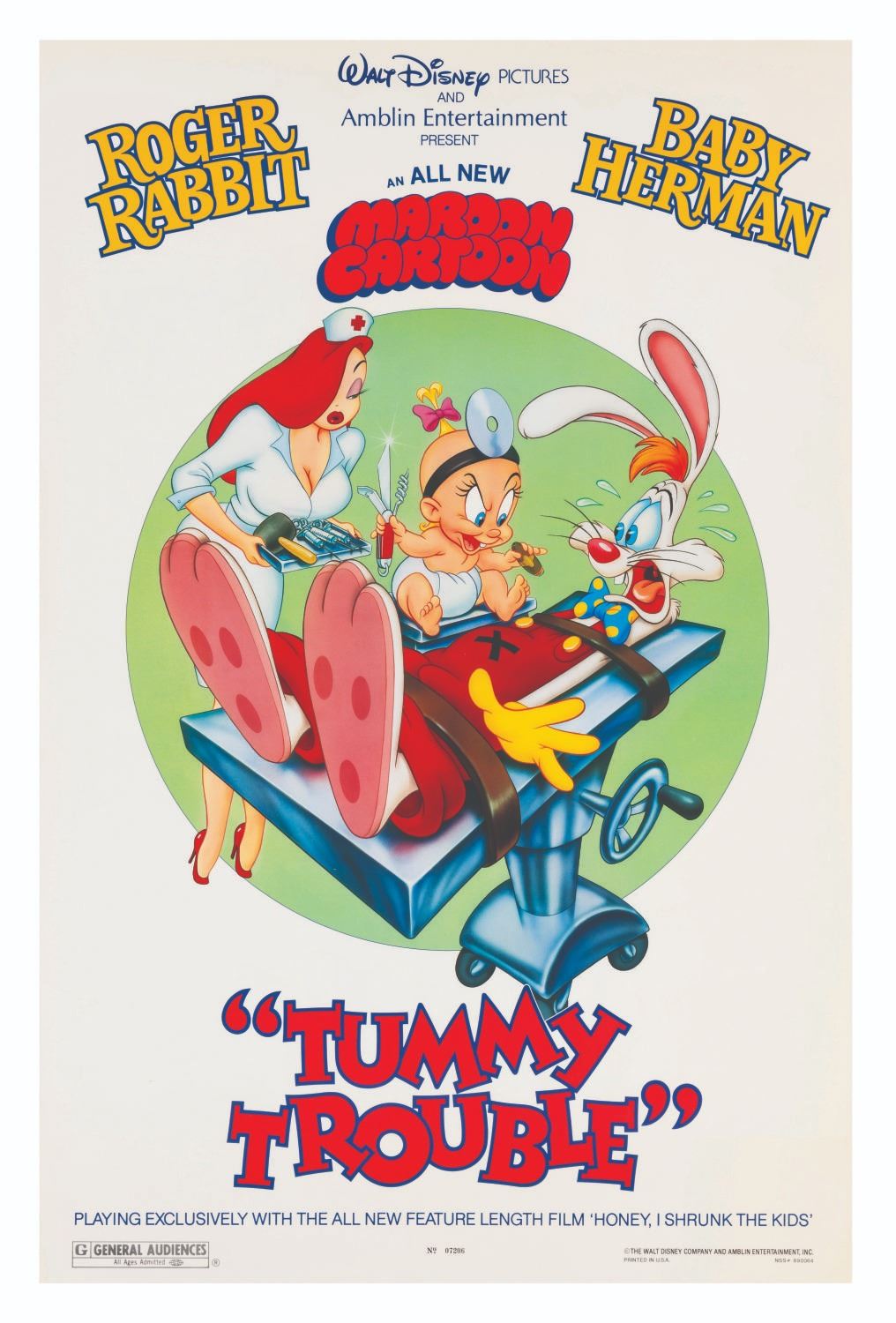 (Disney, 1989) A one-sheet poster for the short film "Tummy Trouble" starring Roger Rabbit and Baby Herman. Measuring 27" x 41", the poster is in very good condition with areas of minor creasing along the edges.