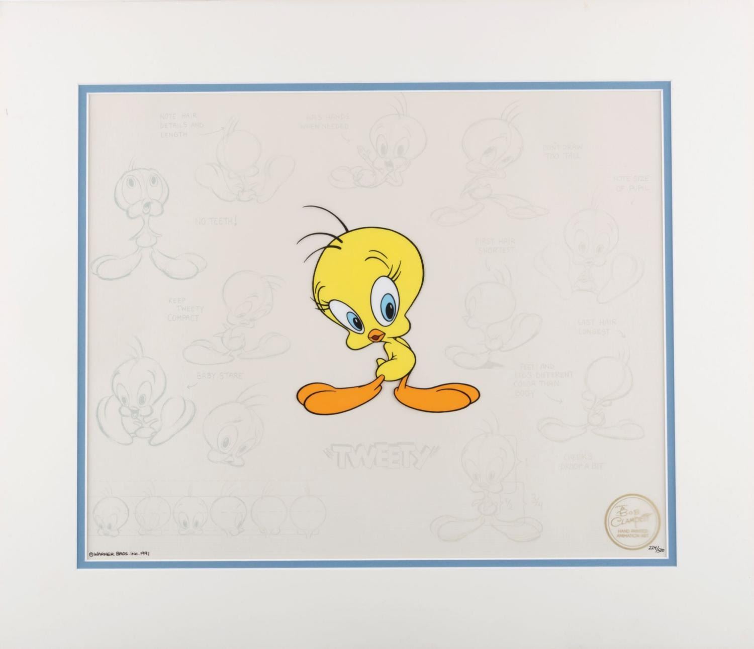 (Warner Bros./Bob Clampett Productions, 1991) A hand-painted limited edition cel of Tweety Bird based on an original Bob Clampett drawing, with a printed model sheet background. Numbered 224 out of 500, the piece has an image size of 5.5” x 5.75” in an 18” x 21” matted display and is in very good condition with light wear.