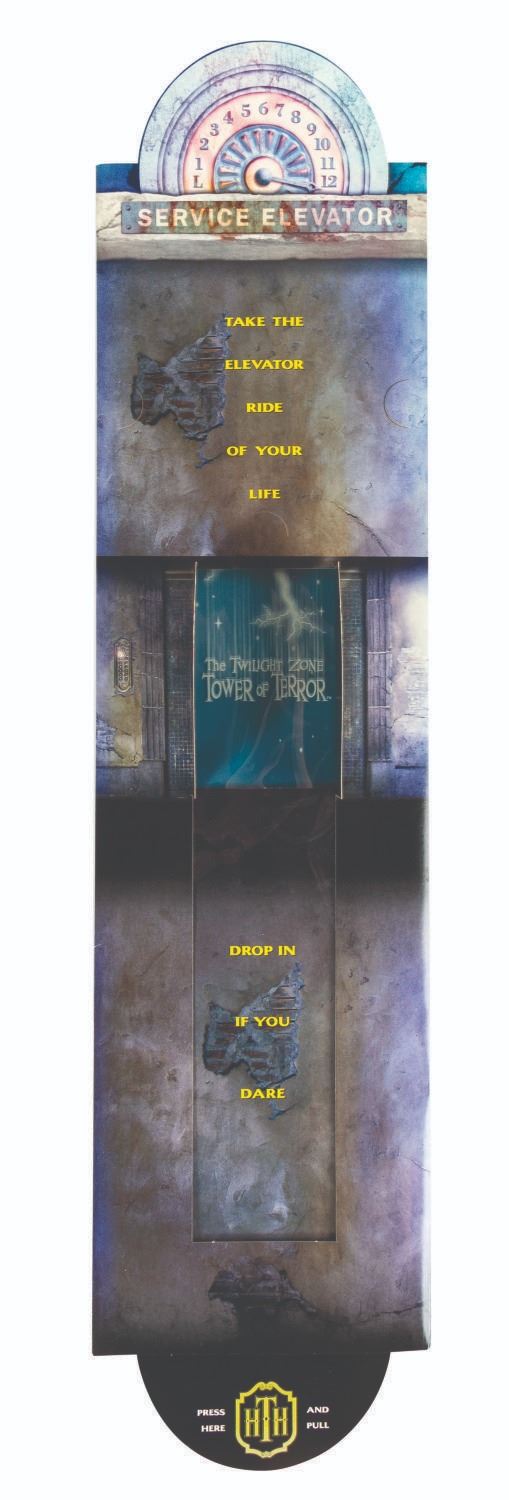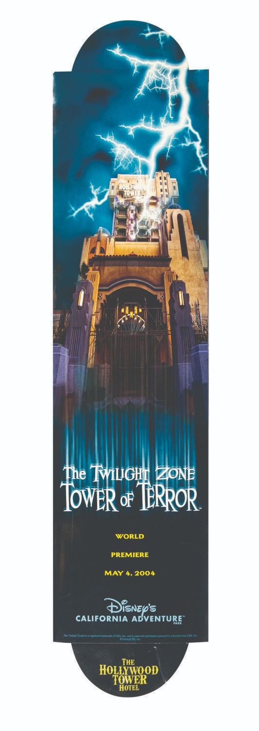 (Disney’s California Adventure, 2004) An invitation sent to press and VIPs in advance of the grand opening of The Twilight Zone Tower of Terror. Shaped like an elevator shaft, the cardboard invitation features a drop-down window and an audio element that played the eerie prelude to the thrill ride (no longer functioning). Measuring 21" x 5", the invitation is in very good condition with minor edge wear.