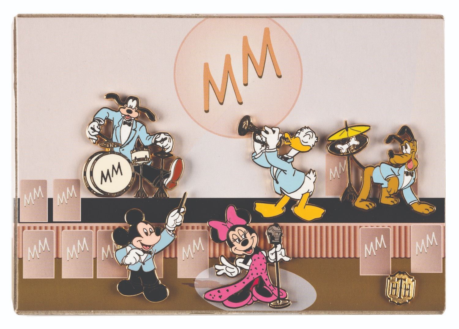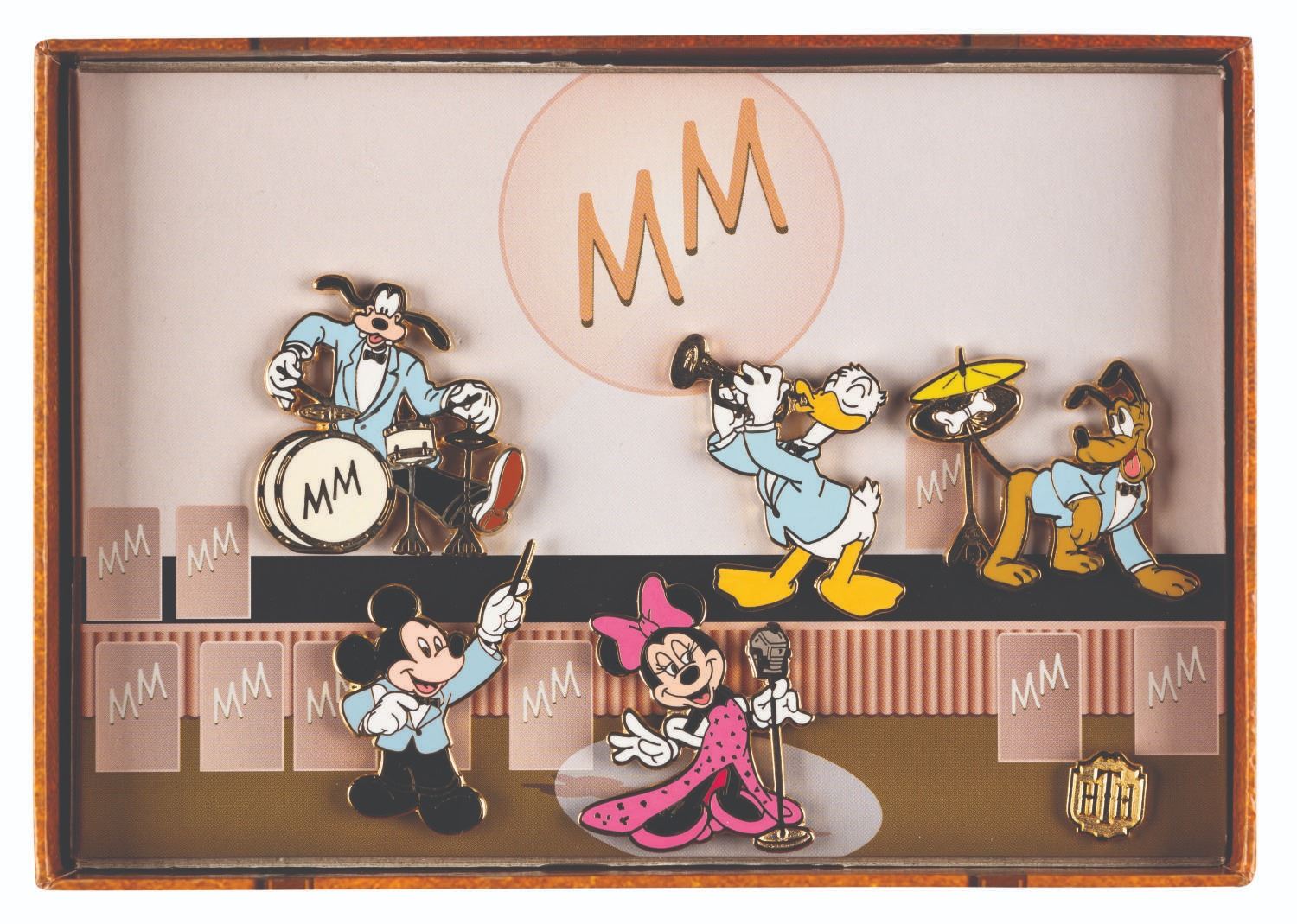 (Disney’s California Adventure, 2004) A Twilight Zone Tower of Terror limited edition 500 six-piece pin set featuring Mickey and Friends performing at the Hollywood Tower Hotel, with a mini pin of the attraction's logo. The pins measure up to 1.5" x 1.5" and are in fine condition. The 4.5" x 6.5" x 1" box is designed to appear as a traveling suitcase and is in very good condition, with light handling wear mainly to the bottom.