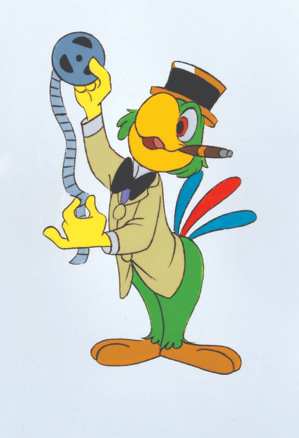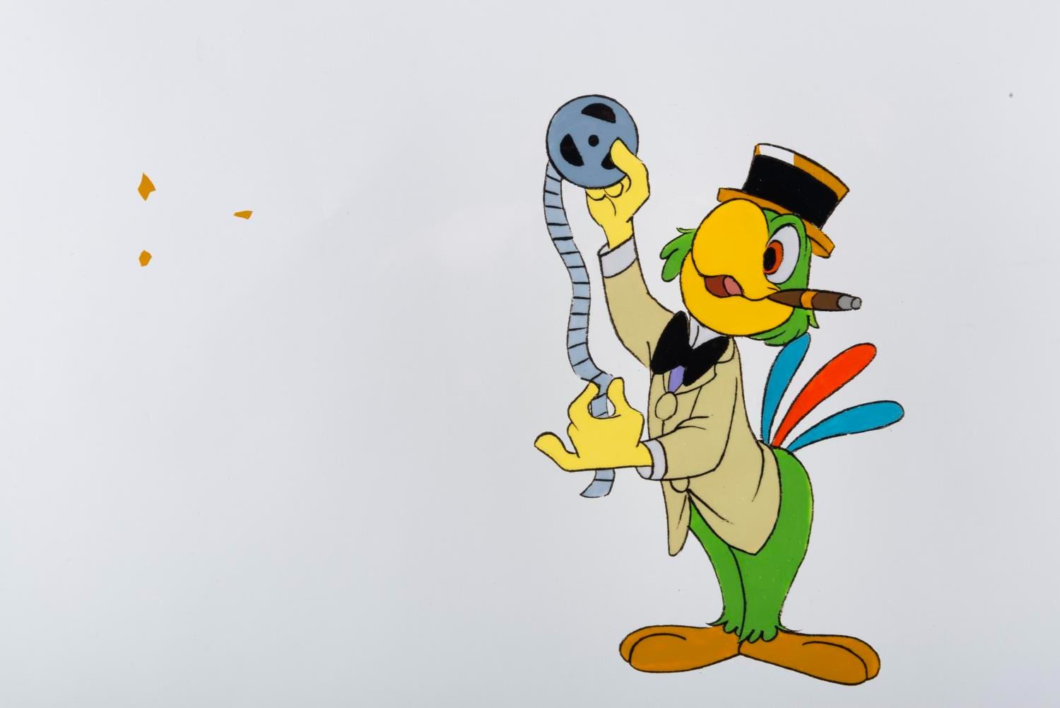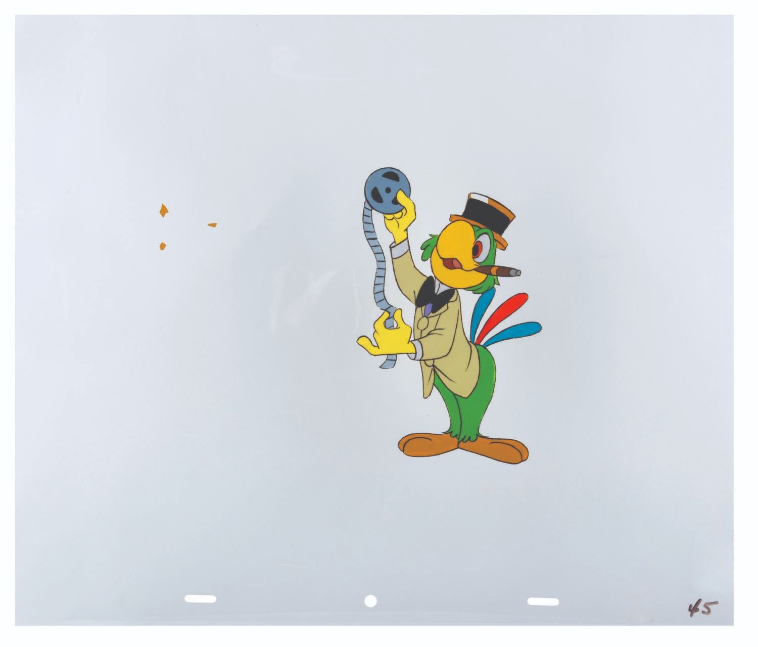 (Disney, 1960) An original production cel of Jose Carioca from the "Walt Disney Presents” episode "Two Happy Amigos,” which aired February 5, 1960. Jose has an image size of 4” x 6” on a 12.5” x 15” cel. The piece is in good condition with light scratches, line loss, wear from production use, and paint loss, particularly to the hat.