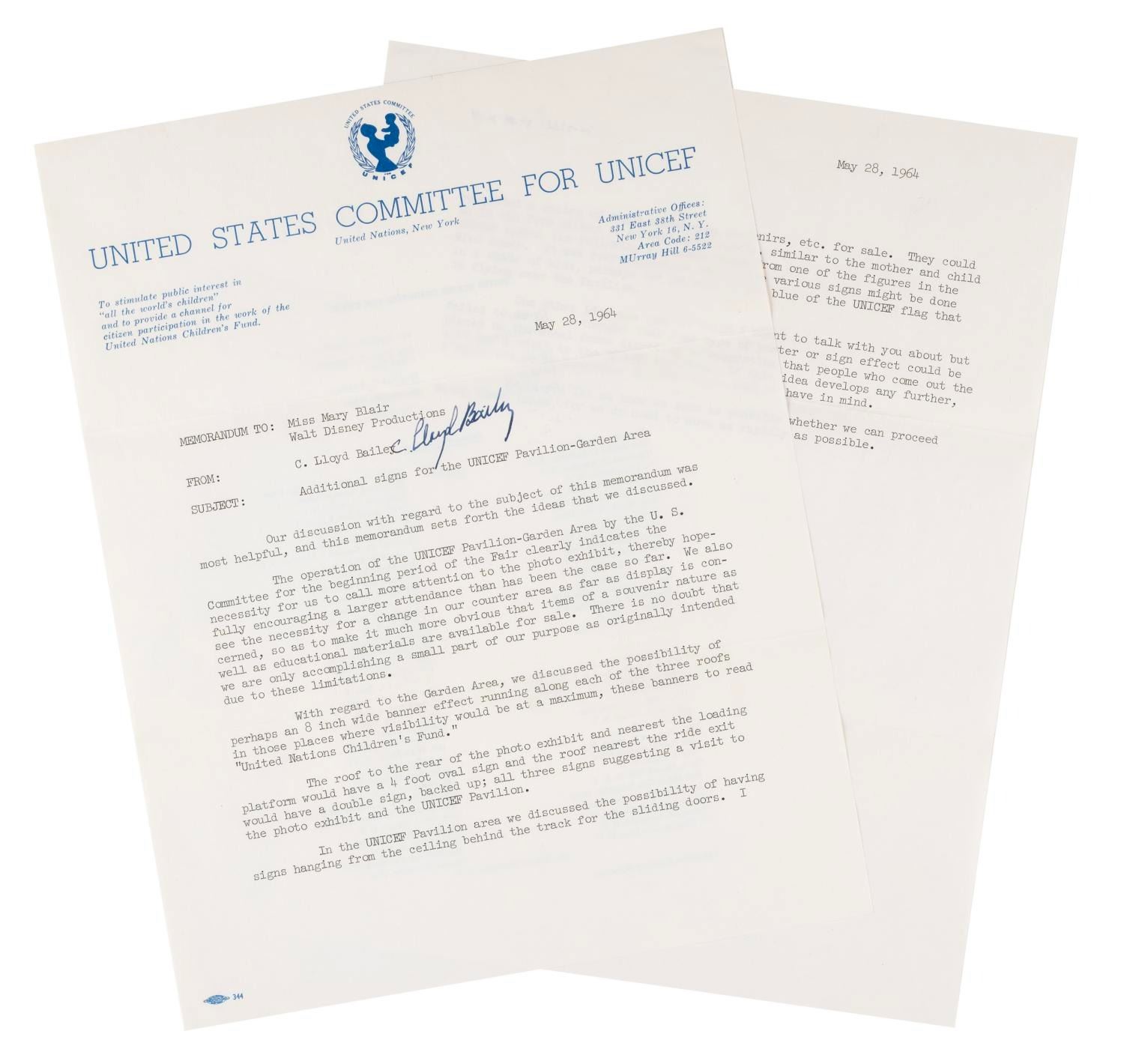 (UNICEF, 1964) A May 28, 1964 memorandum from UNICEF’s C. Lloyd Bailey to Mary Blair. The memorandum, signed by Bailey, concerns the UNICEF pavilion that housed It’s a Small World at the 1964 World’s Fair. Blair was a major part of the attraction’s development and success, with her color scheme and distinctive style being replicated in Parks around the world. Measuring 8.5” x 11, the two-page memorandum displays in very good condition with light discoloration from age, creases, wear, and intentional folds from mailing.
