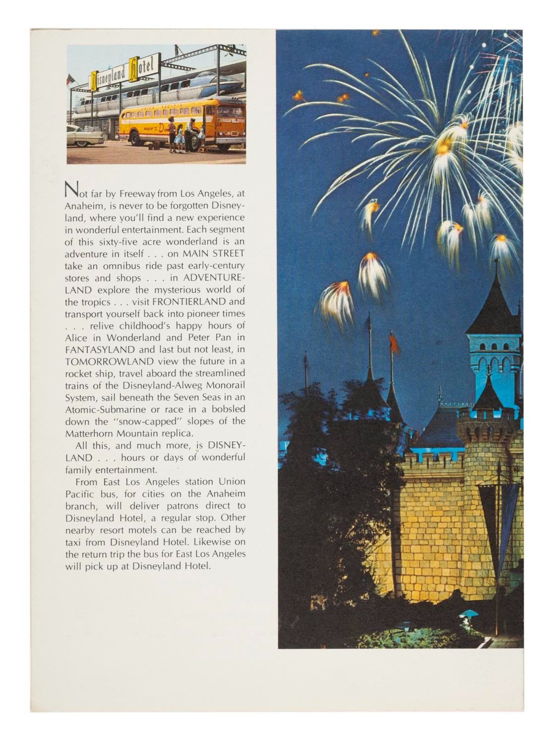 (Disneyland, 1970s) An early 1970s Union Pacific Domeliner Restaurant menu promoting Walt Disney's Disneyland and the Disneyland Hotel. Measuring 7" x 9.5", the menu is in very good condition with light wear.