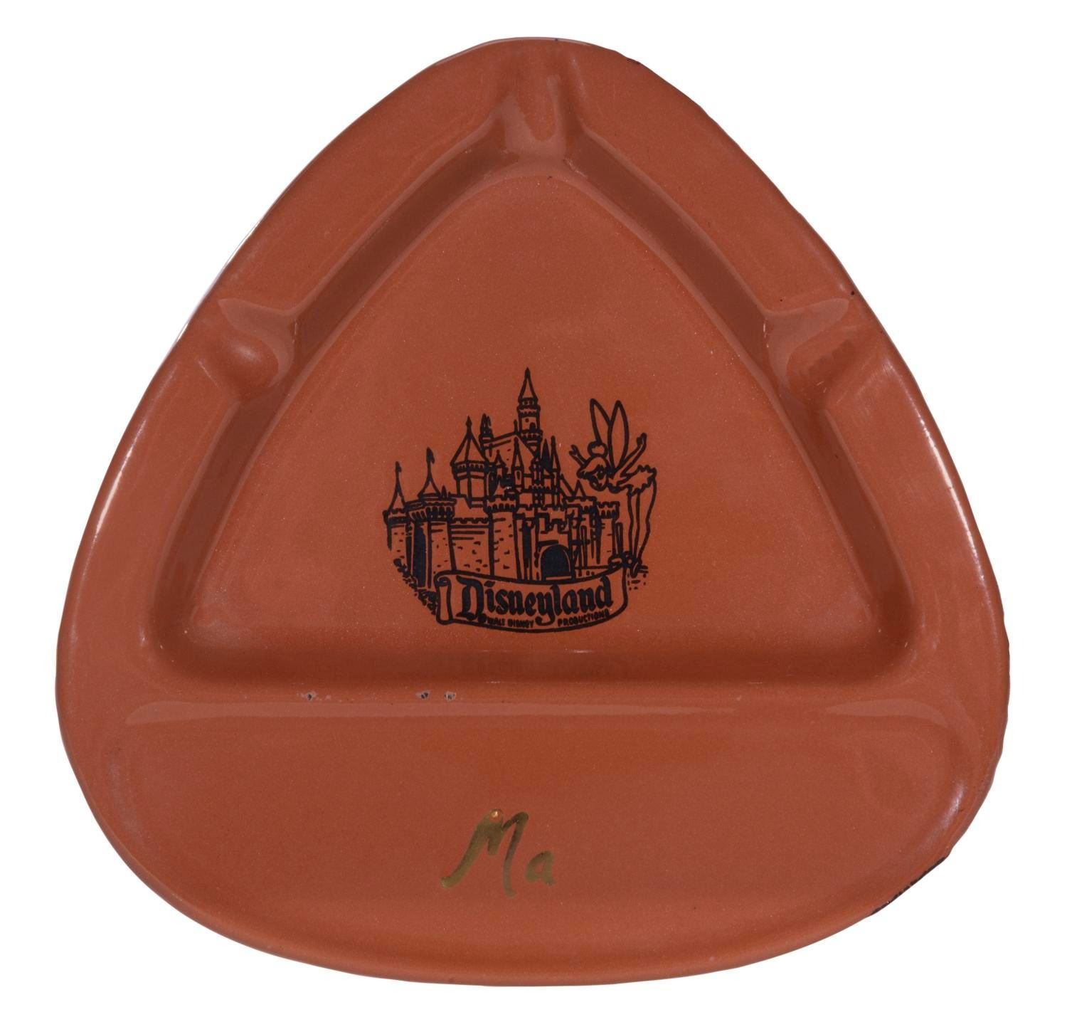 (Disneyland, 1950s) A rare, early souvenir ashtray from Disneyland featuring Tinker Bell and Sleeping Beauty Castle. This piece is personalized with "Ma." Measuring 5" in diameter, the ashtray is in very good condition with light wear.